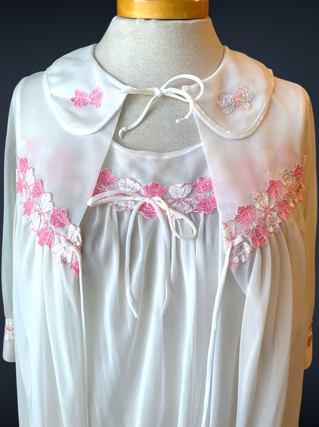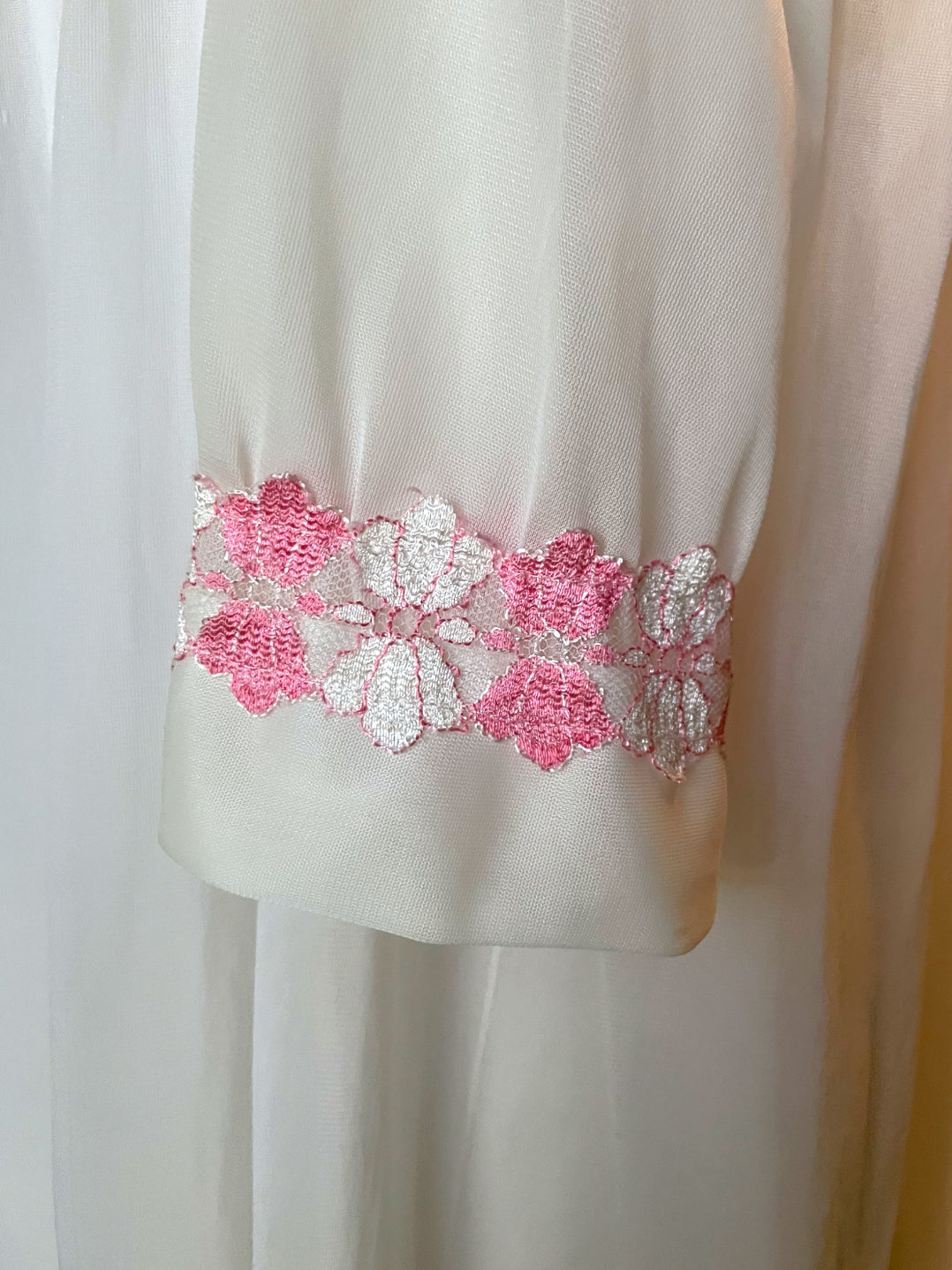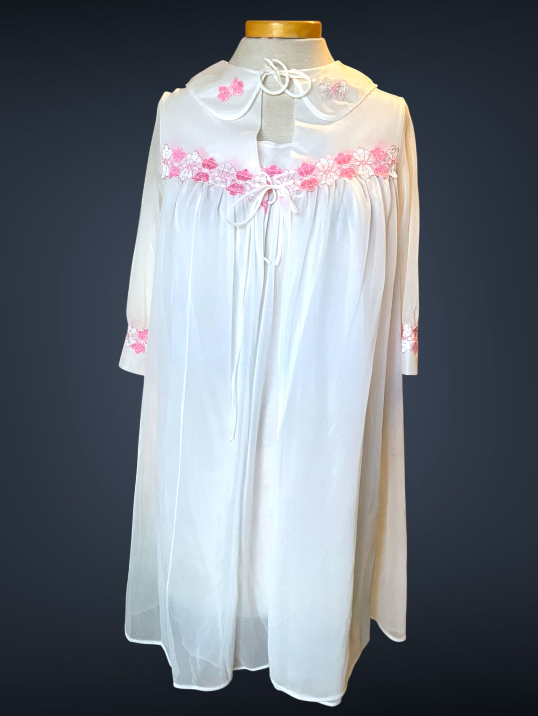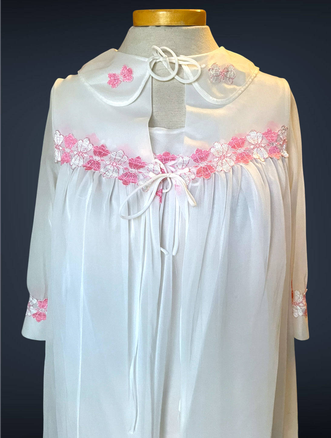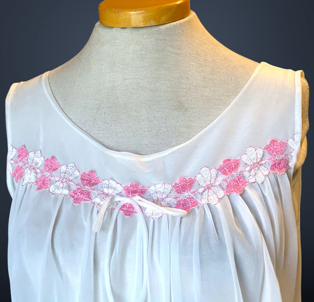 Gorgeous 2 piece 1960’s vintage peignoir nightgown set.  Bottom nightie is sheer white layer of fabric, with pink and white lace flower embellishments across the bust with a little tie bow at the center.  Tank top style sleeves.  Top cover is the same white sheer fabric single blousing layer with the same pink and white lace flower detail across the bust of top cover and on its fold over collar closing with a double tie style.   No size or care labels.  In amazing condition, no stains or holes.