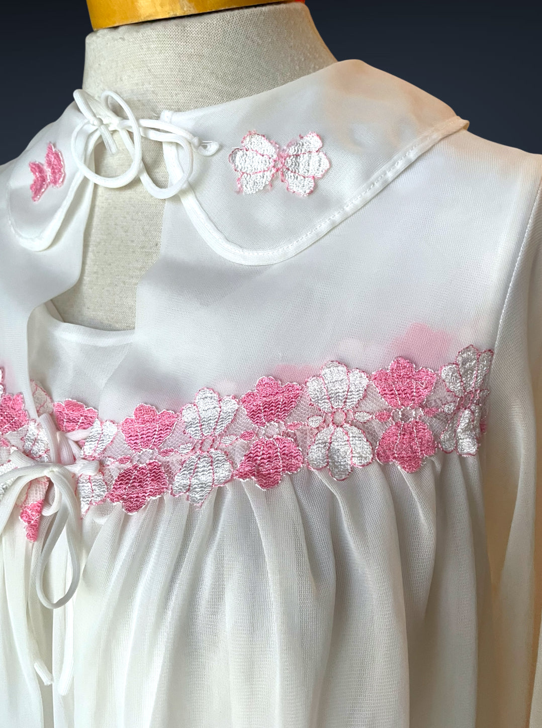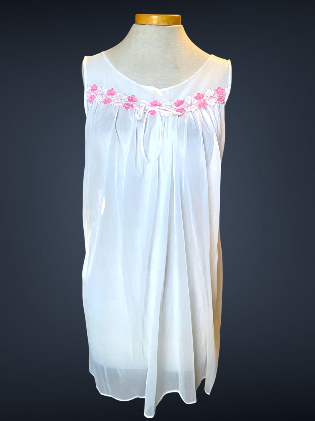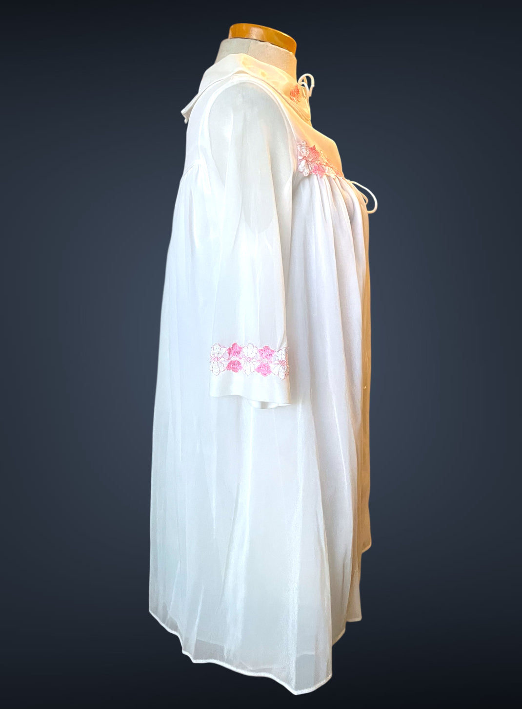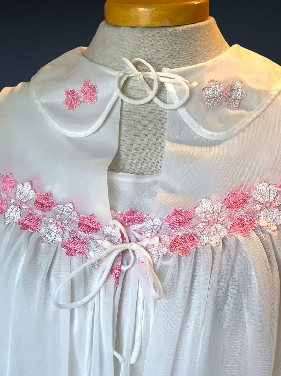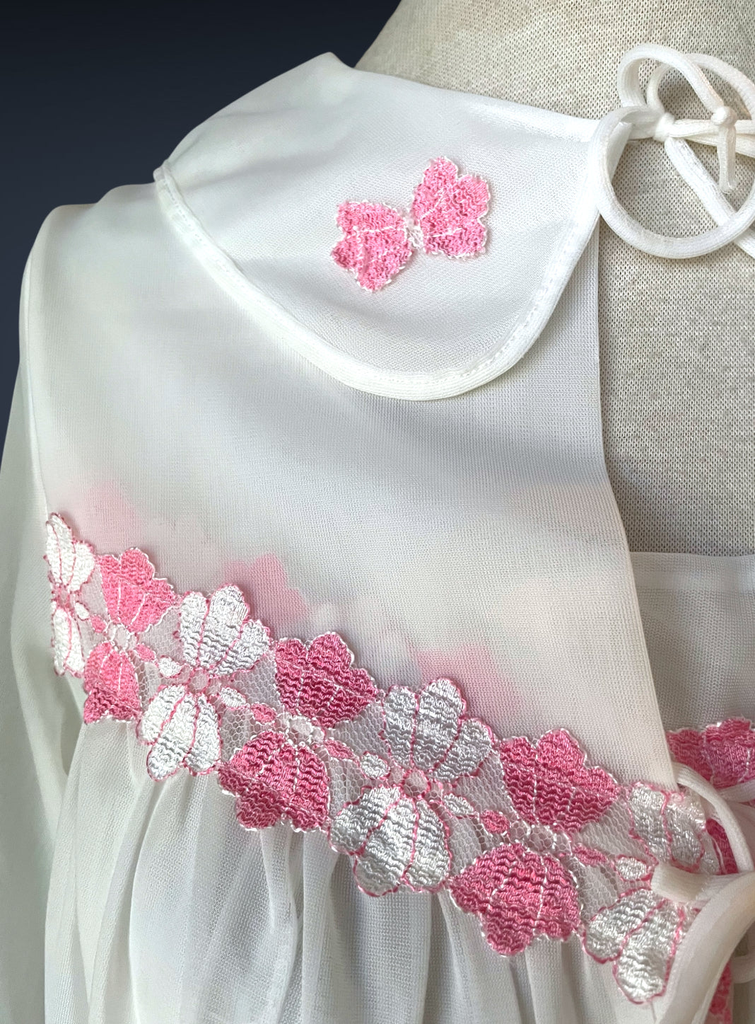 Gorgeous 2 piece 1960’s vintage peignoir nightgown set.  Bottom nightie is sheer white layer of fabric, with pink and white lace flower embellishments across the bust with a little tie bow at the center.  Tank top style sleeves.  Top cover is the same white sheer fabric single blousing layer with the same pink and white lace flower detail across the bust of top cover and on its fold over collar closing with a double tie style.   No size or care labels.  In amazing condition, no stains or holes.