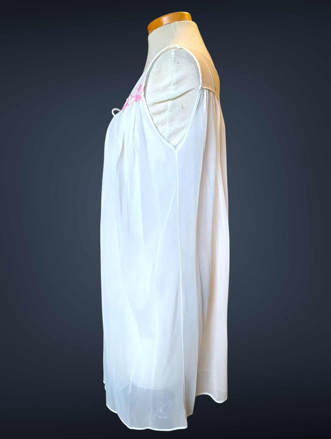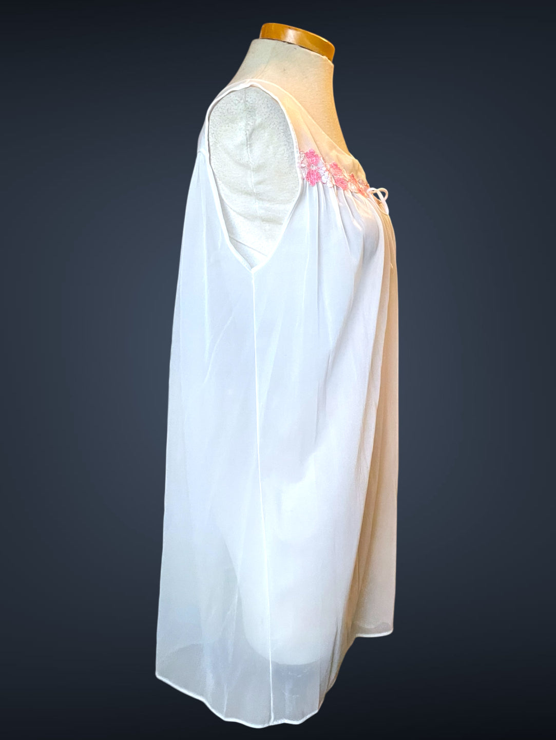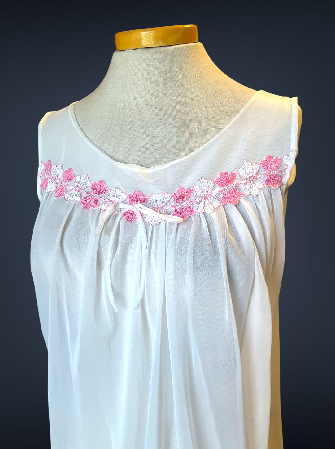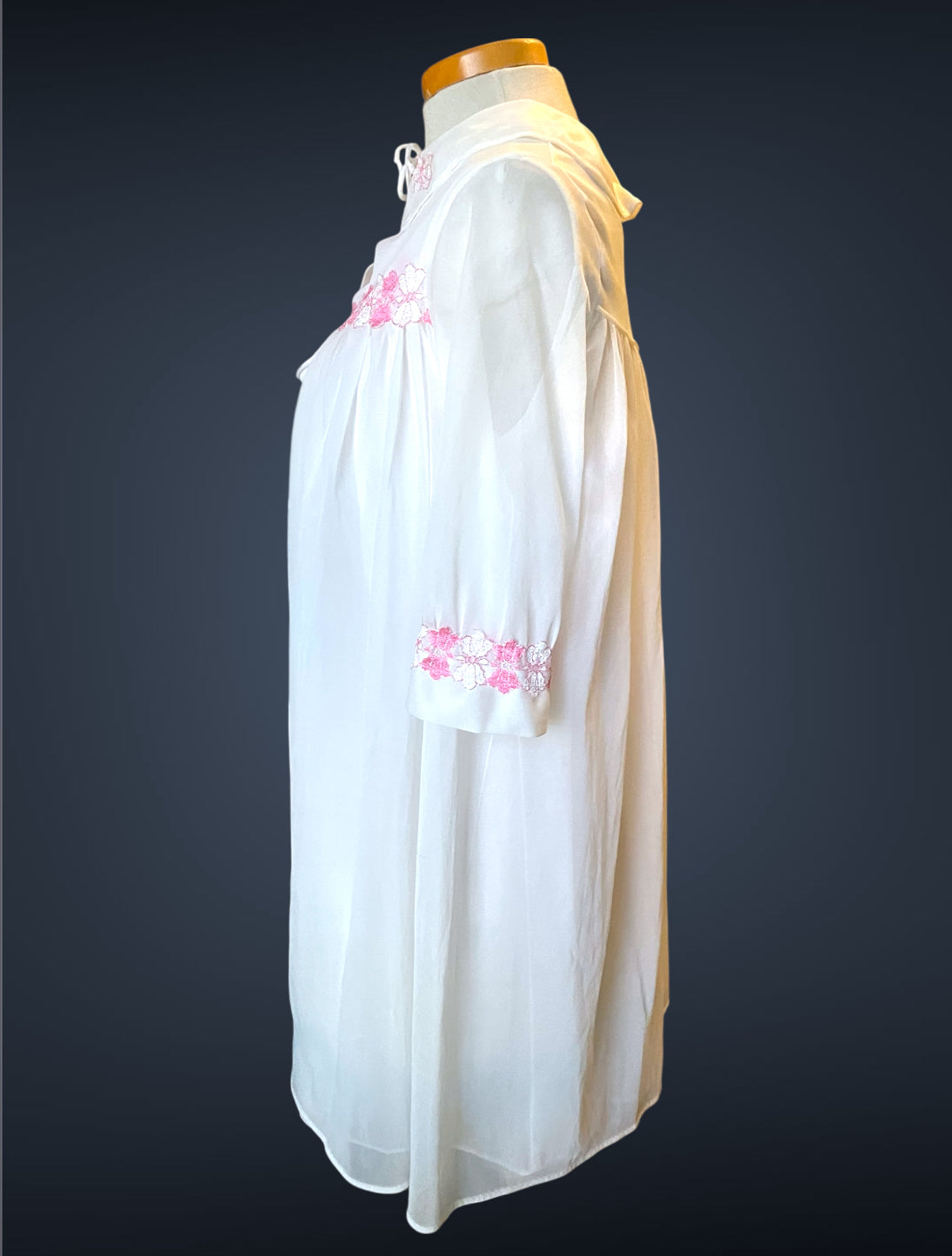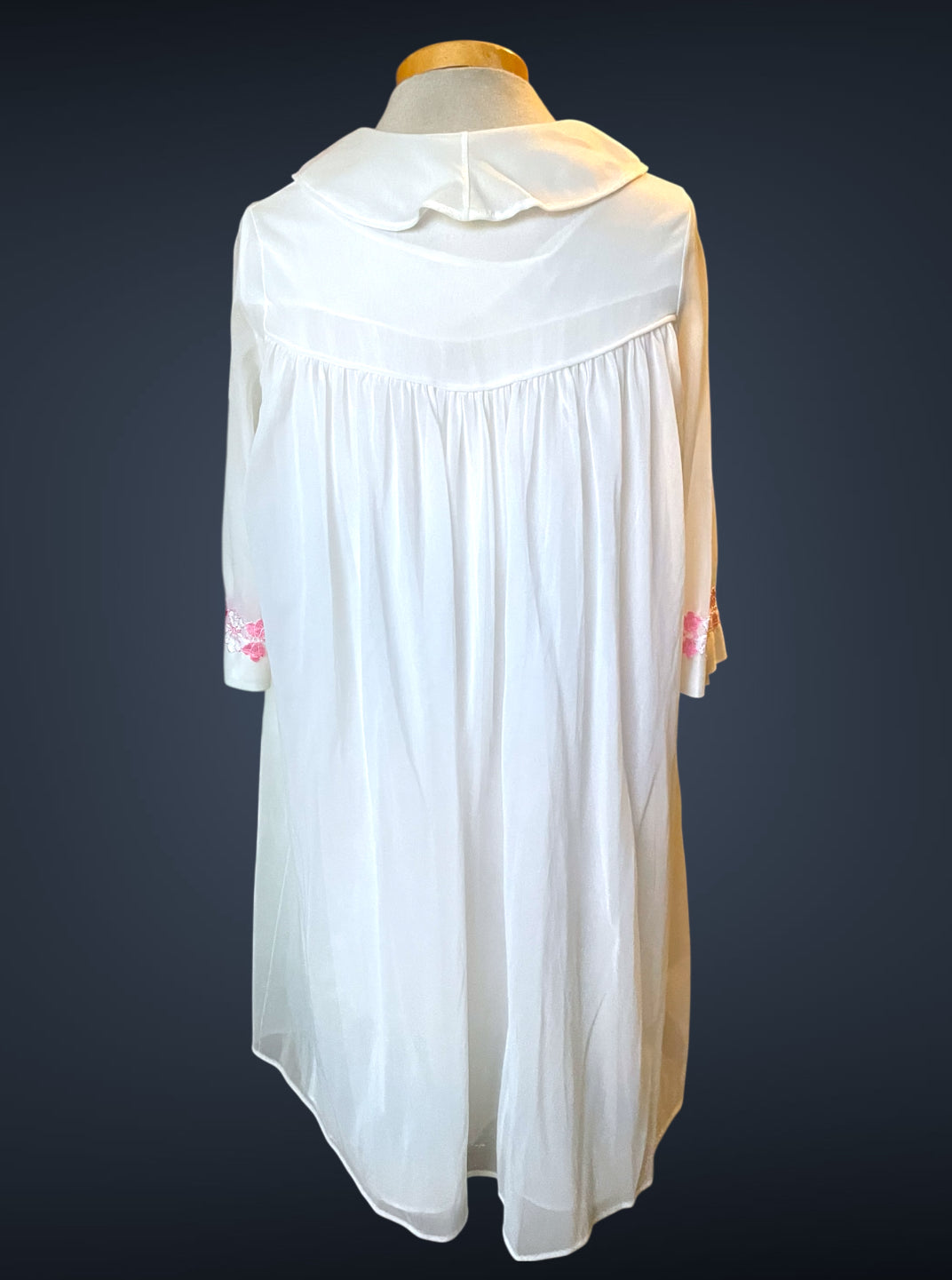 Gorgeous 2 piece 1960’s vintage peignoir nightgown set.  Bottom nightie is sheer white layer of fabric, with pink and white lace flower embellishments across the bust with a little tie bow at the center.  Tank top style sleeves.  Top cover is the same white sheer fabric single blousing layer with the same pink and white lace flower detail across the bust of top cover and on its fold over collar closing with a double tie style.   No size or care labels.  In amazing condition, no stains or holes.