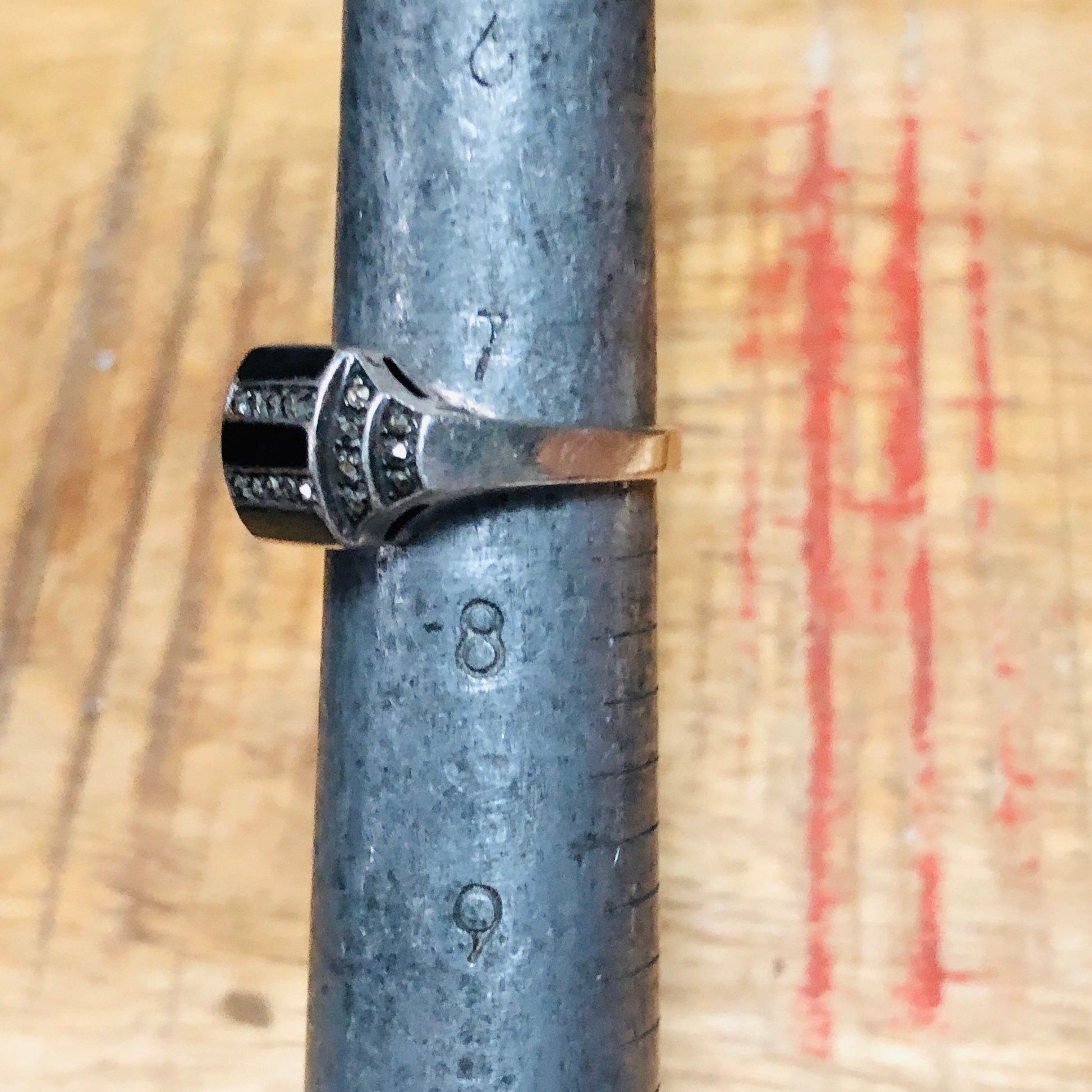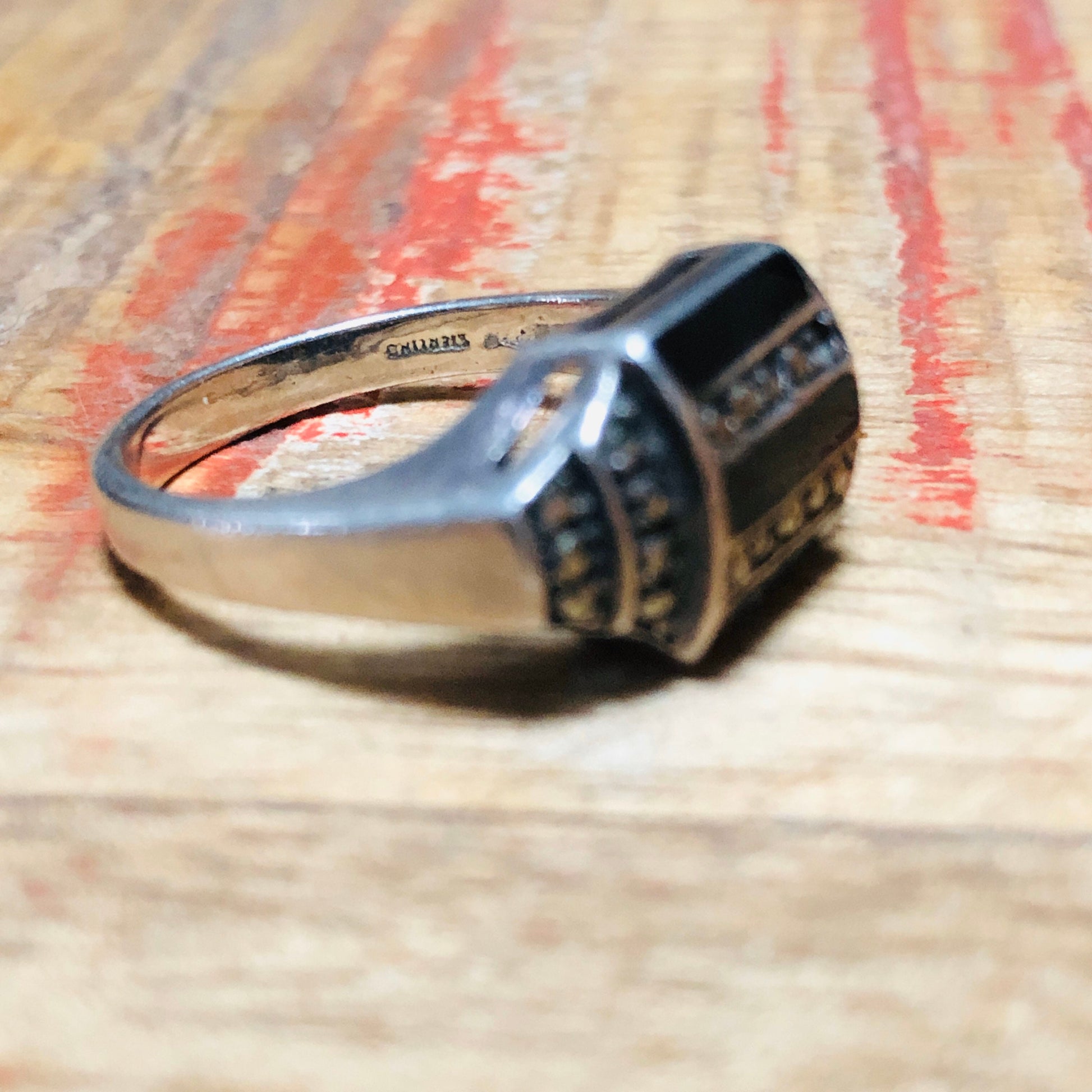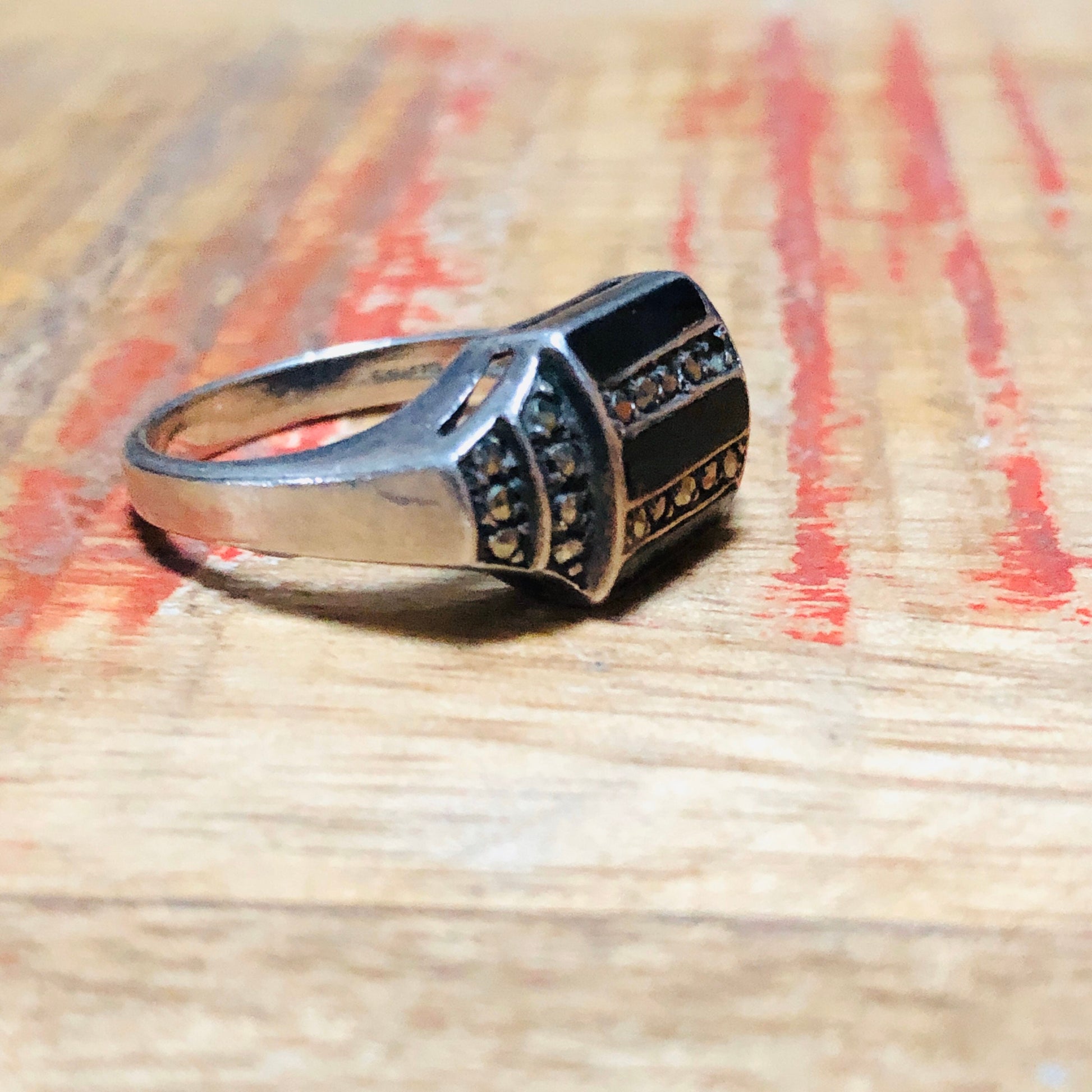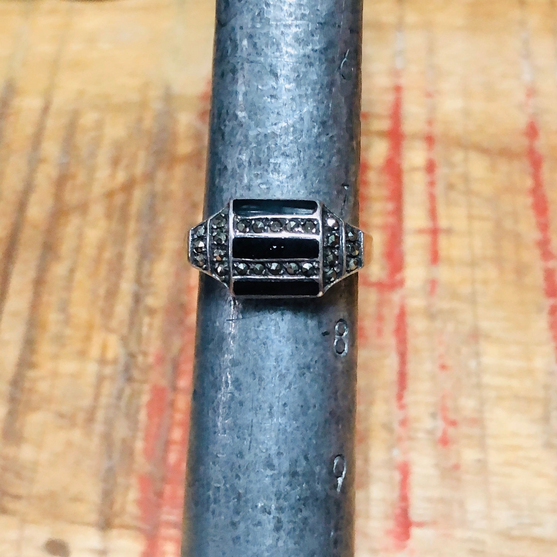Art Deco Sterling Silver & Marcasite Triple Onyx Gemstone Geometric Ring. Hallmarked “Sterling” on the inner side of the band.