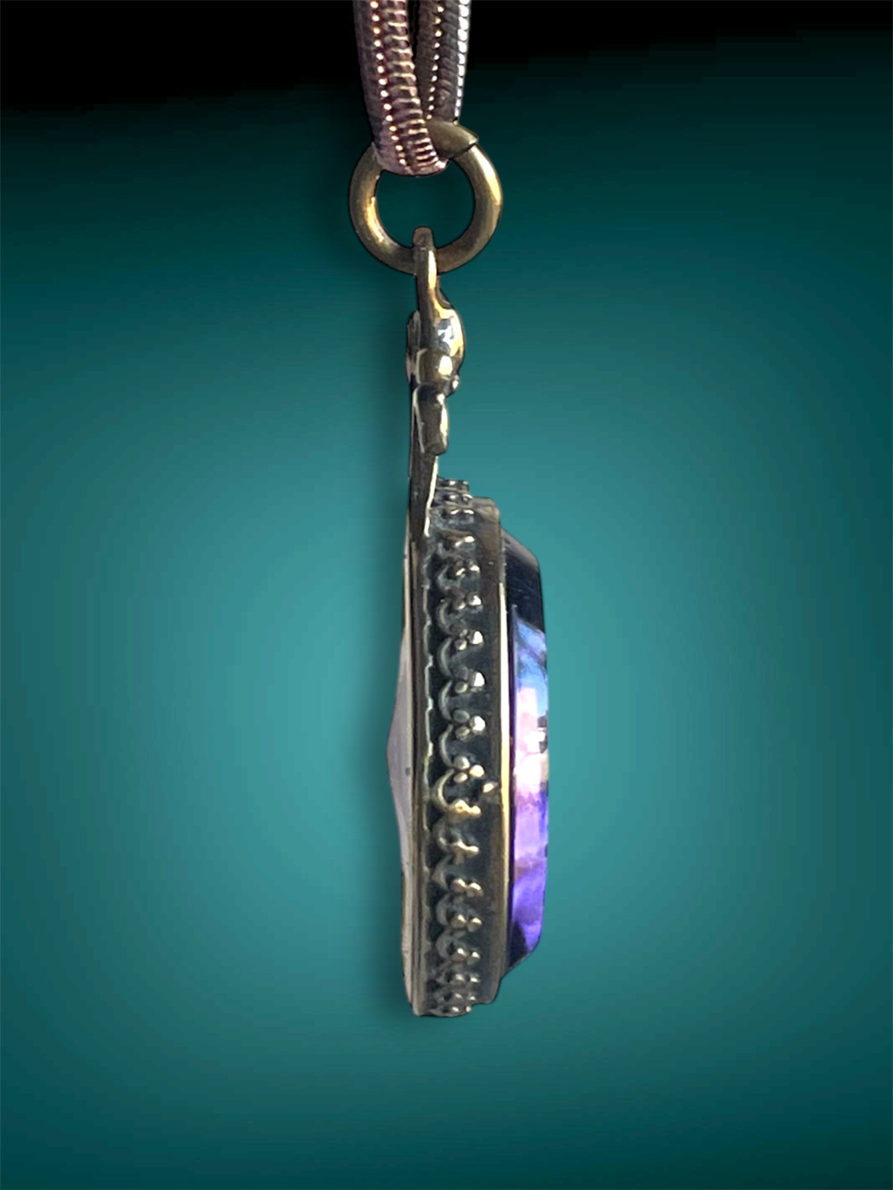 Gorgeous vintage gilded brass Art Nouveau scarab fancy bezel set round faceted purple art glass intaglio (reverse carved) cameo necklace. Serpentine gold brass long chain necklace with a spring ring closure. Pendant measures 30mm long (including scarab detail) 21mm wide (cameo diameter). Chain is 60cm long (24”).