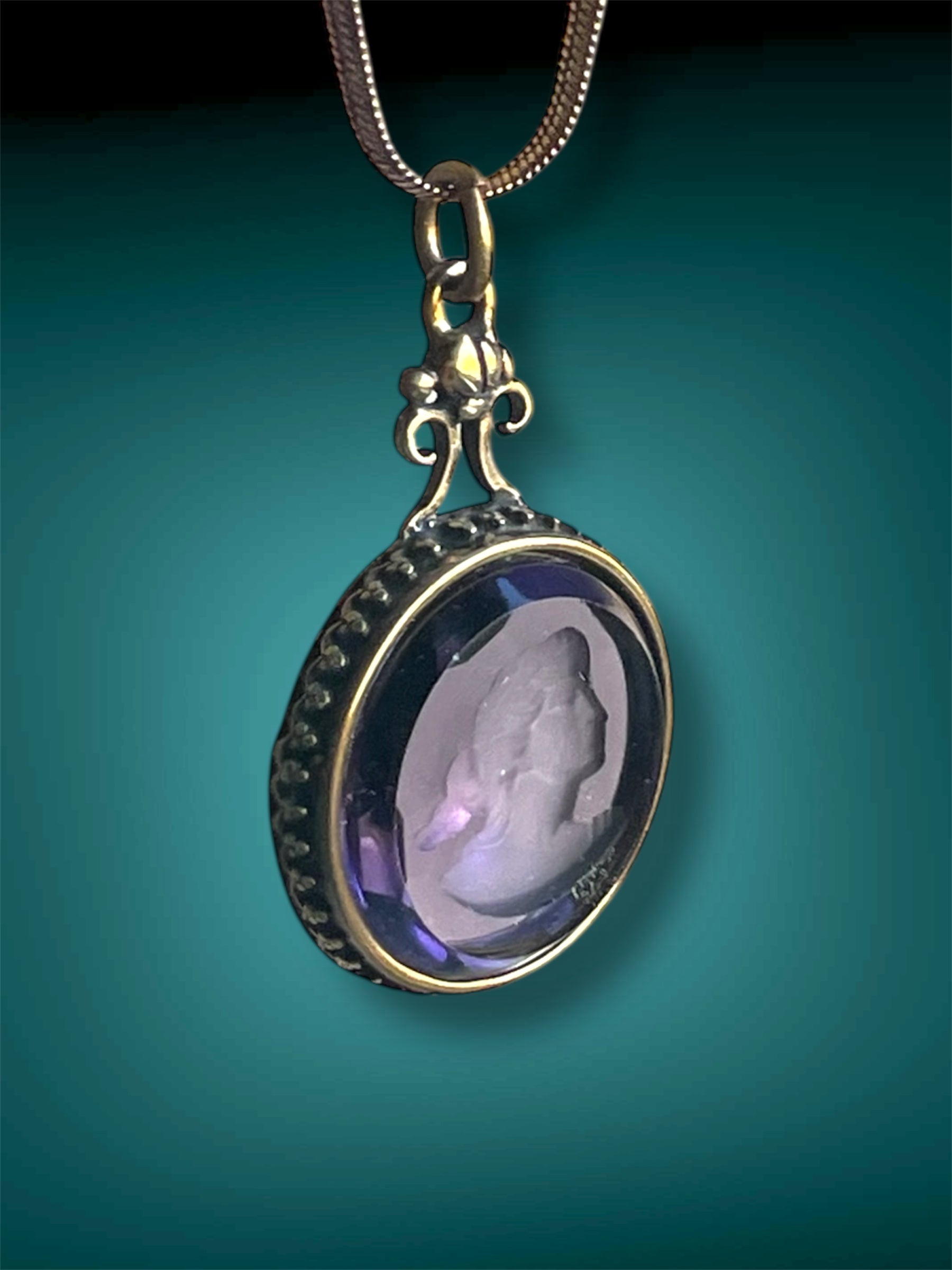 Art Nouveau Brass Scarab Set Purple Faceted Glass Intaglio Cameo Pendant Necklace