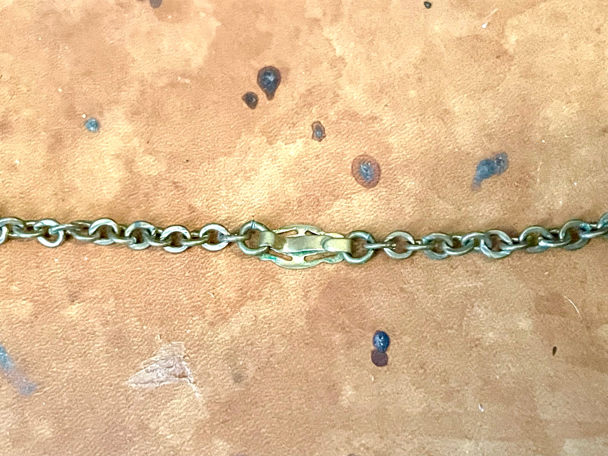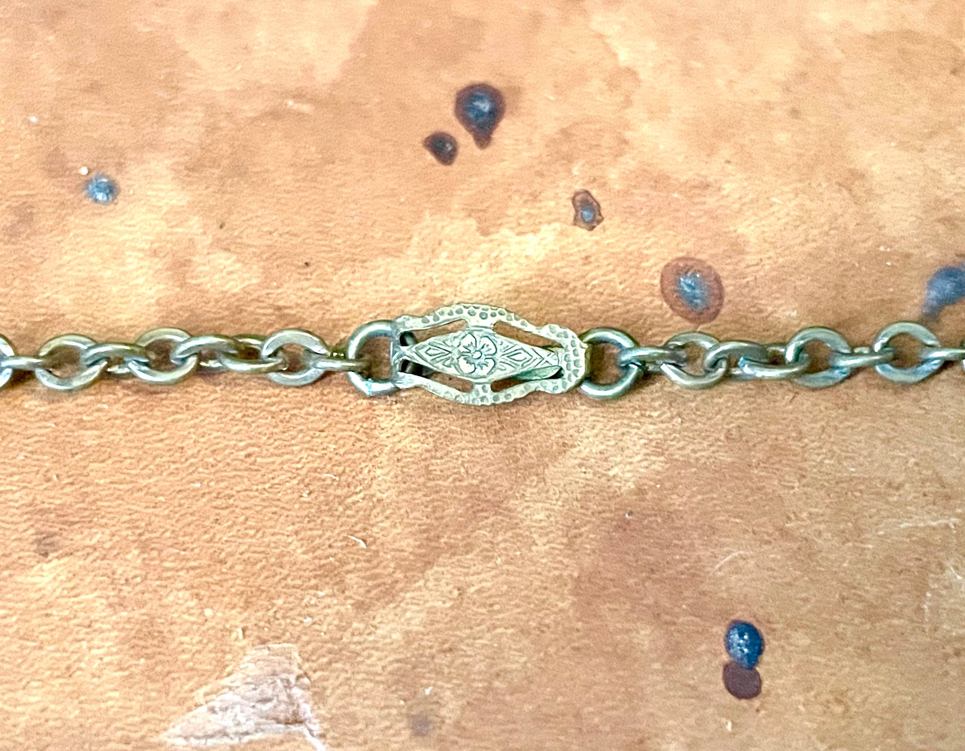 Gorgeous Art Nouveau ornate, artistic daisy flowers that almost look like suns on top and bottom, and flourishing leaf and vine crawling up the sides of the center prong set blue & white art glass 30mm by 23mm cameo that is 6-7mm thick. Pendant itself is 50mm long and 48mm wide. Chain is a period correct textured brass round link chain with a similarly floral stamped pressure lock closure. Chain is 24” long and 3mm wide.