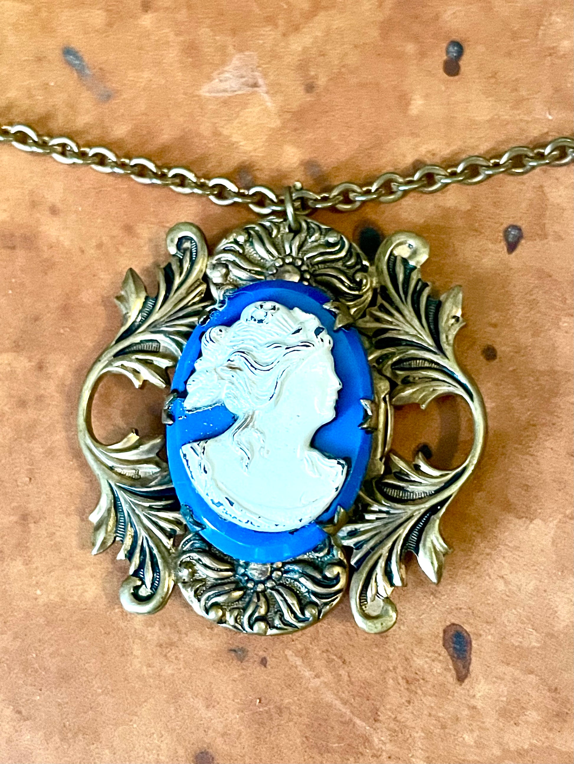 Art Nouveau Ornate Brass Blue & White Art Glass Cameo Locket Necklace