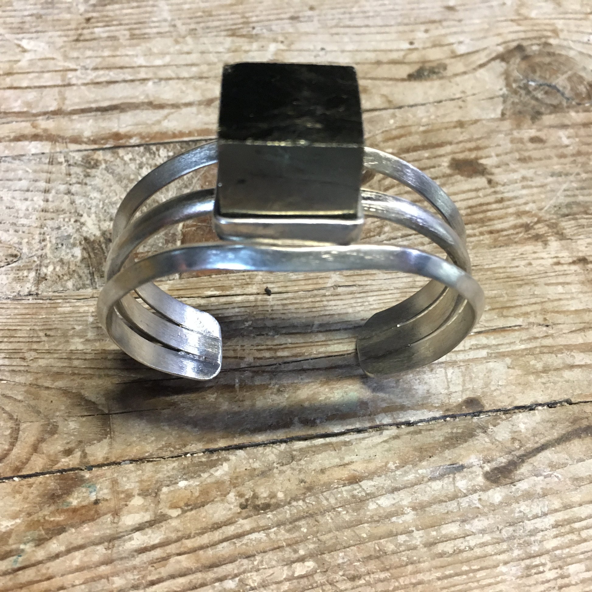Handmade in my studio this is a gorgeous pyrite gemstone that I purchased at the Kutná Hora Sedlec Ossuary in the Czech Republic. Bezel set in sterling silver with a triangle triple band cuff.