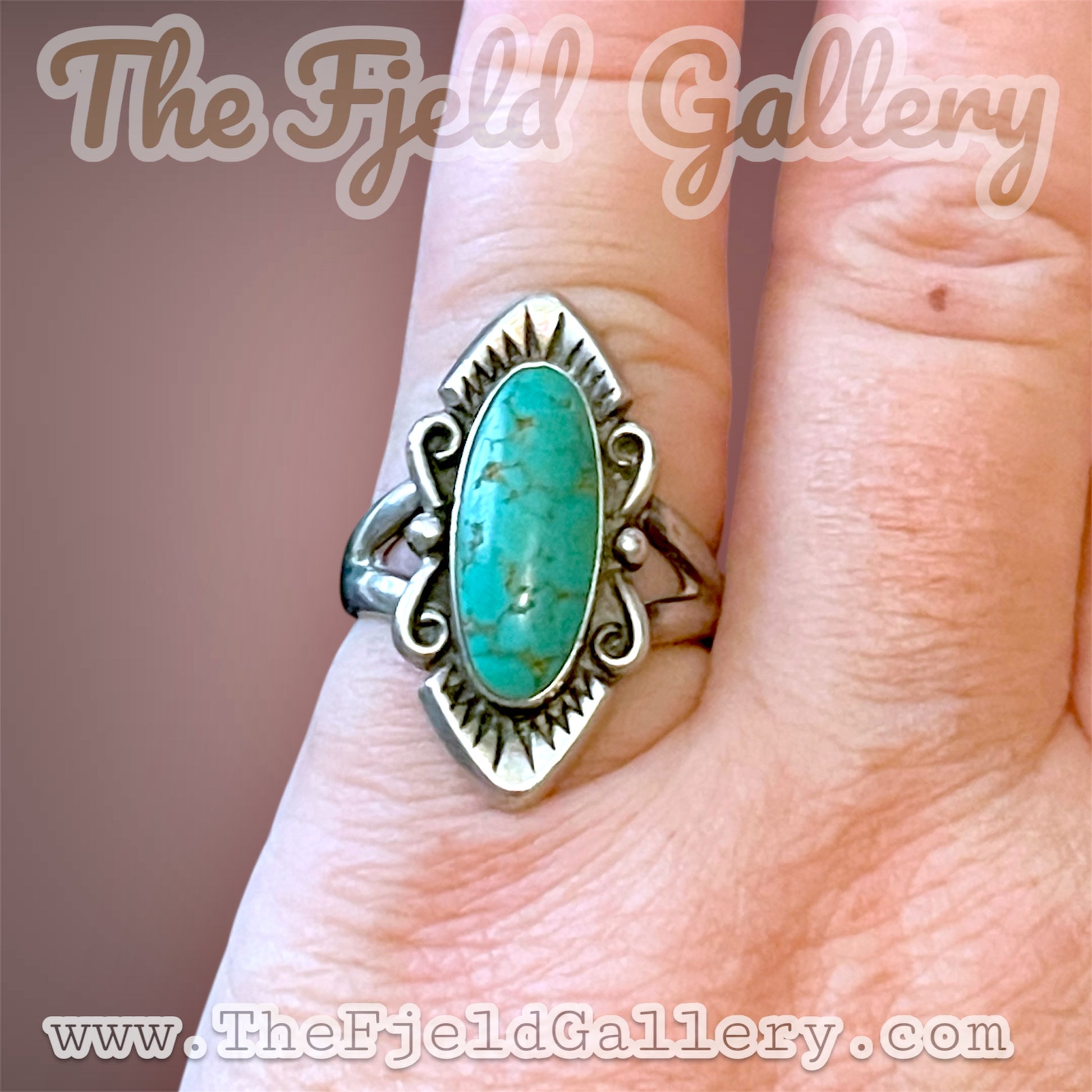 This is a gorgeous vintage Native American sterling silver ring with double pointed ends that have sun design embossing and raindrop & swirl detailing. Large oval turquoise gemstone cabochon with light brown inclusion spiderweb lines bezel set in the sterling silver. 3 mm split band hallmarked “ STERLING”