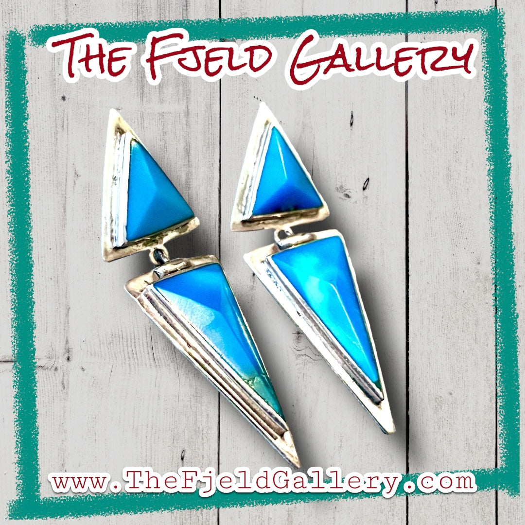 Gorgeous 3D geometric triangle pyramid turquoise gemstones bezel set in sterling silver dangle earrings. Post backs.