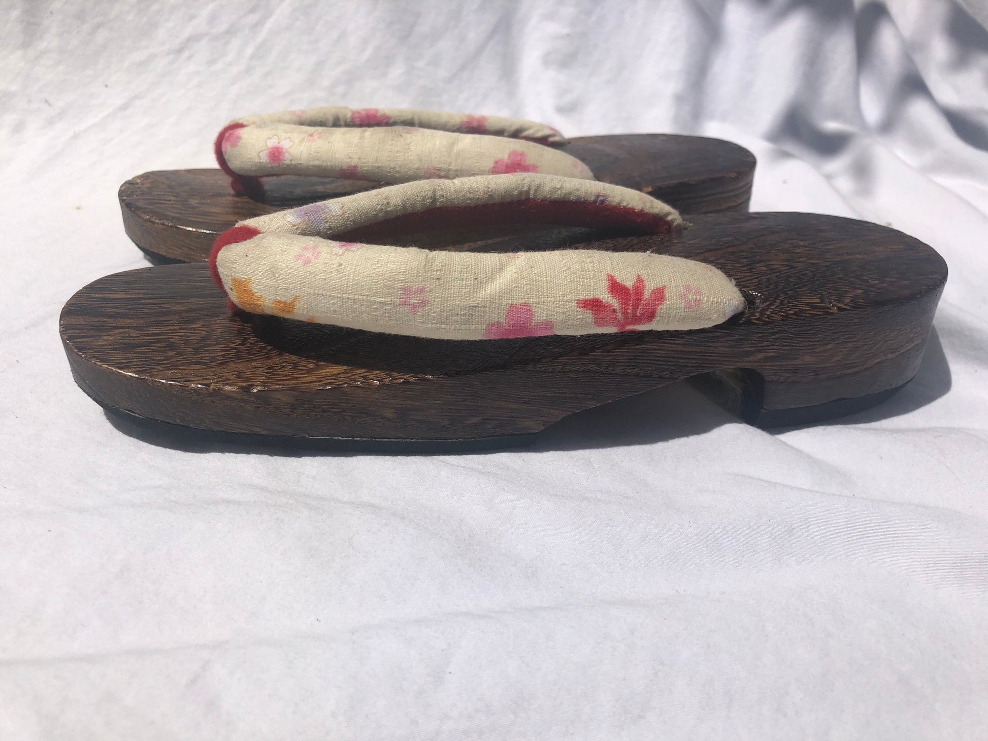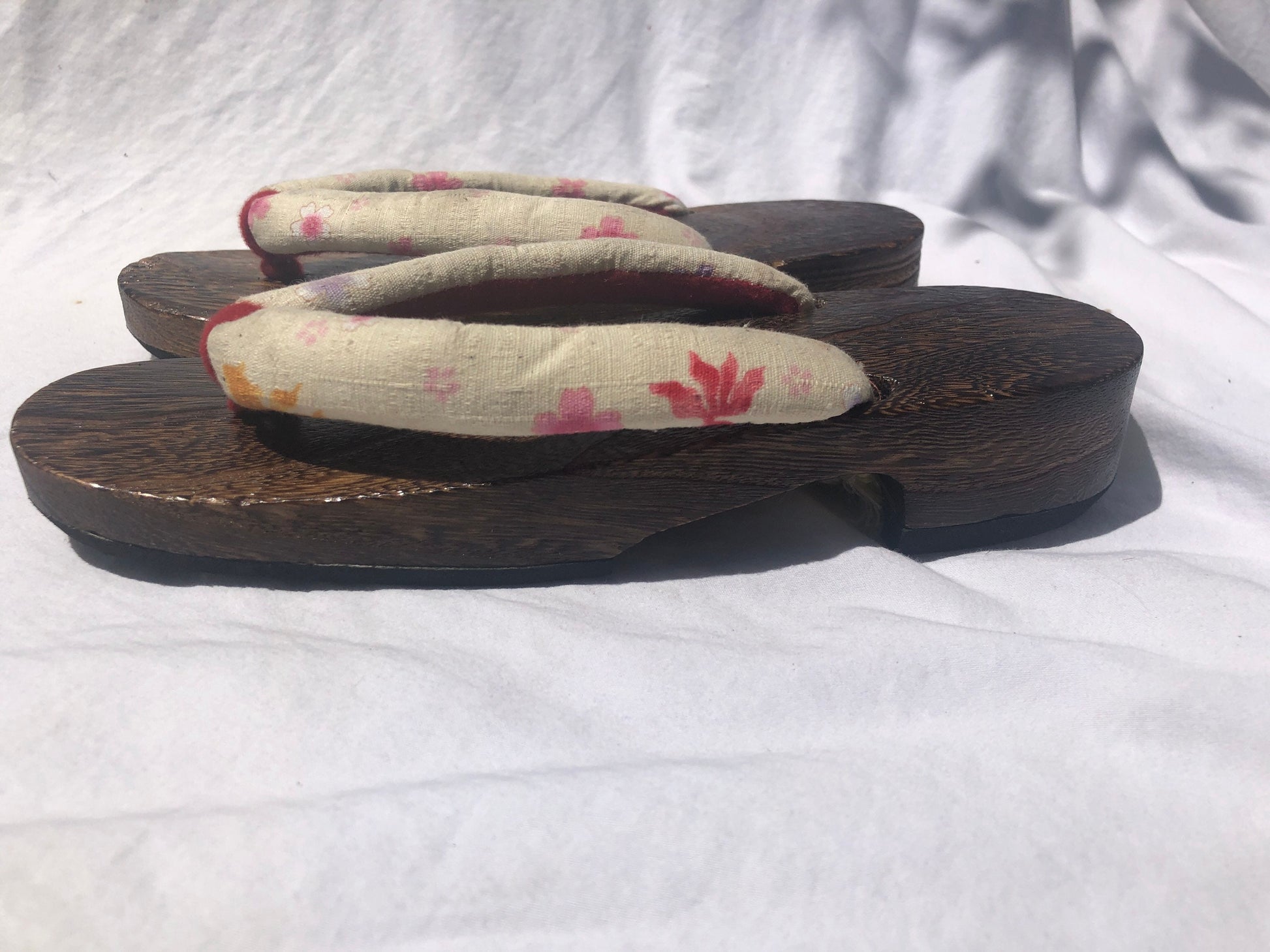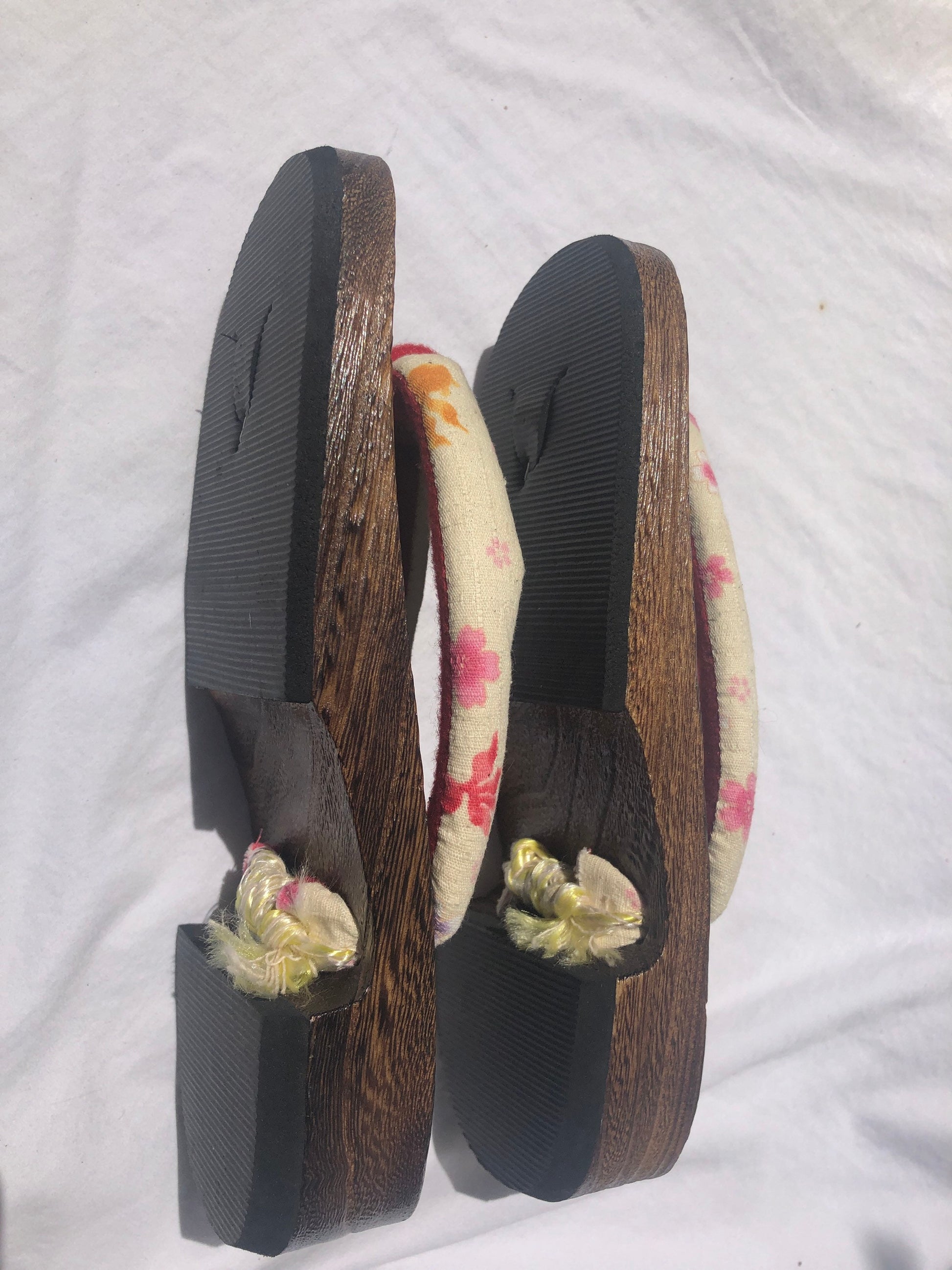 Unique Asian Wooden Sole Yellow & Pink Floral Thong Sandals