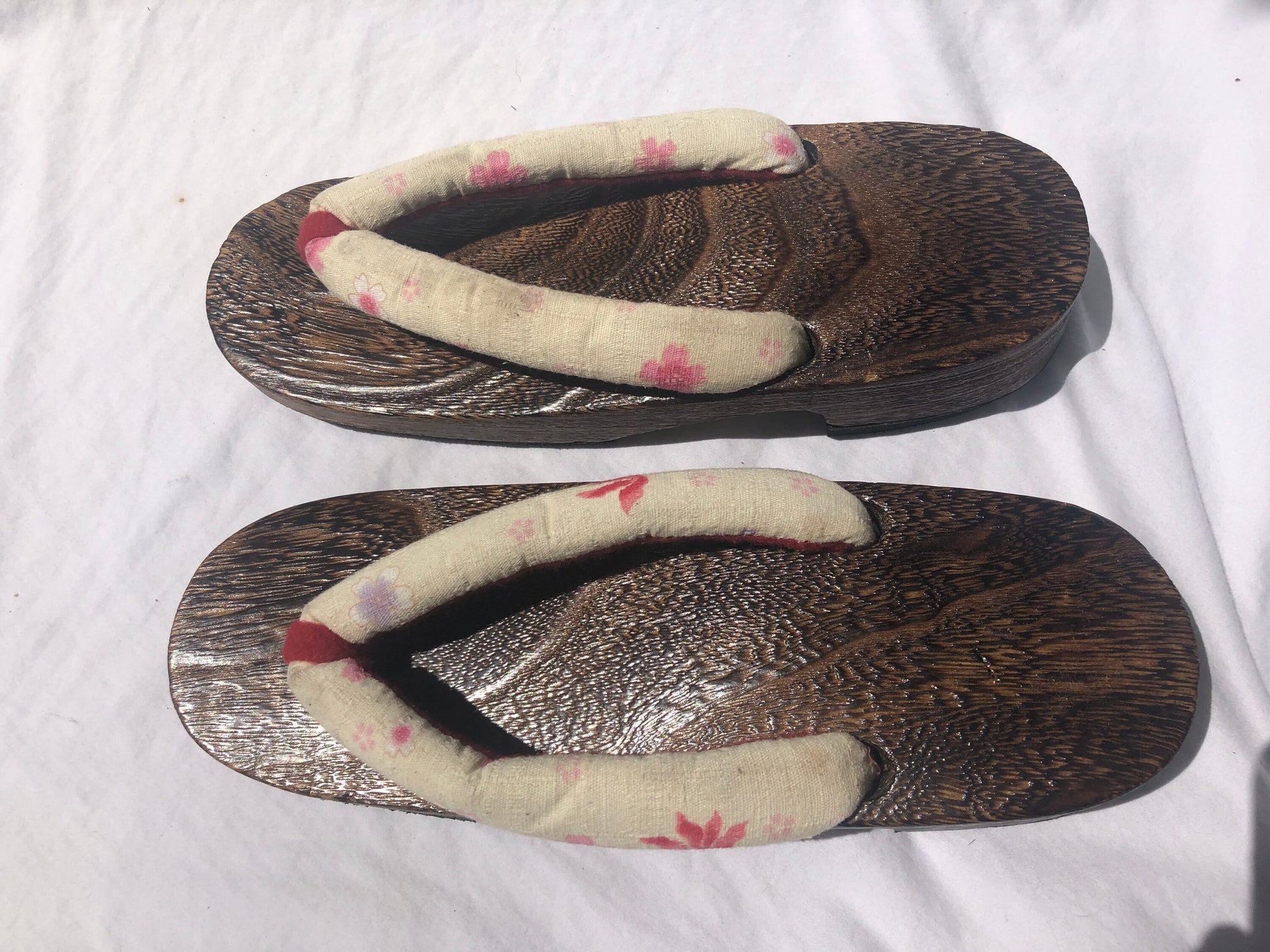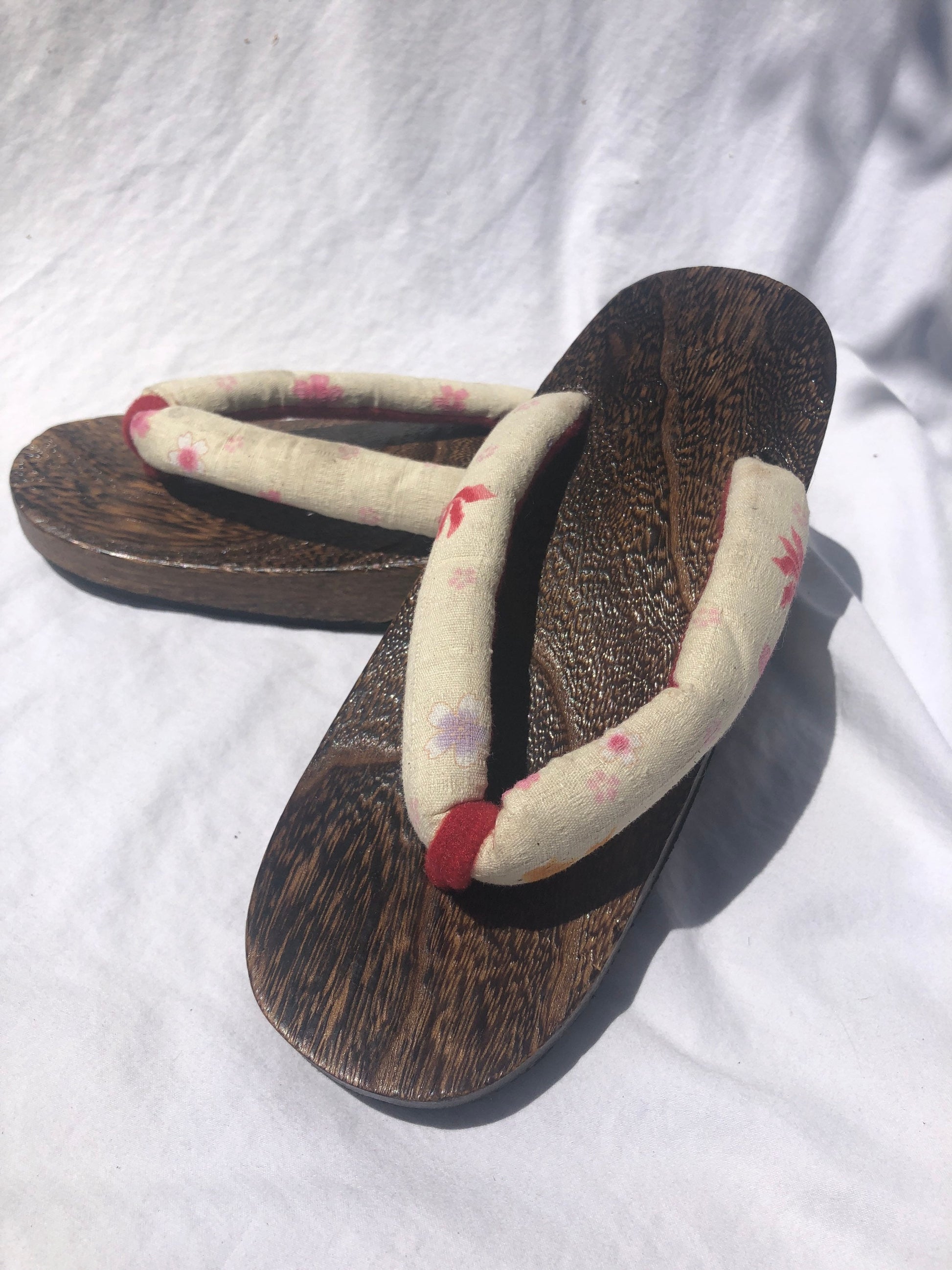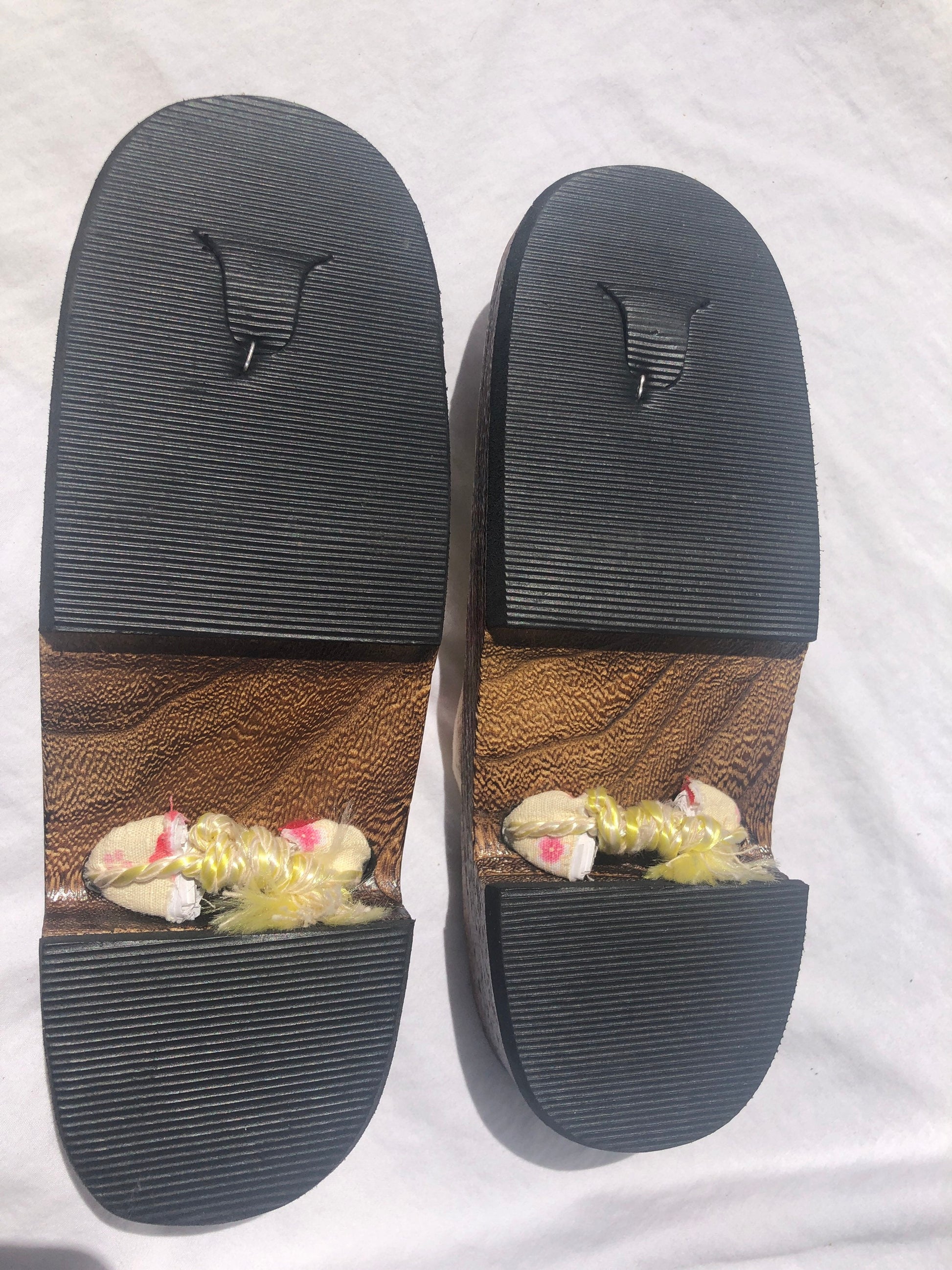 Unique Asian Wooden Sole Yellow & Pink Floral Thong Sandals