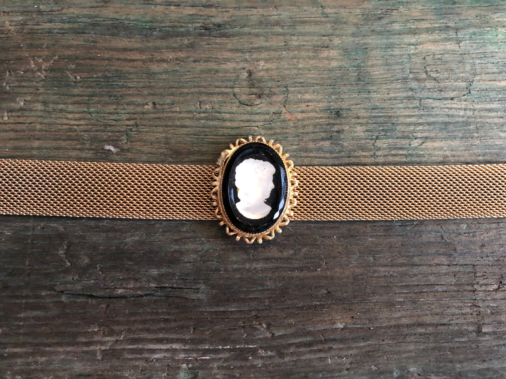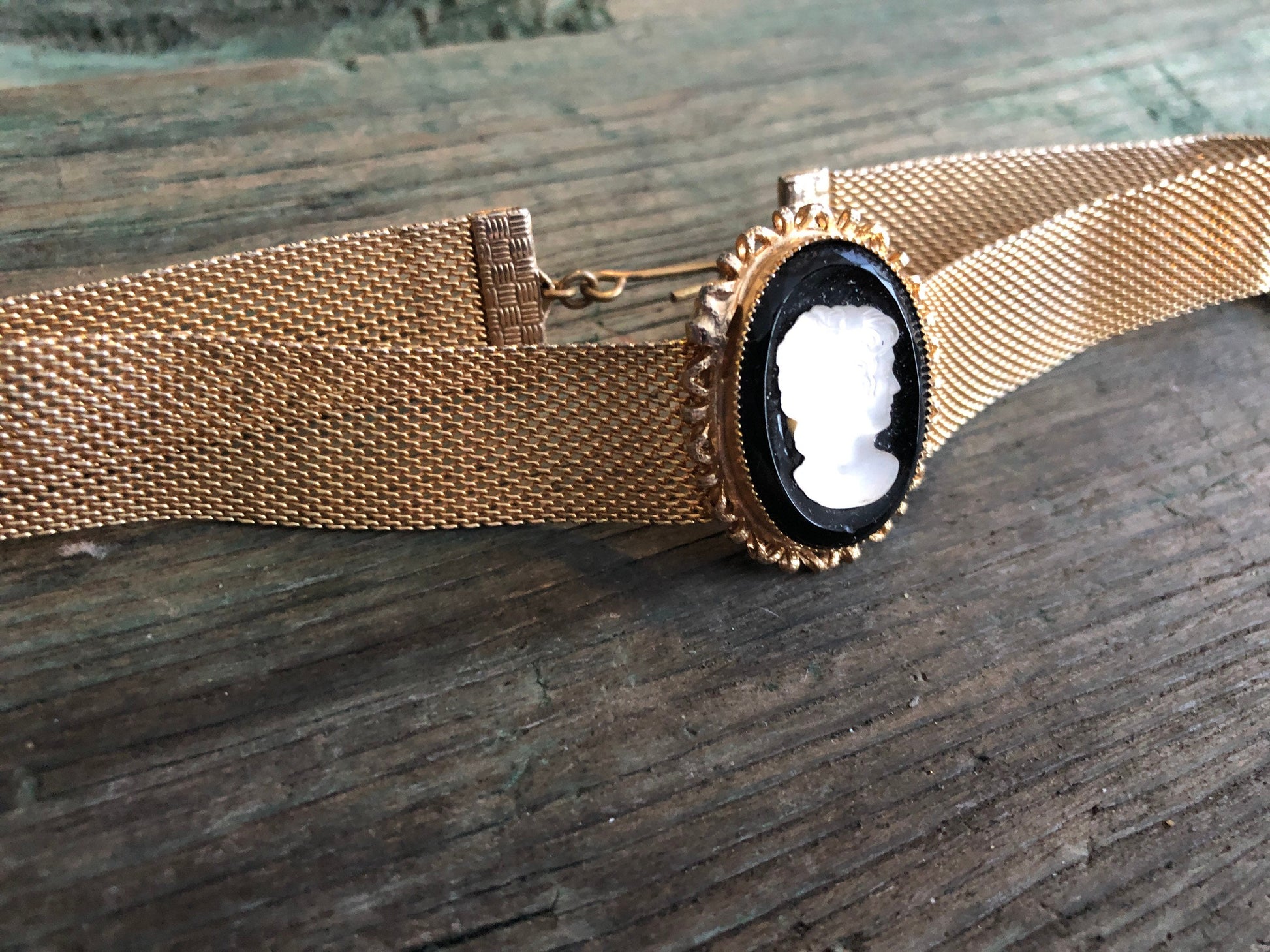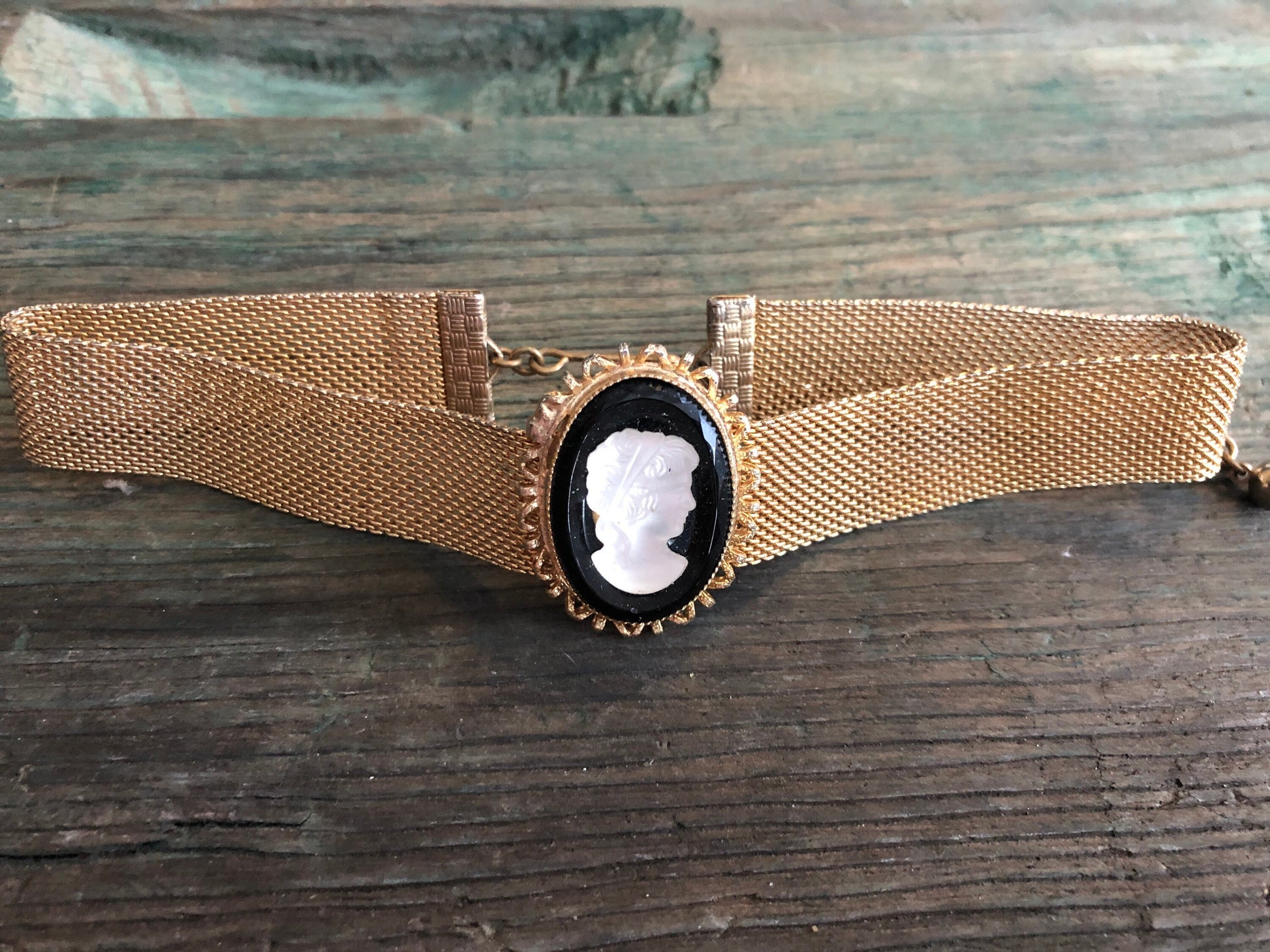 Vintage Gold Mesh Black & White Cameo Choker Necklace