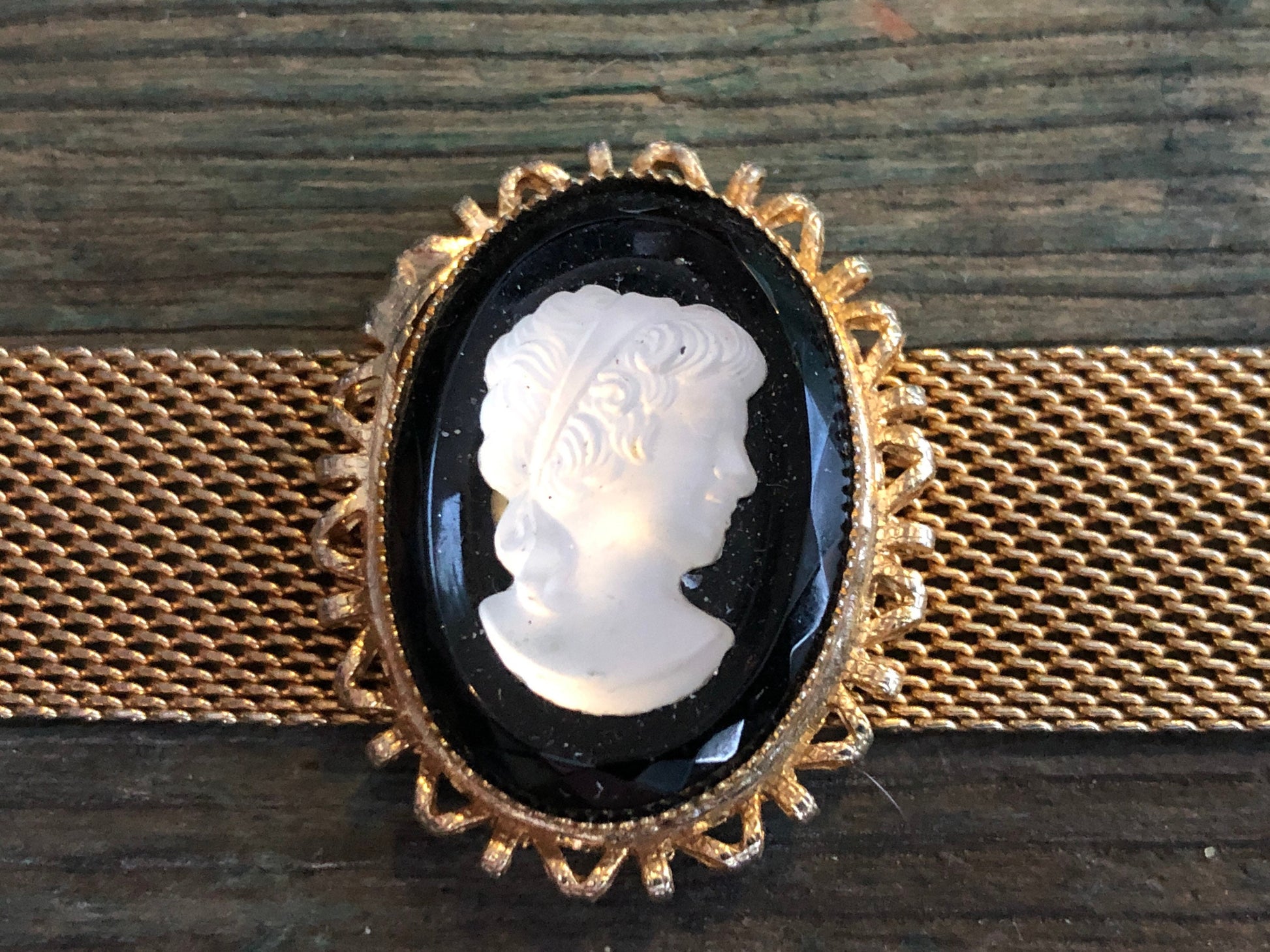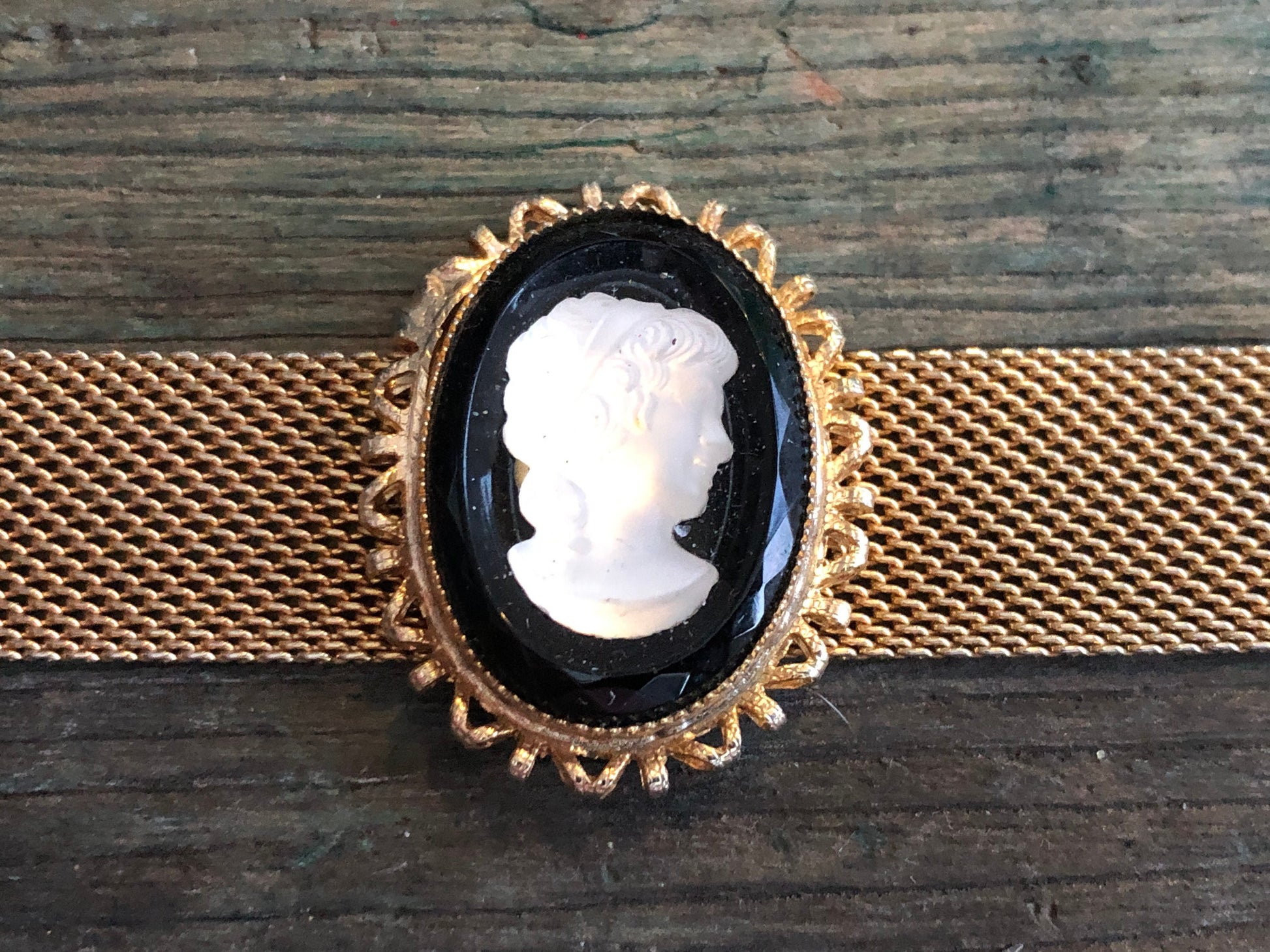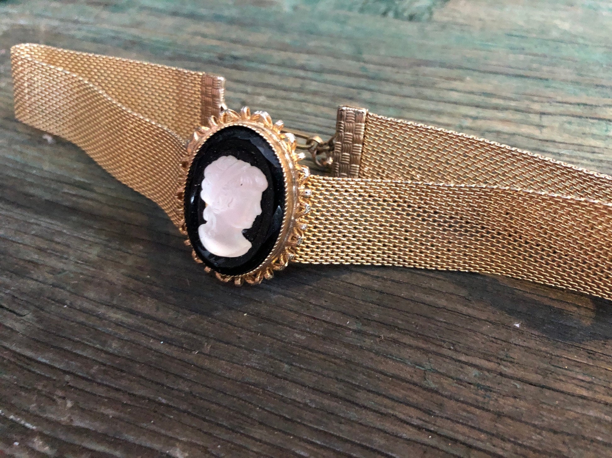 Vintage Gold Mesh Black & White Cameo Choker Necklace