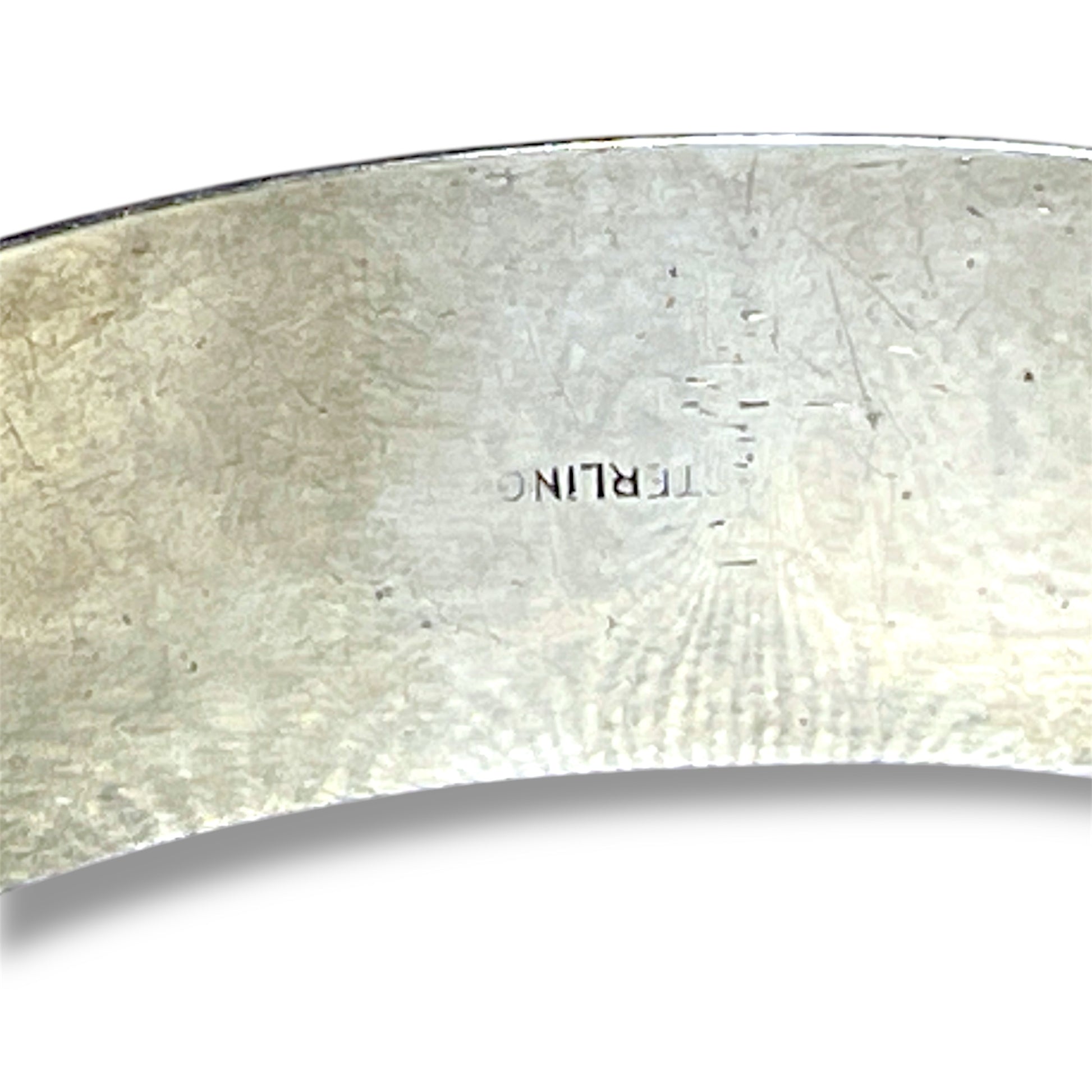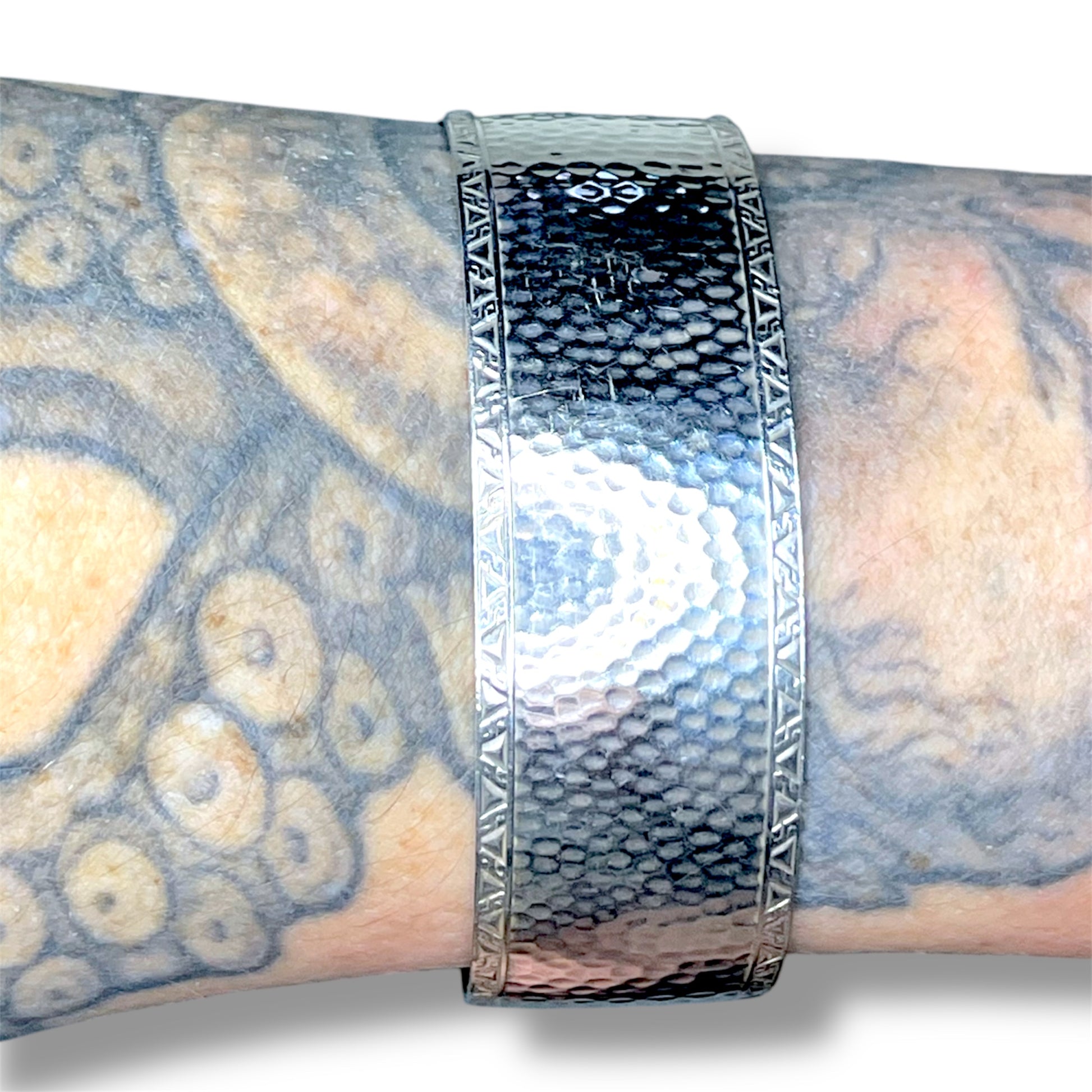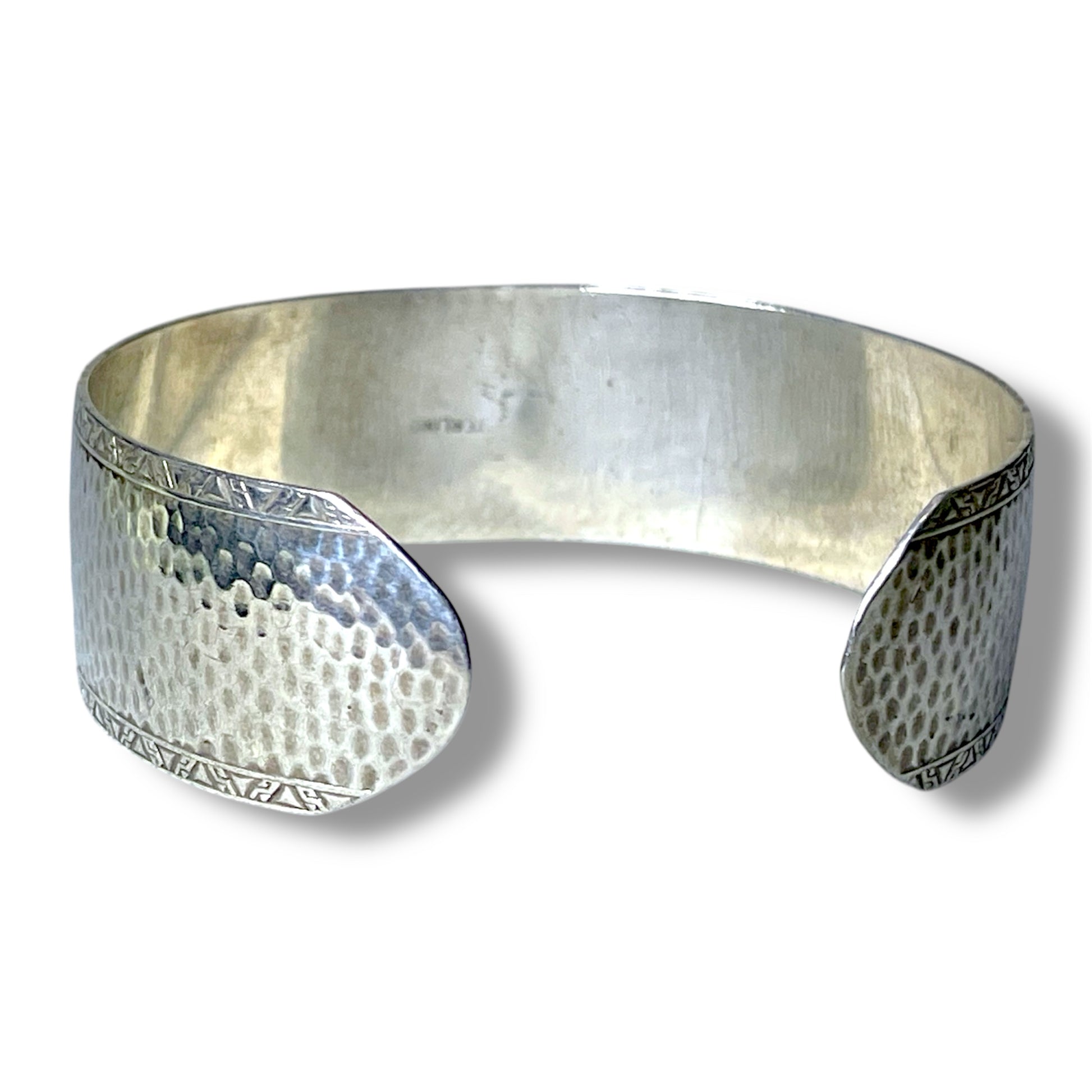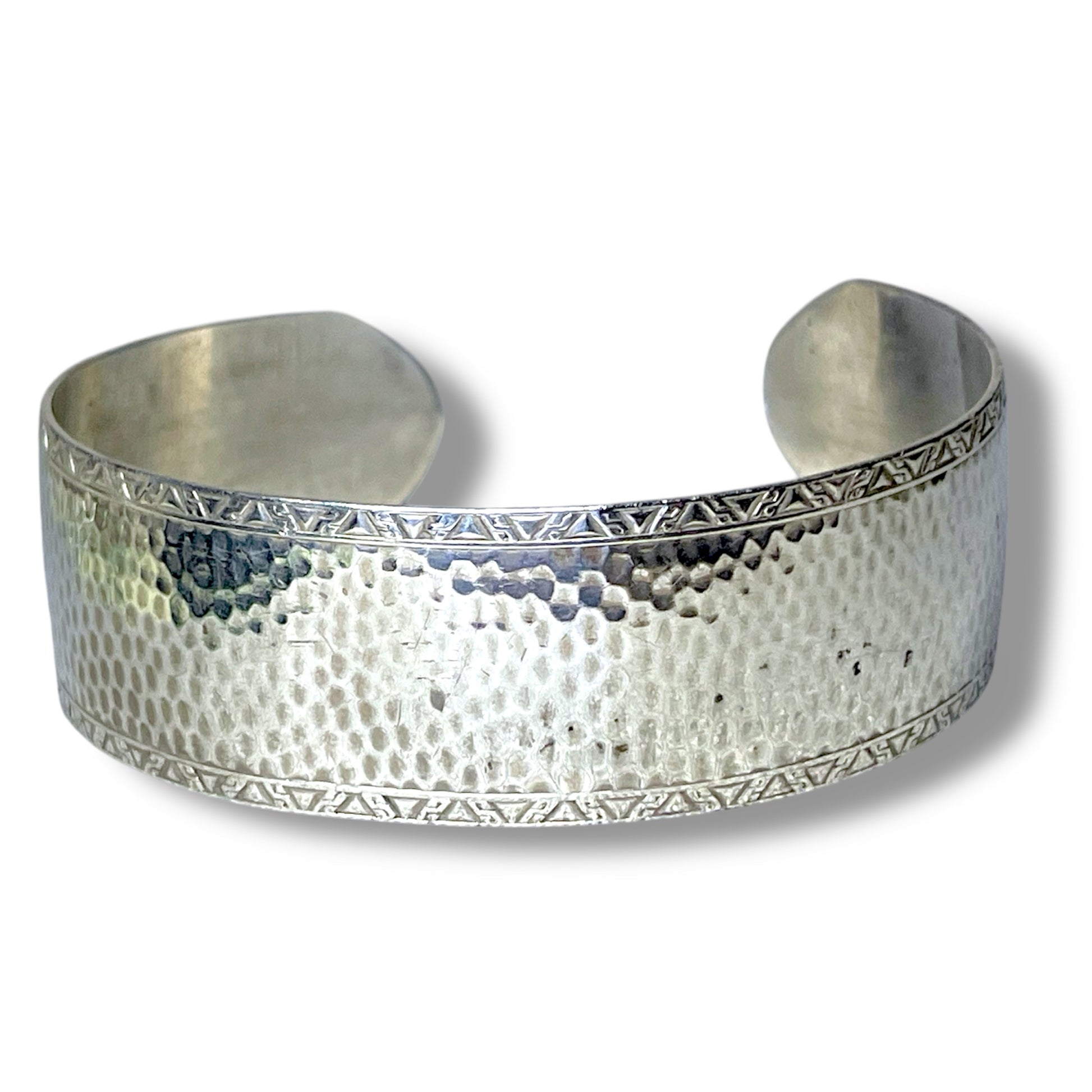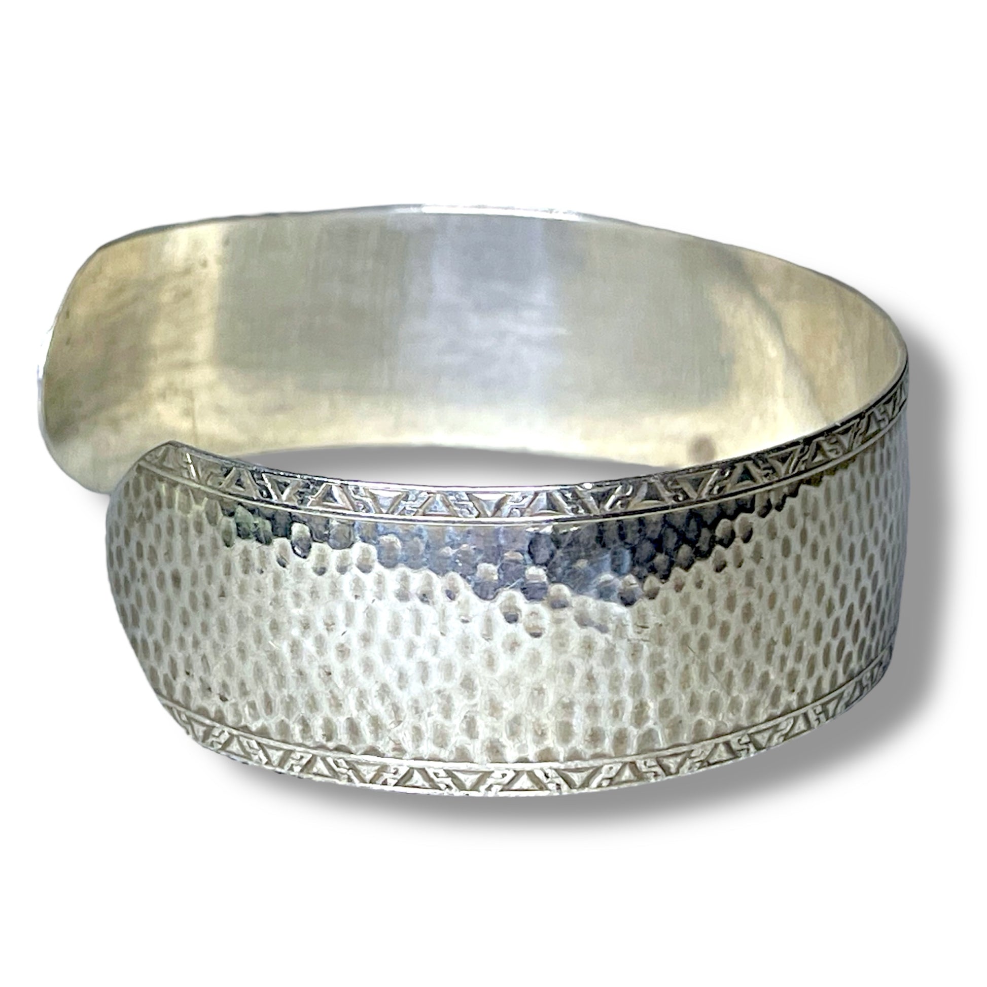 Vintage wide solid sterling silver cuff bracelet with a hand hammered finish as well as geometric triangle stampings around the border of the outside. Hallmarked “Sterling”.