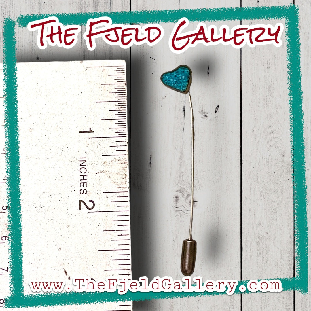 Beautiful and vintage sterling silver stick/lapel pin with bottom “clasp”/“holder” at bottom. Turquoise gemstone inlay heart design on top.