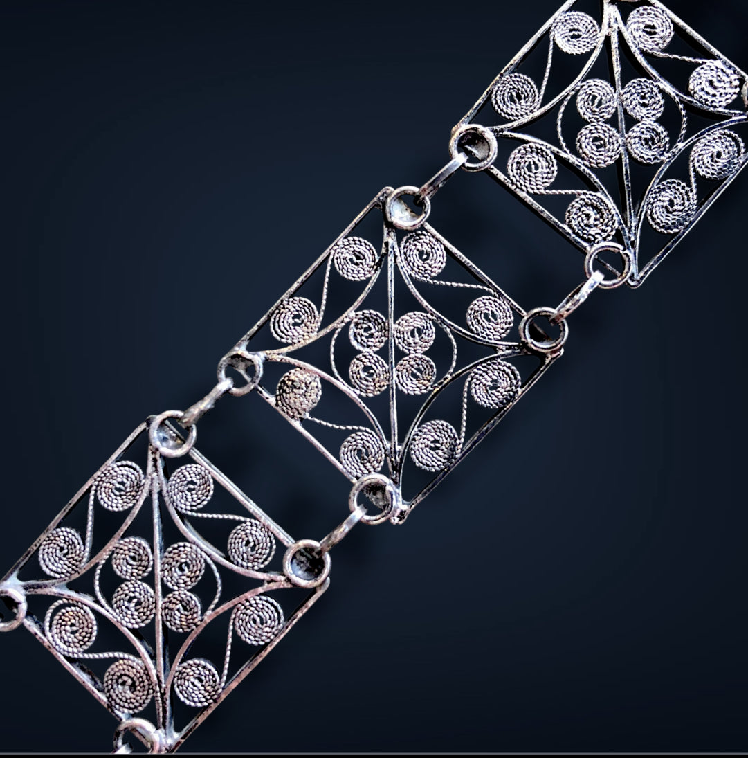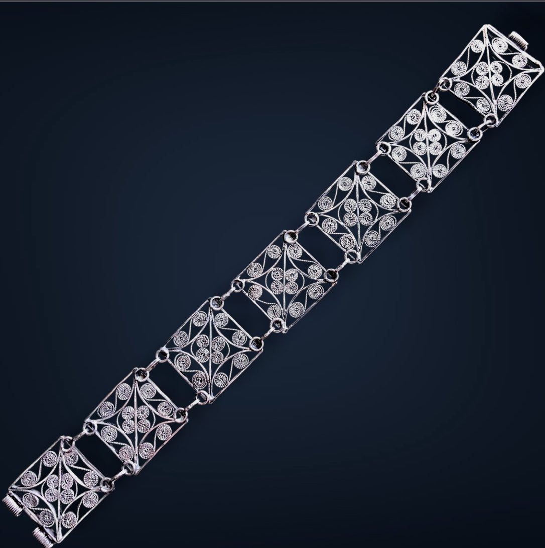 Beautiful antique sterling silver filigree square panel link bracelet. Has a pin hinge style closure, still secure. No hallmarks found. 7 square links each 20mm x 20mm. Measures a total of 7” long.