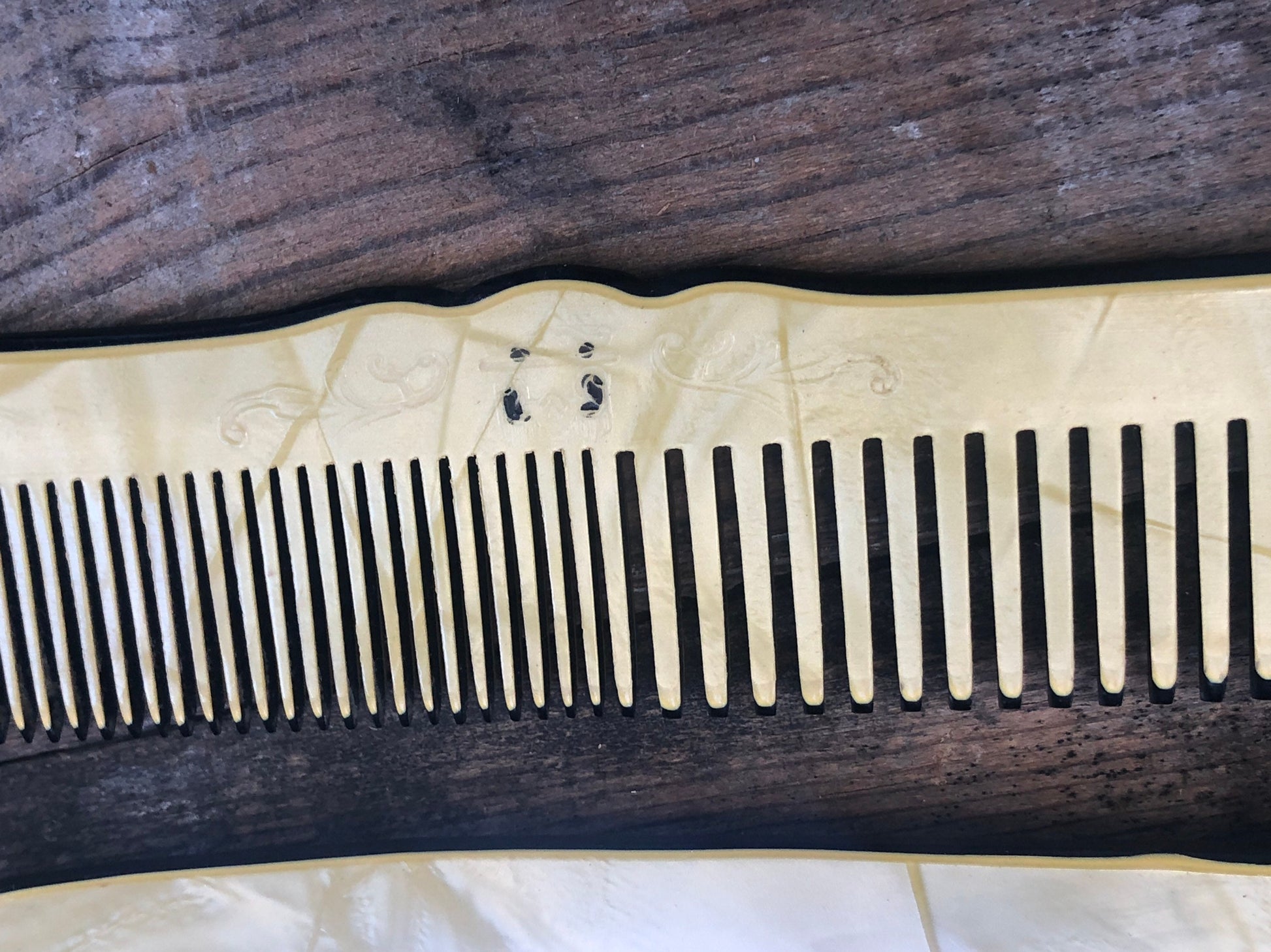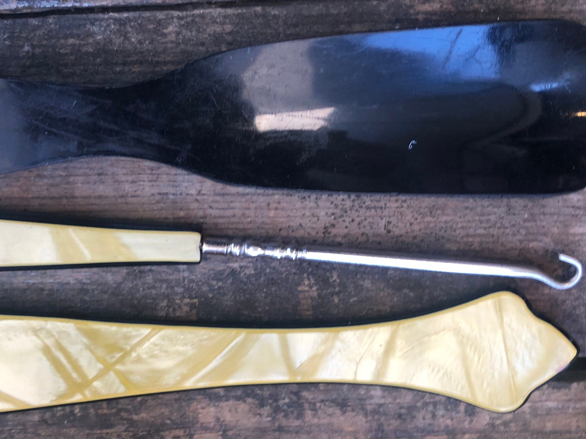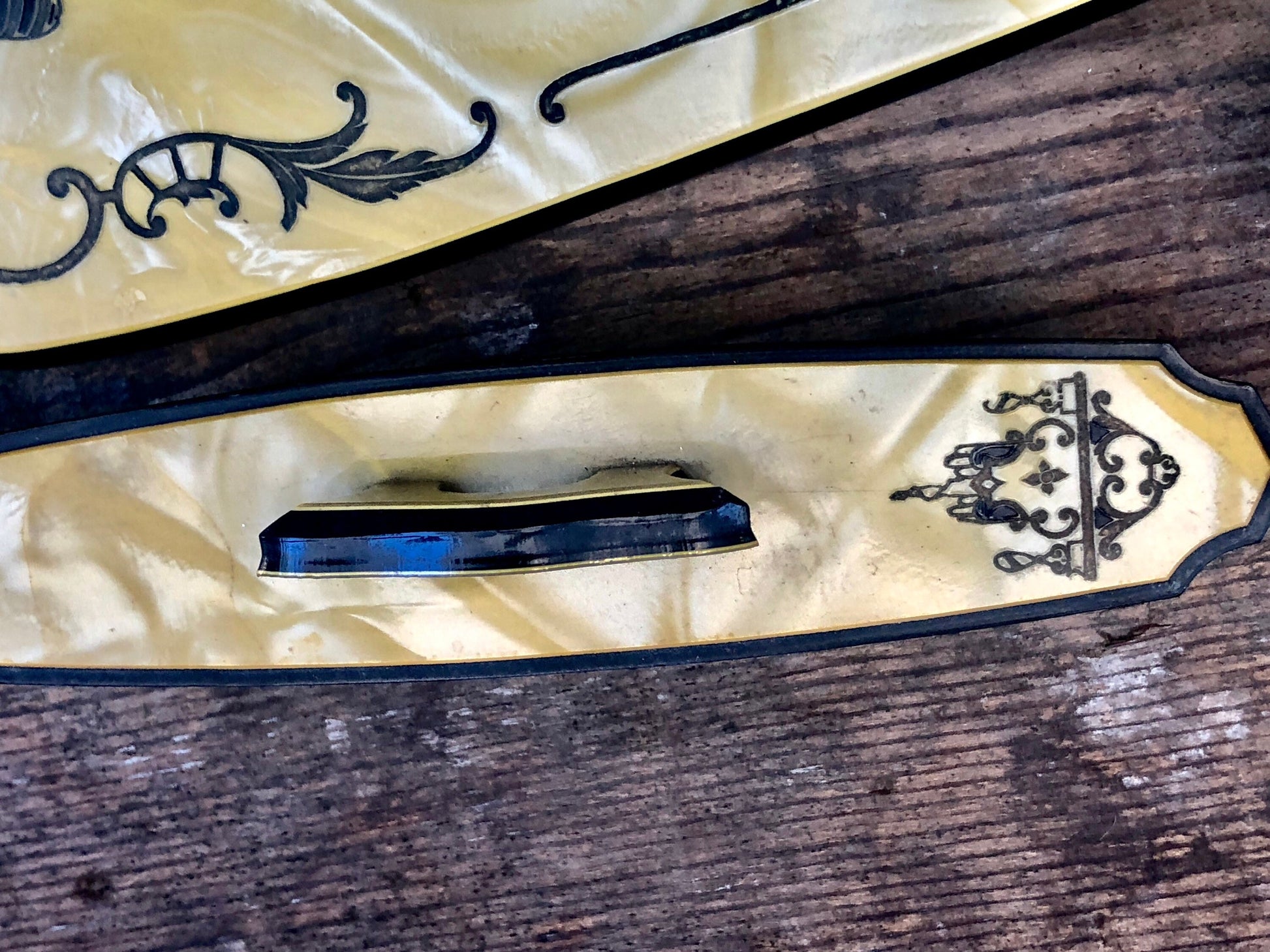 Antique Marbleized Cream & Black Art Nouveau Vanity Set : Mirror, Brush, Comb, Nail Buff, Boot Hook, Shoe Horn & More