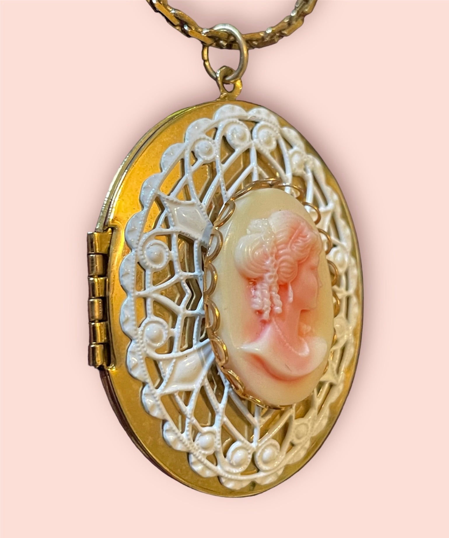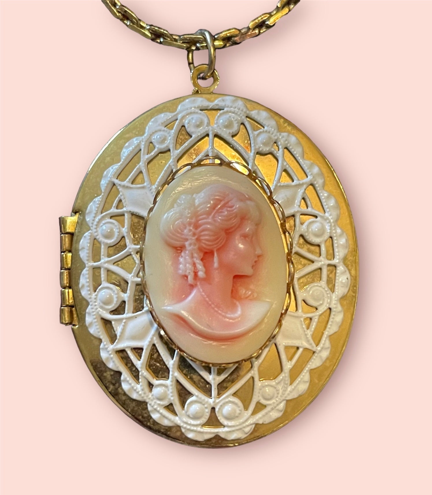 Pink & White Celluloid Lace Gold Cameo Vintage Locket Necklace
