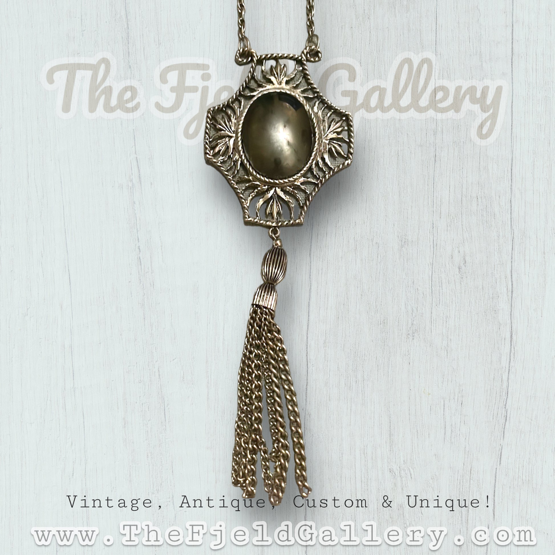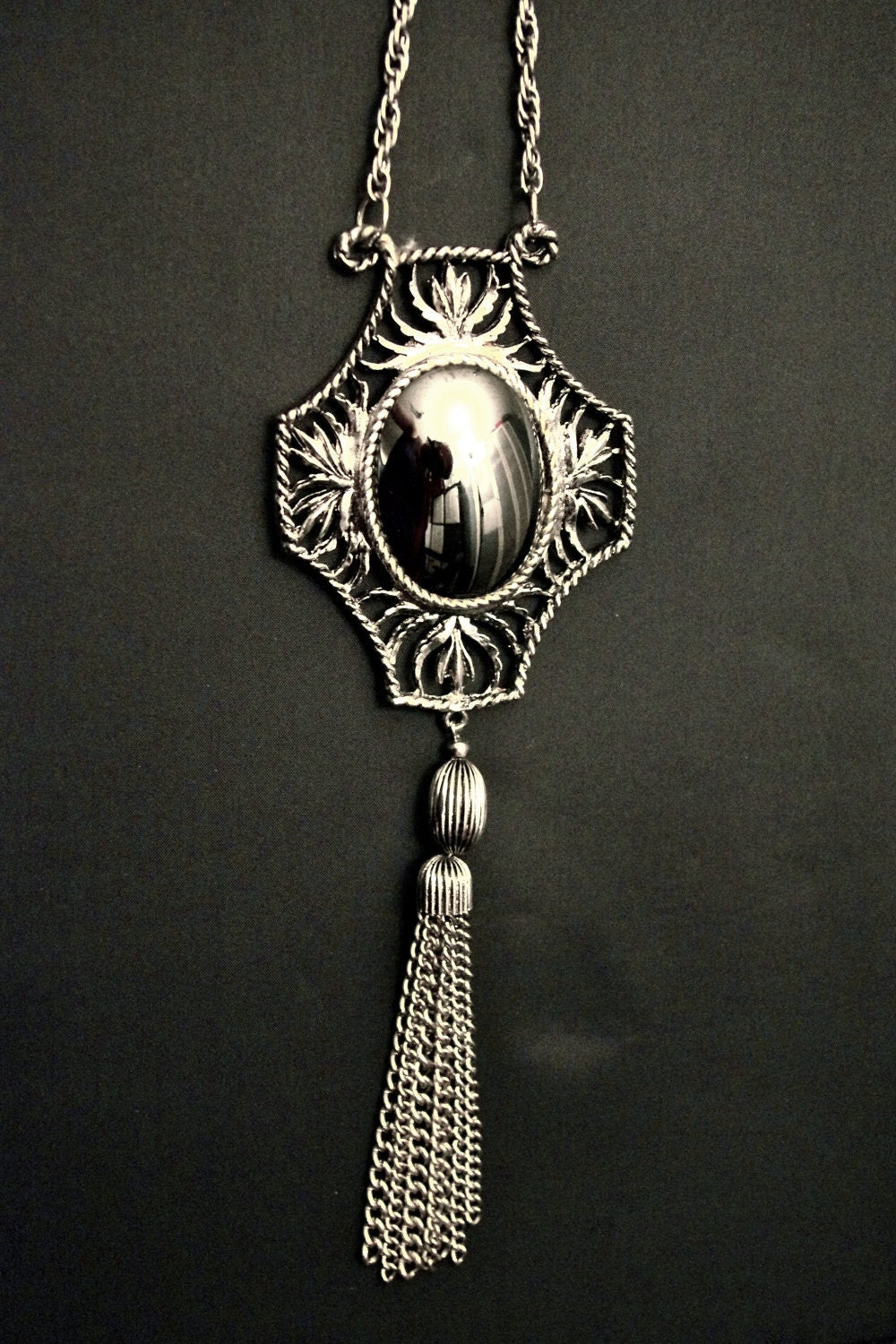 This is a very unique and beautiful chunky art deco necklace with a large 5 inch long silver filigree open work pendant with a giant hematite gemstone cabochon center! Below the main pendant is a tassel, which is very in right now. Chain is very long, and so the pendant can be worn as a lavaliere style long, or shortened at buyers request.