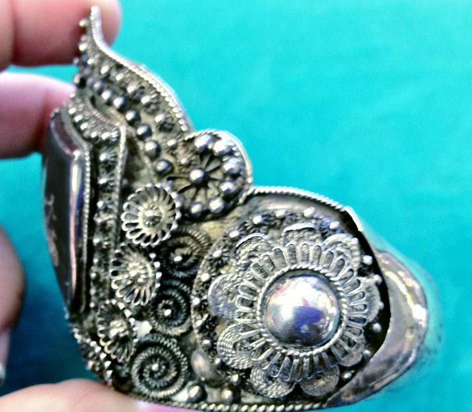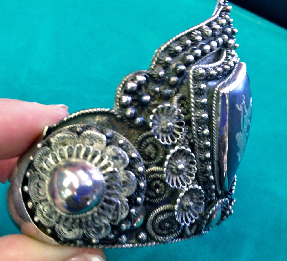 This is one of the most incredible bracelets I have ever seen! Siam Sterling silver Nielloware cuff bracelet covered in ornate filigree and open work that is multi dimensional. The craftsmanship on this bracelet is unmatched by anything I have ever seen in Nielloware pieces. Signed Siam Sterling on the back side, this is in amazing condition for it's age. Don't miss this piece, it is a one of a kind!