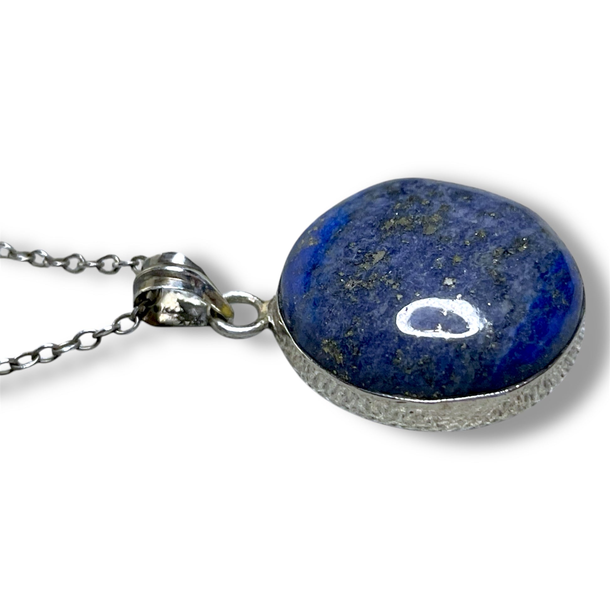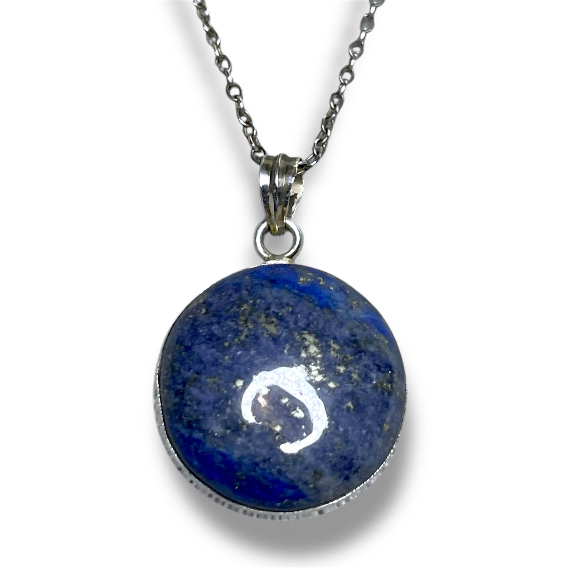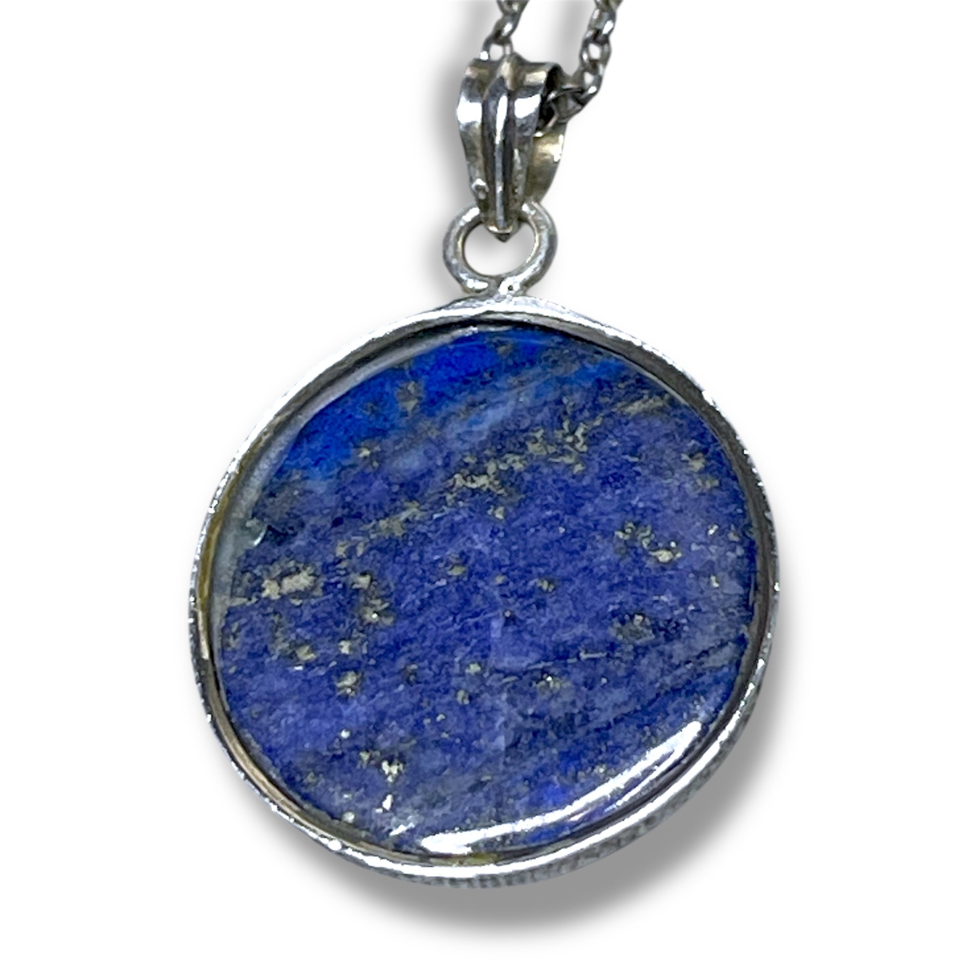 Round circle lapis lazuli gstone cabochon bezel set in sterling silver necklace pendant. Chain not included but sterling silver chains are available upon request for a small additional charge.