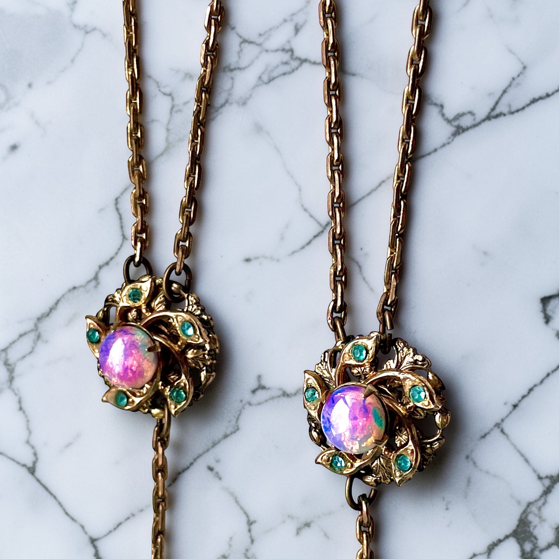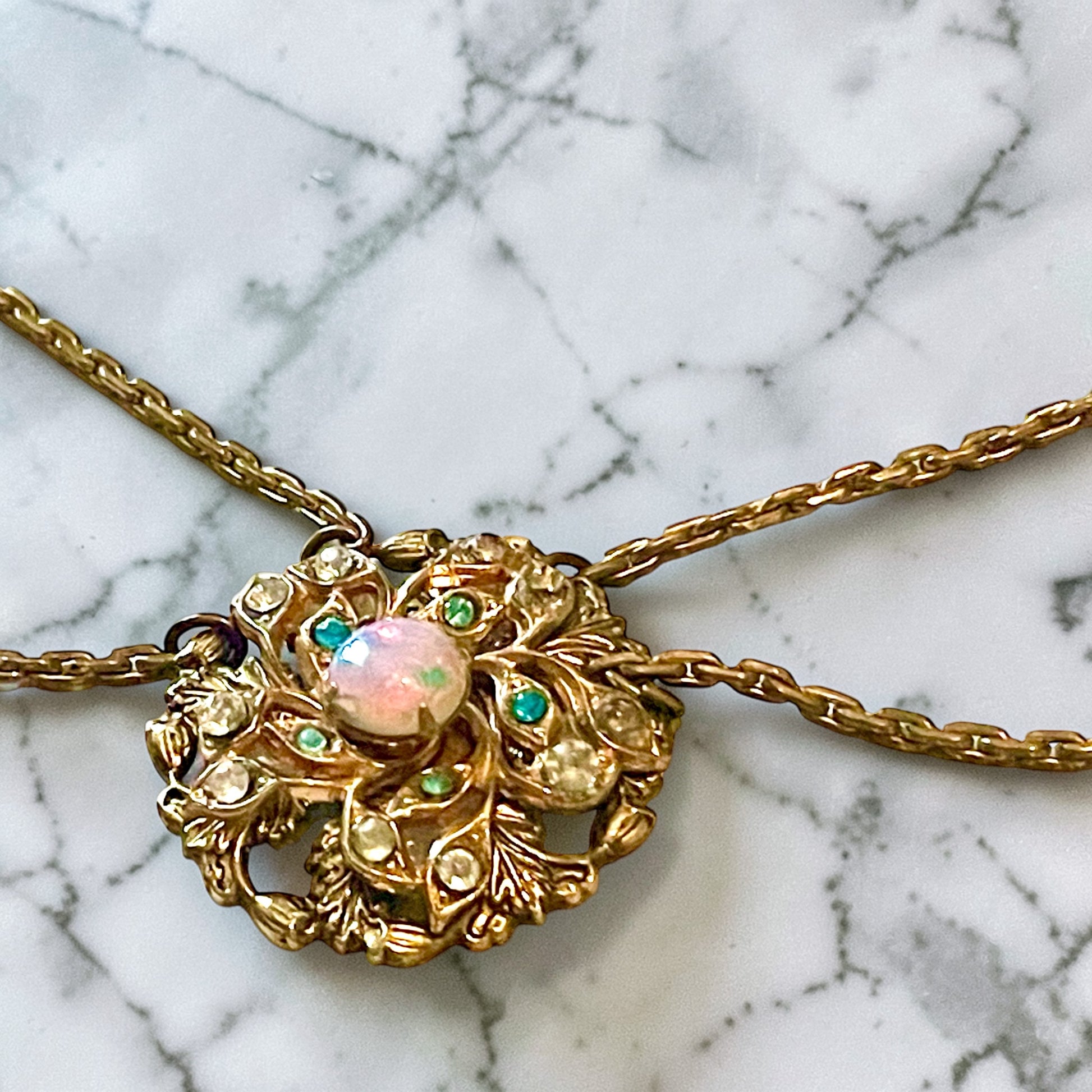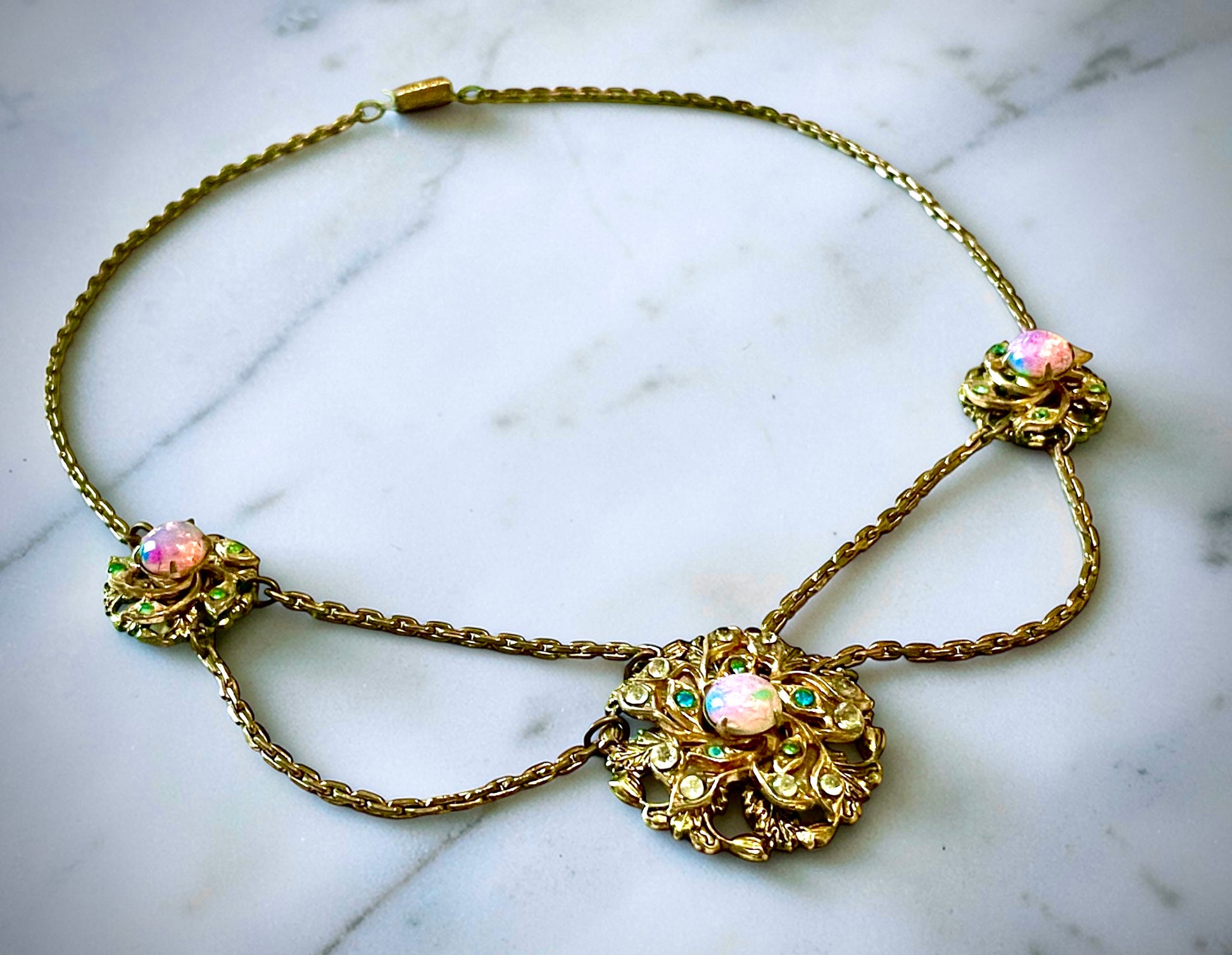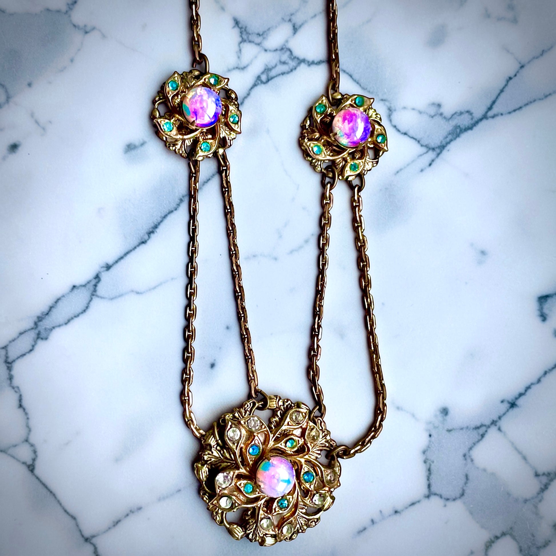 Incredibly gorgeous gold Art Nouveau festoon necklace with 3mm & 2mm round faceted white and teal blue crystal rhinestones and 3 pink dragons breath fire opal cabochons set in the center of 3 circular whirlpool starburst designs. Spring ring closure is secure. Incredible condition. Chain measures 17.5” from end to end. Central pendant measures 30mm in diameter top and bottom. All 3 pink fire opal cabochons are 8mm in diameter. Gilded brass floral stamped filigree box clasp is secure and in great condition.