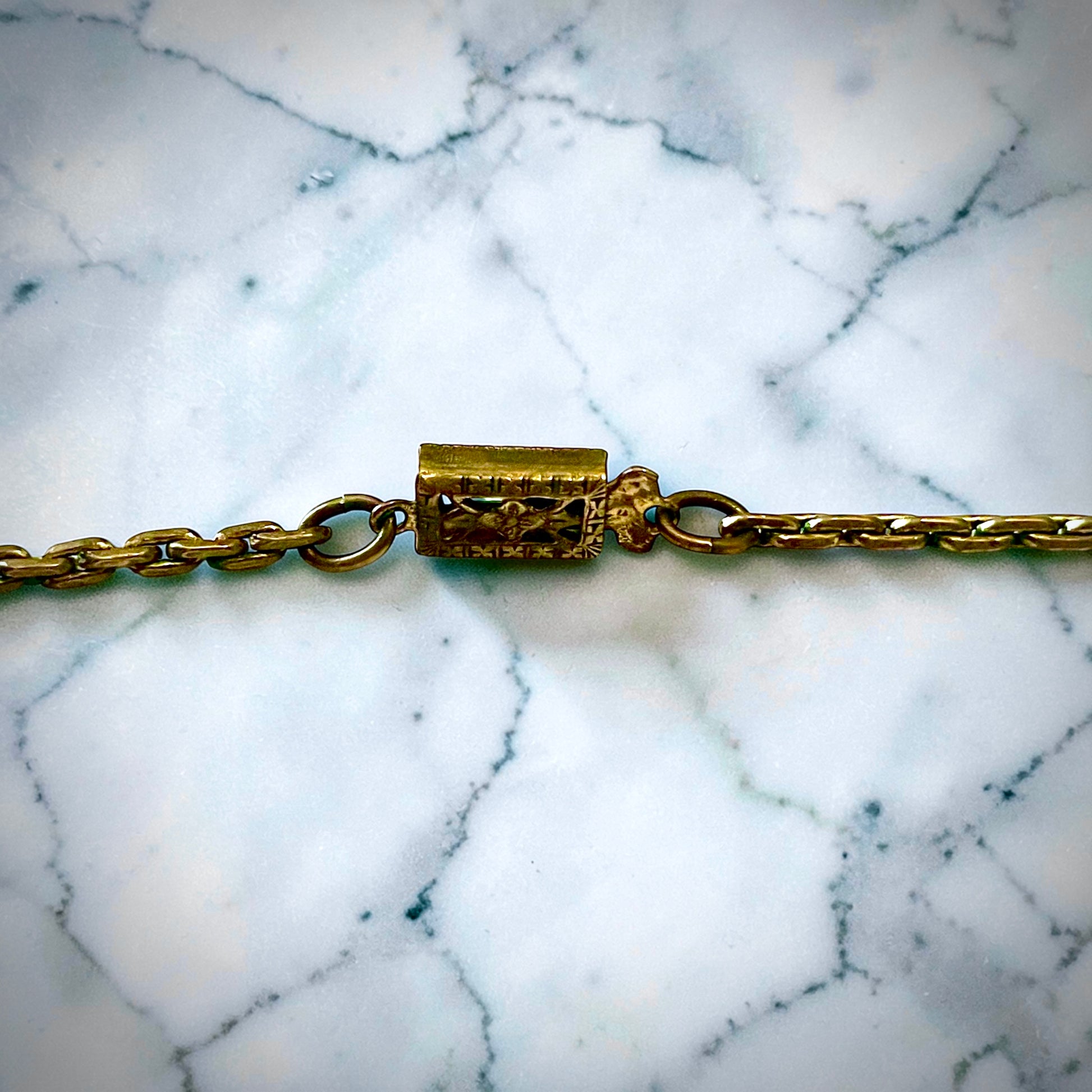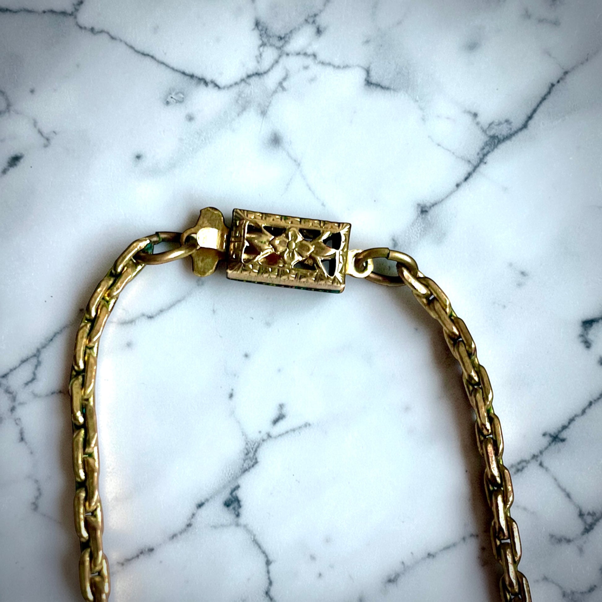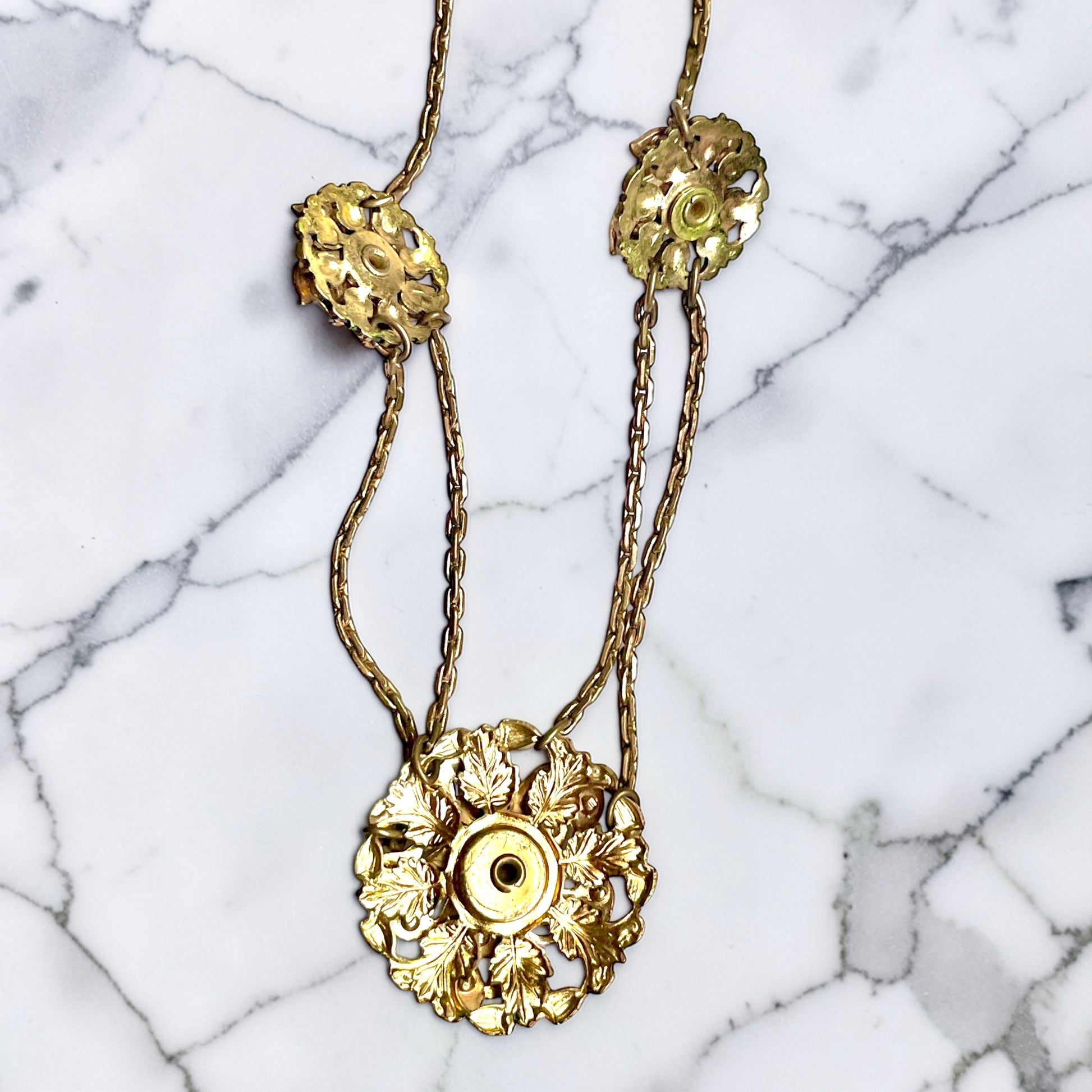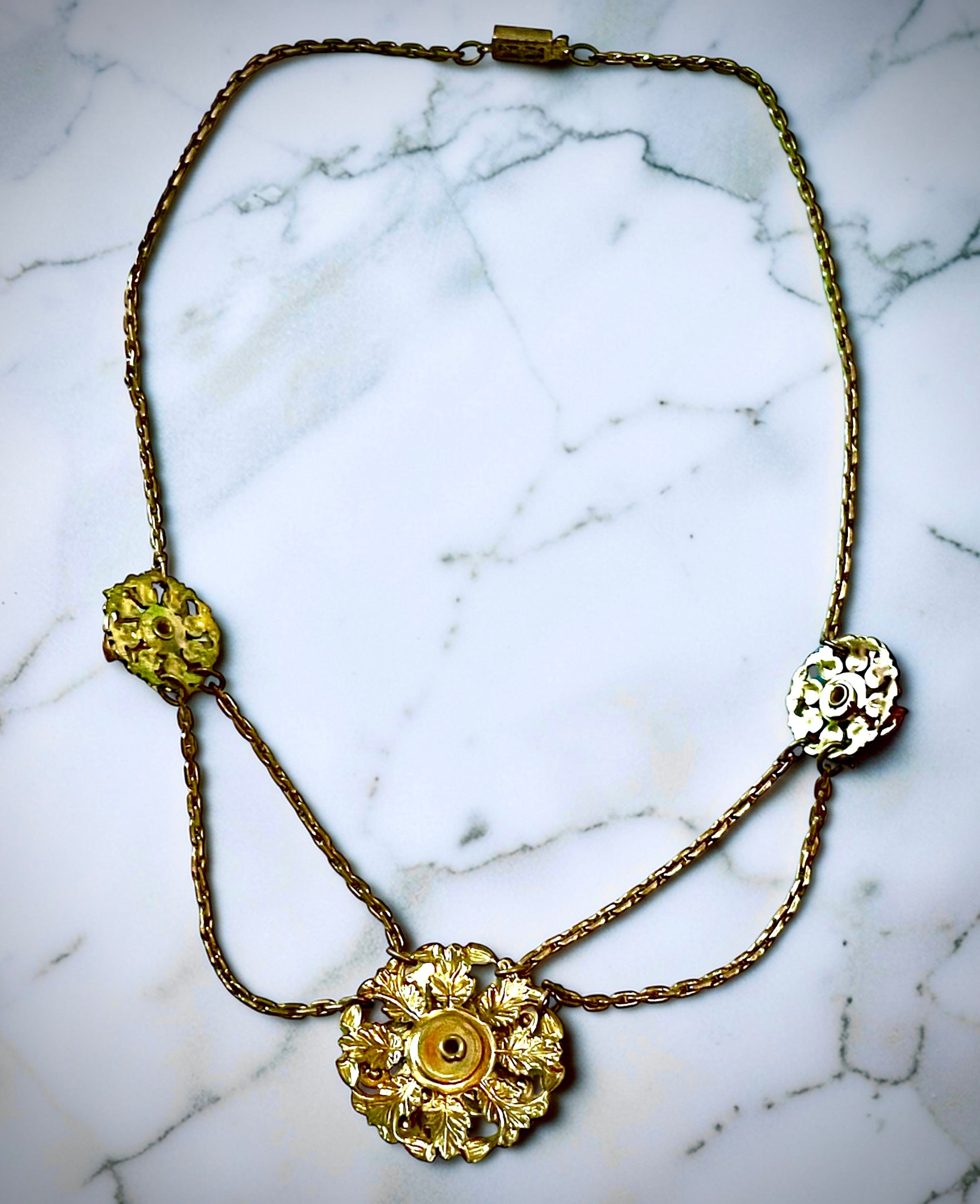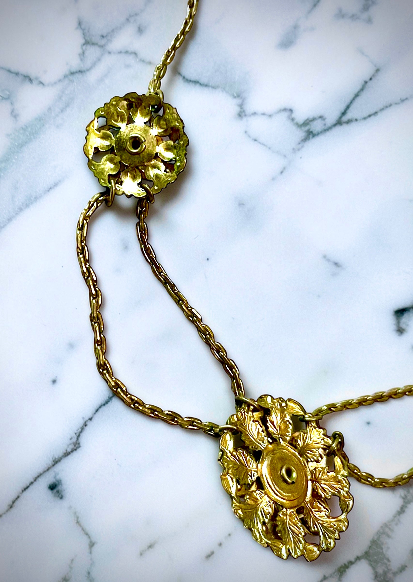 Incredibly gorgeous gold Art Nouveau festoon necklace with 3mm & 2mm round faceted white and teal blue crystal rhinestones and 3 pink dragons breath fire opal cabochons set in the center of 3 circular whirlpool starburst designs. Spring ring closure is secure. Incredible condition. Chain measures 17.5” from end to end. Central pendant measures 30mm in diameter top and bottom. All 3 pink fire opal cabochons are 8mm in diameter. Gilded brass floral stamped filigree box clasp is secure and in great condition.