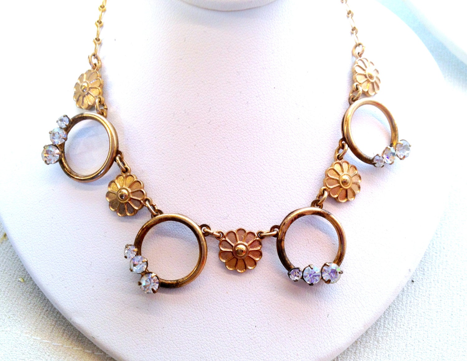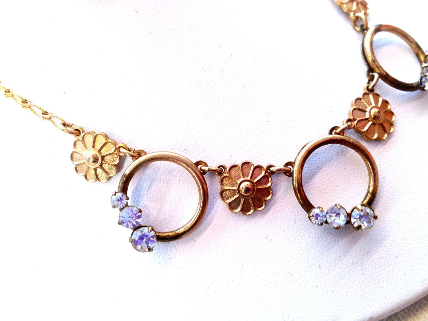 This is a very old piece in very good condition! A rolled gold embossed, extreemly detailed hand made chain with daisy charm links and circle's prong set with crystal. The chain on this piece is really awesome. More photo's available on request.