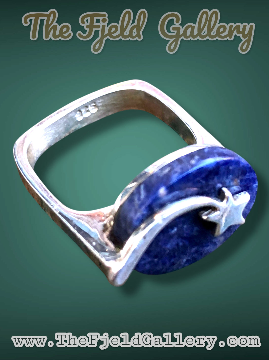 Vintage and unique, this sterling silver geometric square cast ring band (4mm) with an attached shooting star pressure setting. Oval blue lapis lazuli gemstone cabochon (18mm x 12mm) set in the pressure setting.
