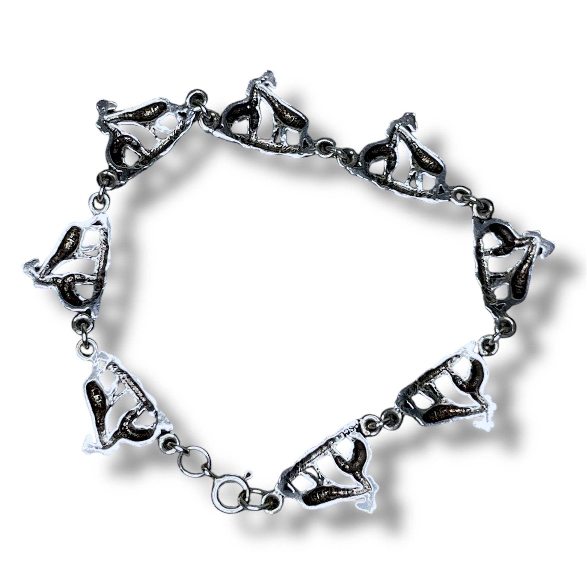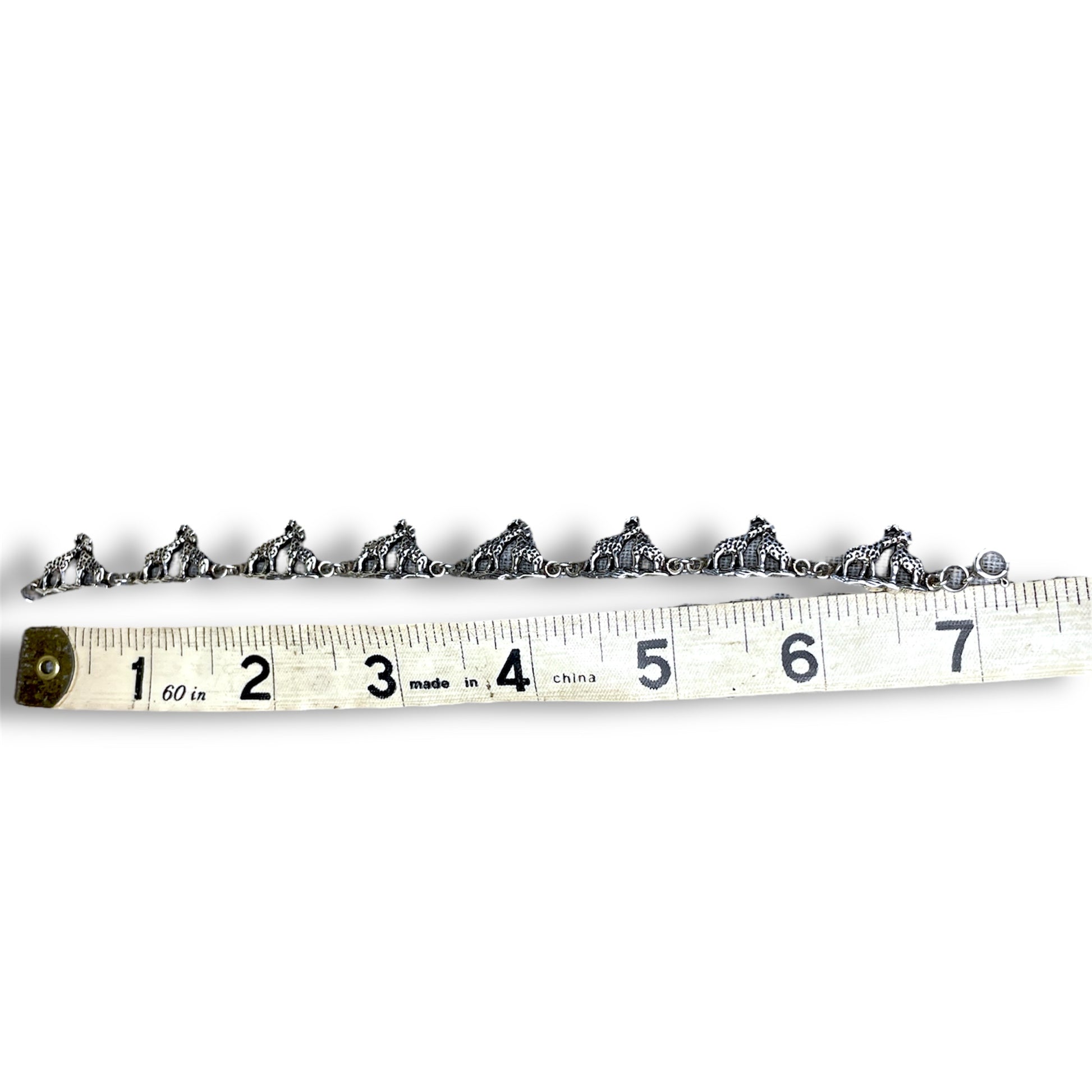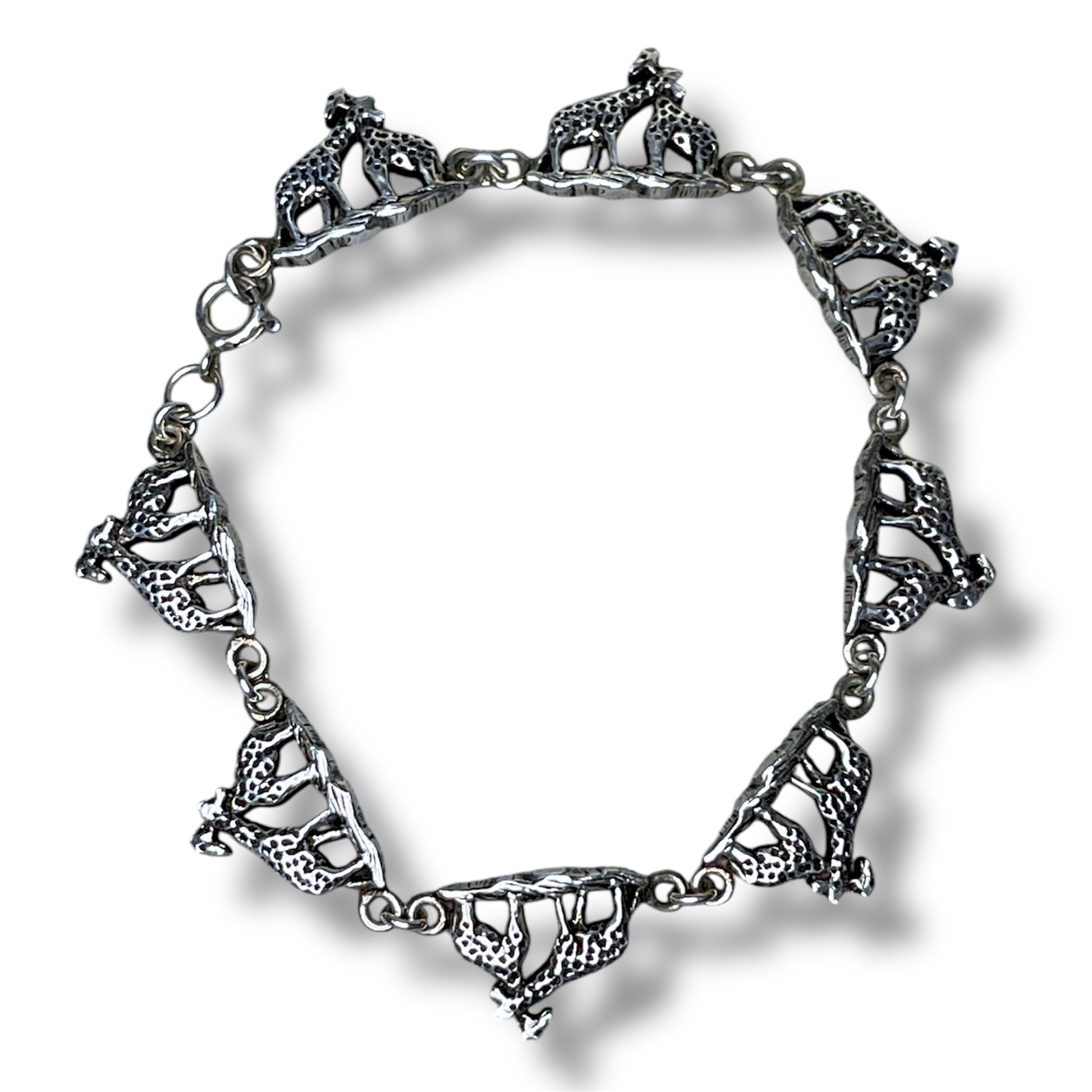 Adorable vintage sterling silver mother and child giraffe link bracelet. Measures 7.25 inches with a spring ring closure.