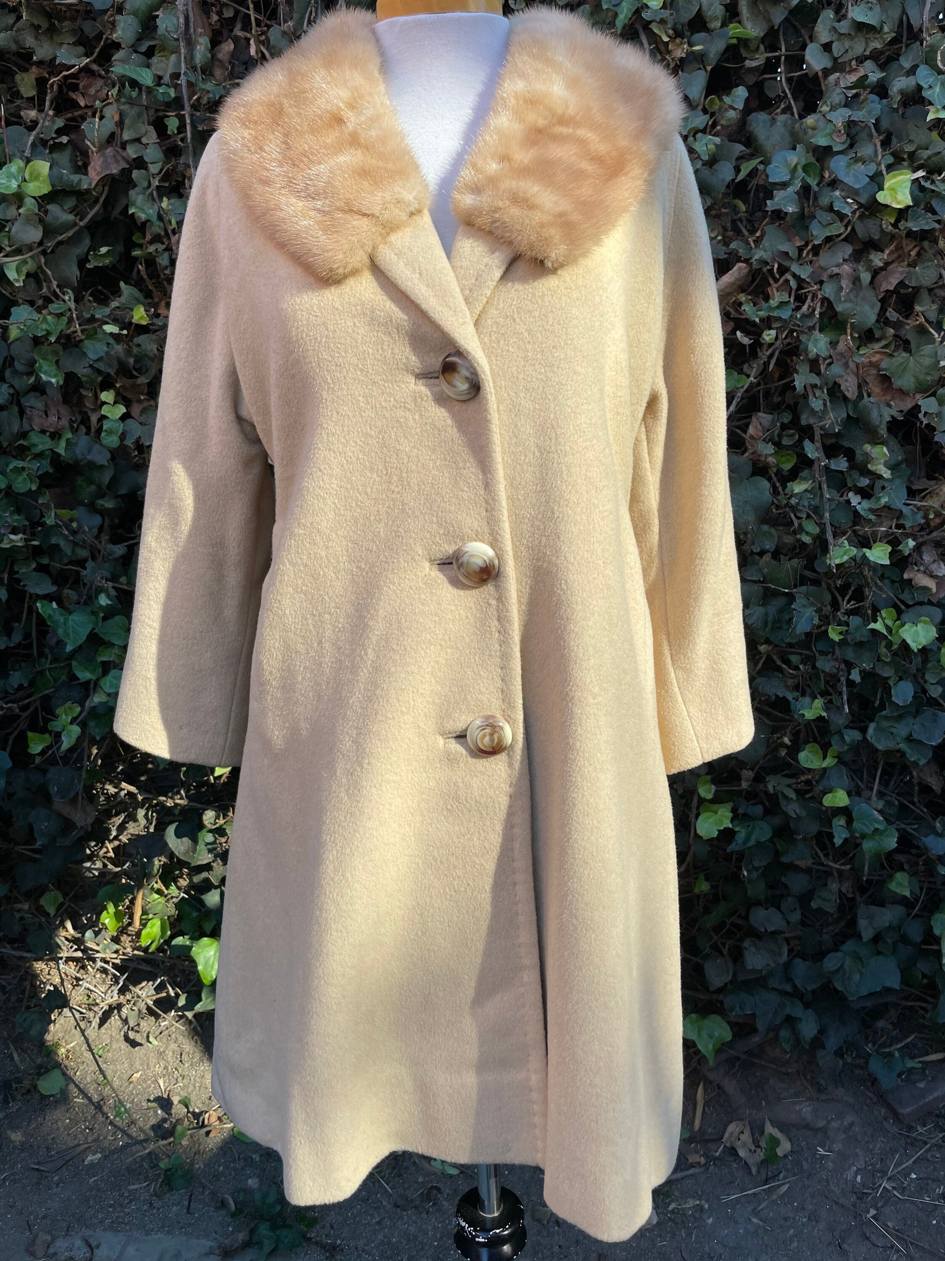 1960 Vintage Light Tan Camel Hair & Fur Collar Long Coat
