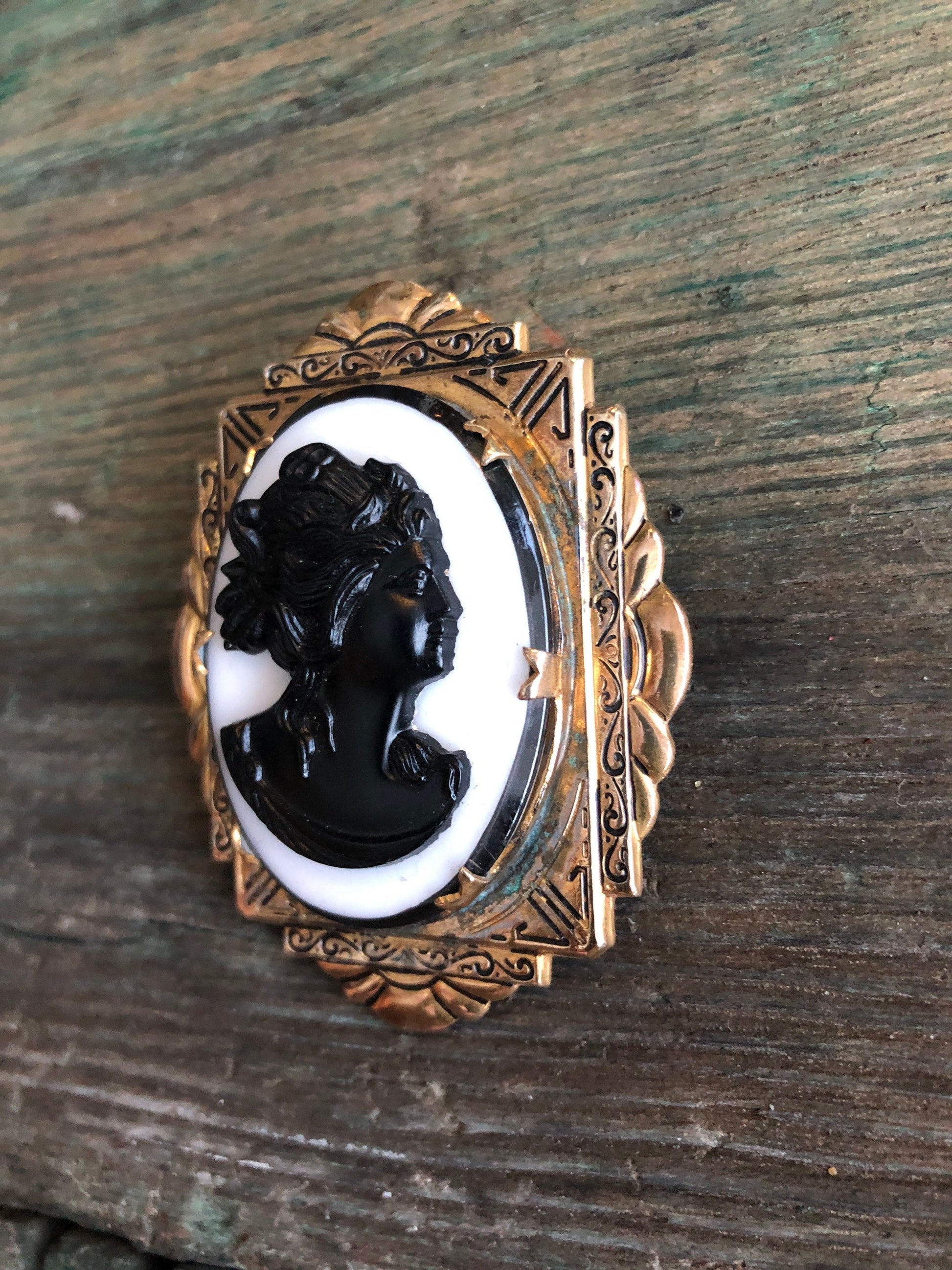 Antique White Milk Glass & Black Jet Glass Cameo Brooch. Very unique vintage gold filled setting with flourish and art nouveau design inlay. Cameo is fancy prong set.