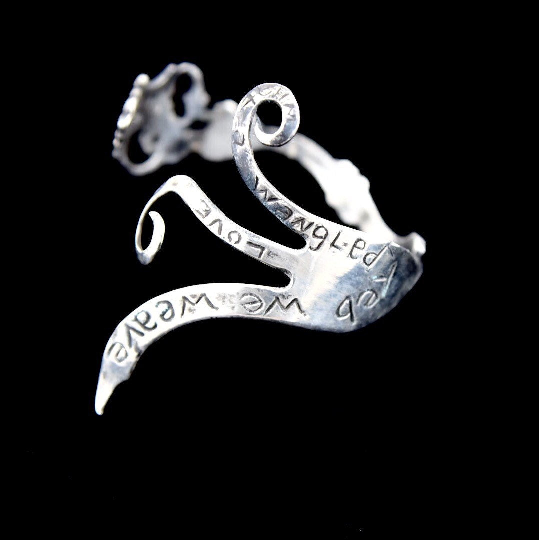 This is a hall marked with 830S a goblet NM and 407. I have not researched the hallmark. I purchased this antique Sterling fork in Norway from a purveyor of collectible silverware in Bergen. I have formed and domed it into a cuff bracelet and engraved it with the Edward Albee quote "What a wangled teb we weave" and the word LOVE.