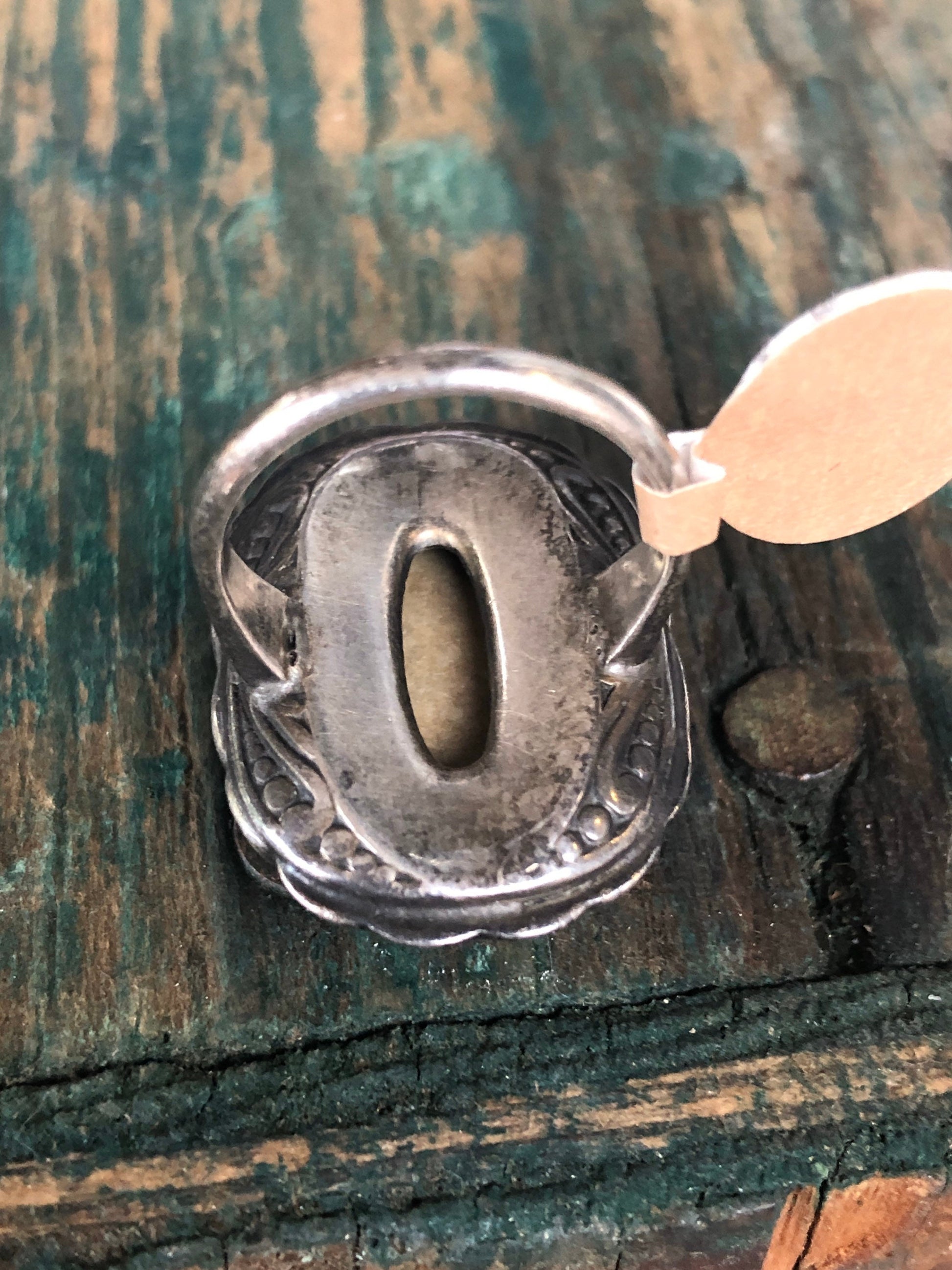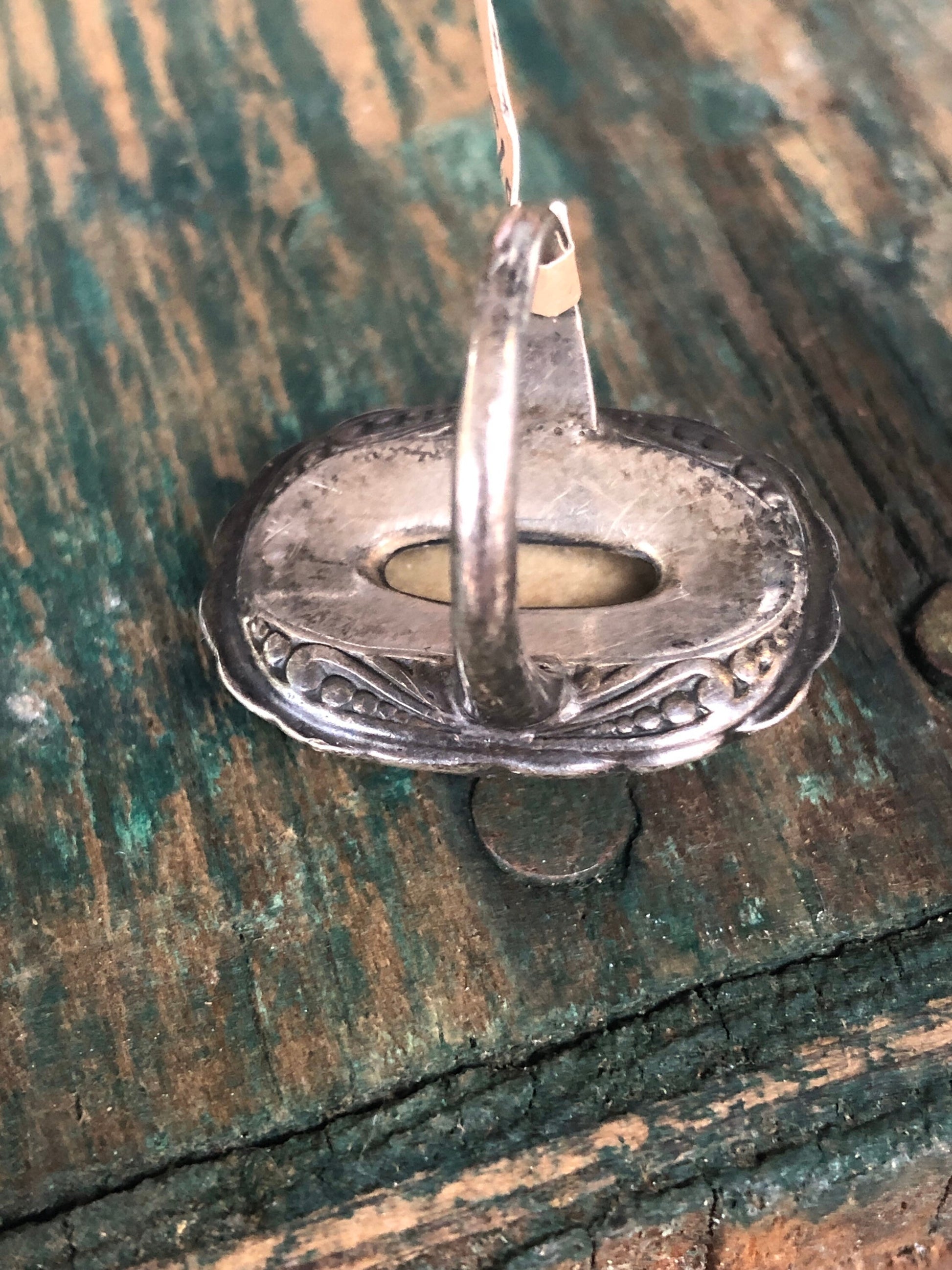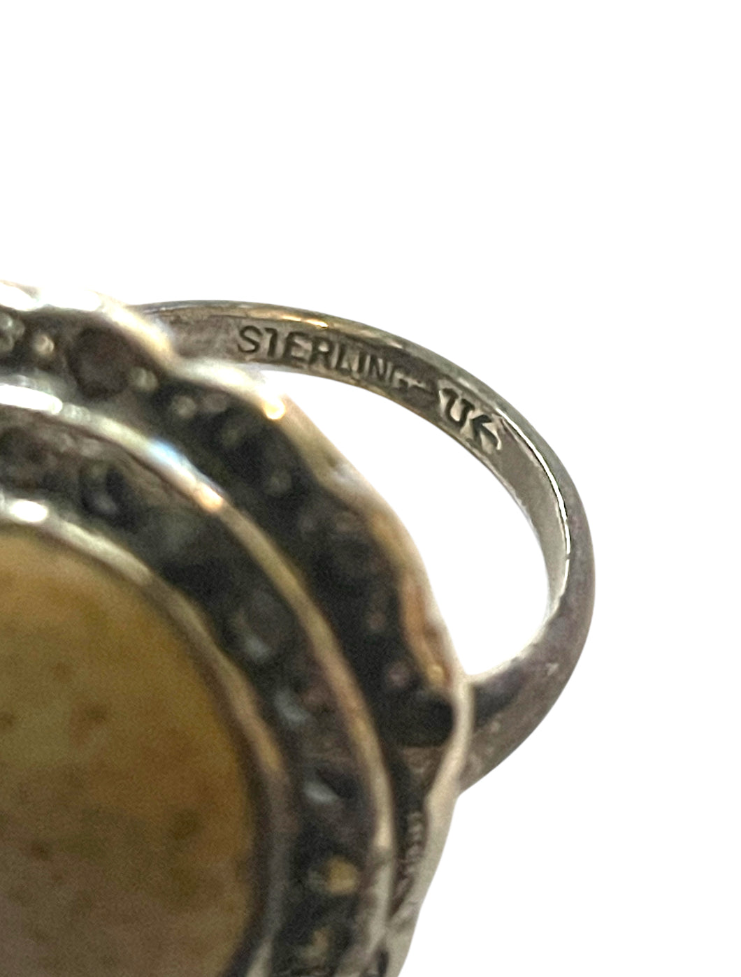 Art Deco Sterling and marcasite double layers setting with large beige and tan jasper gemstone bezel set. Under side of the ring is cast with nouveau scrolling detail. Inside of the band is marked STERLING and a U with arrows on both sides of the U which is the hallmark of the Uncas Mfg. Co. from Providence RI c.1920’s.