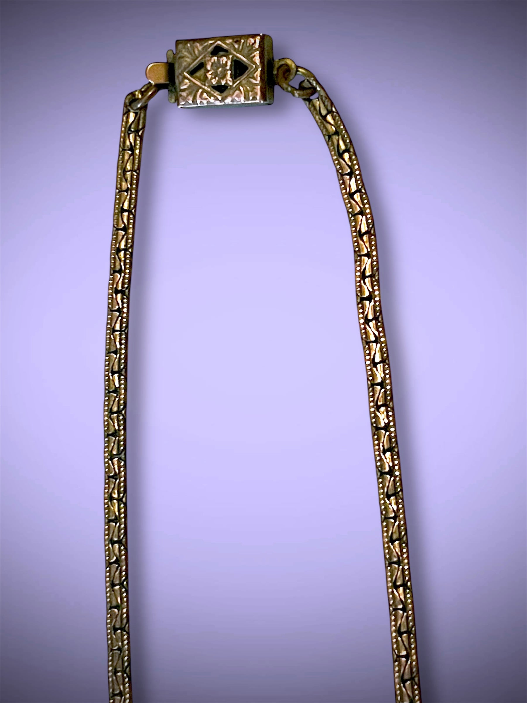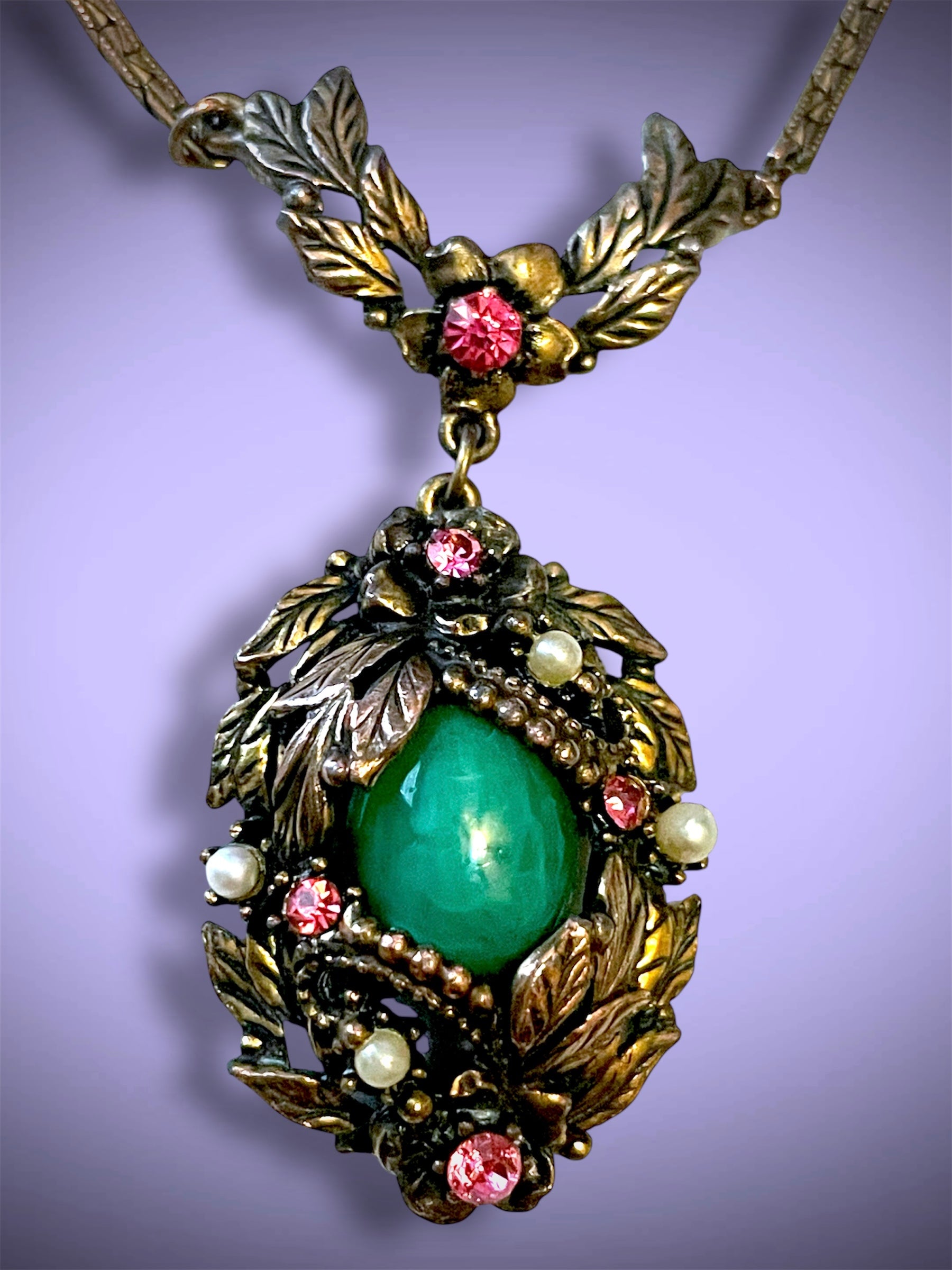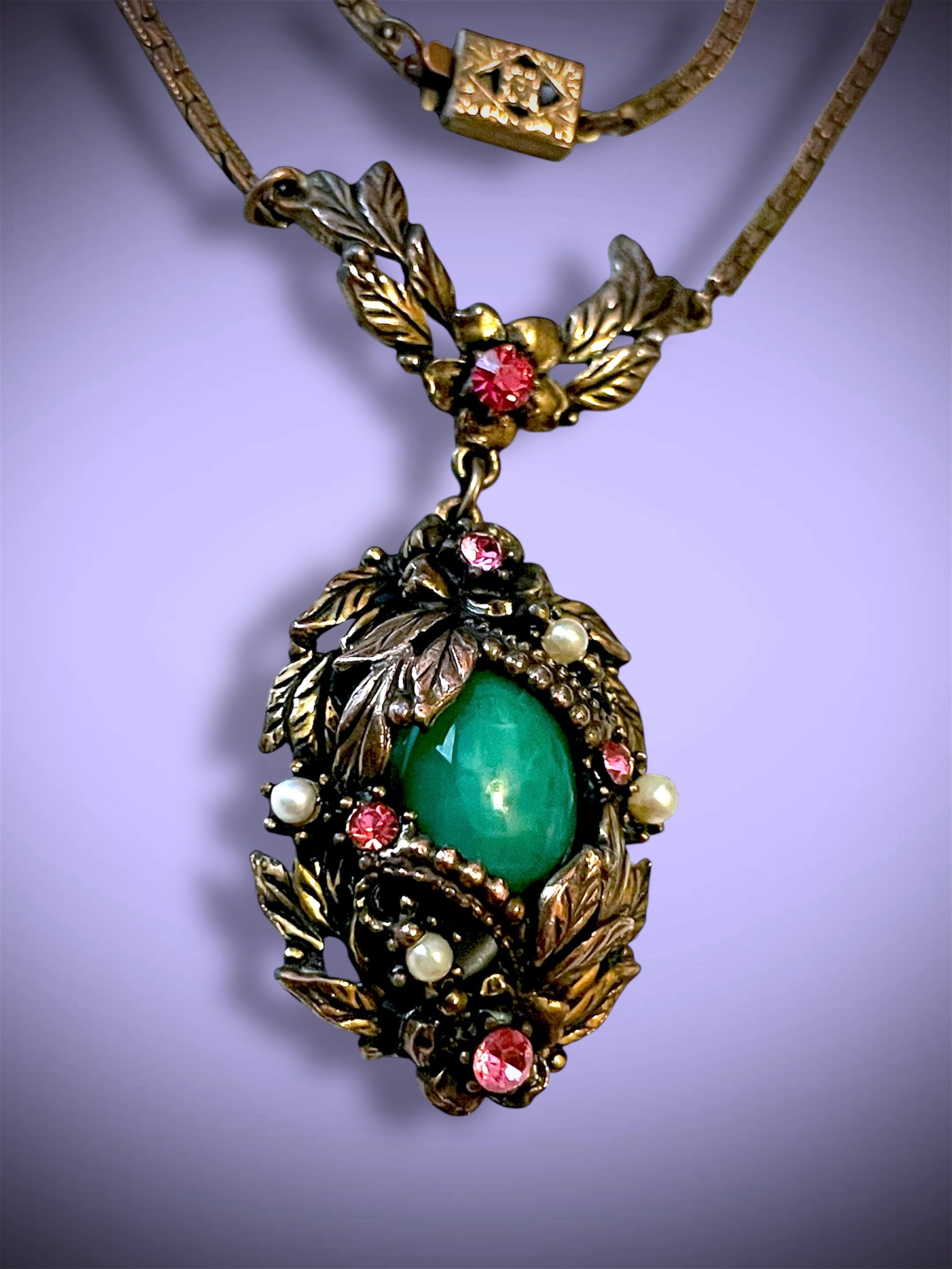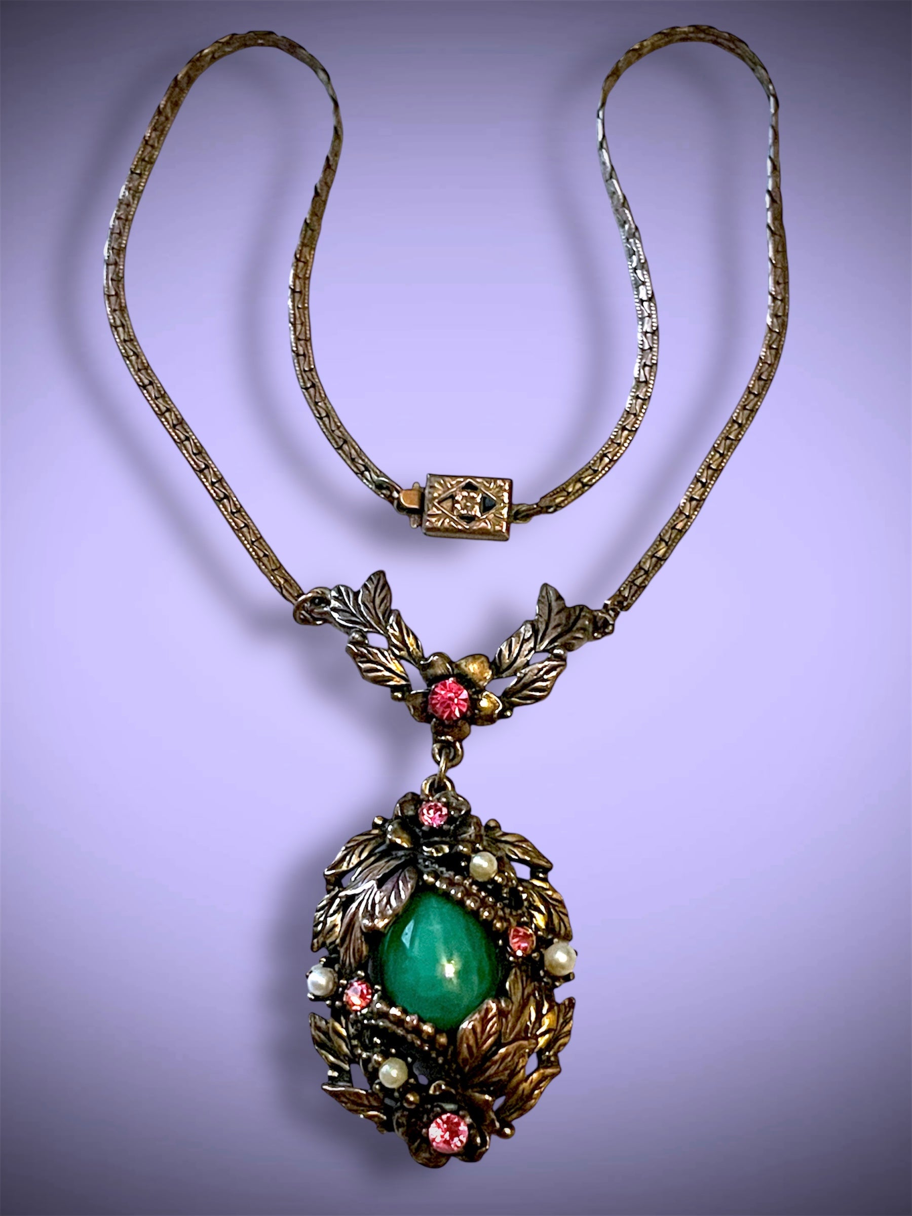 Absolutely stunning Art Nouveau jade peking art glass cabochon bezel set in a leaf garland brass stamped design and set with pink crystal faceted rhinestones and pearlettes. On a shiny gilded brass chain with a floral stamped box clasp.