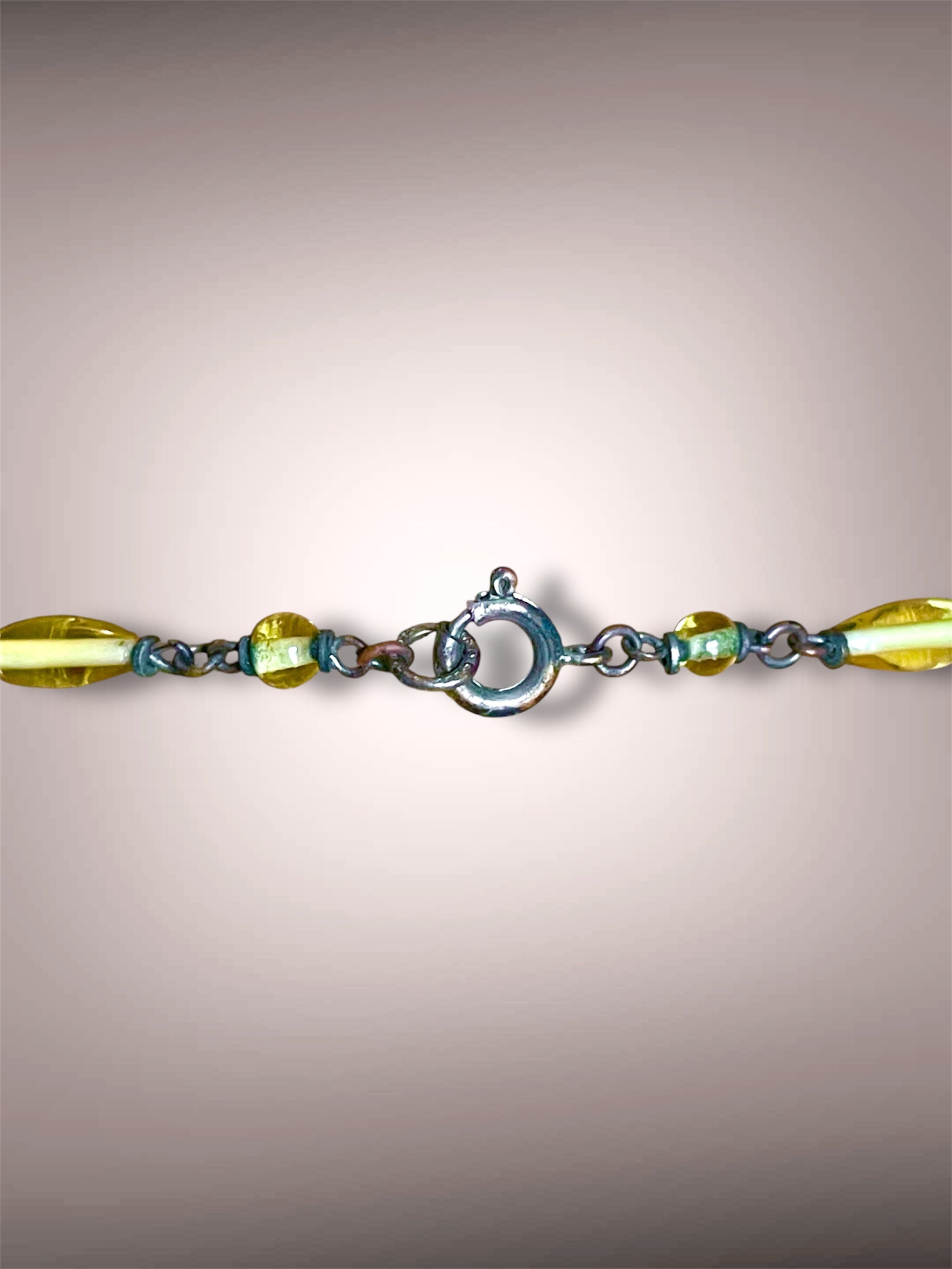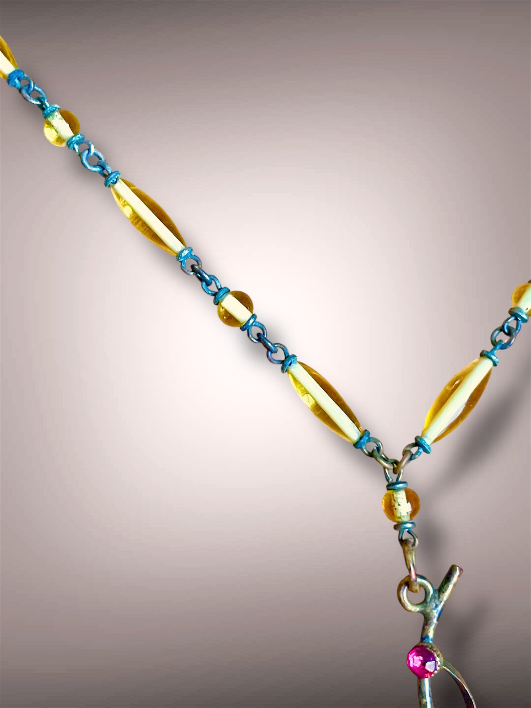 Absolutely gorgeous antique Art Nouveau cloisonné enamel yellow & purple daisy flower and green leaves set with pink crystal rhinestones and dropping from beautiful clear yellow art glass beads; wire strung chain. Closure is a spring ring and is stamped Made in Czechoslovakia. Chain is 18” long with an additional 3 inch Y drop including a connector bead and the pendant. Pendant is 2 1/4” ( 60mm) long and 1 1/8” (30mm) wide.