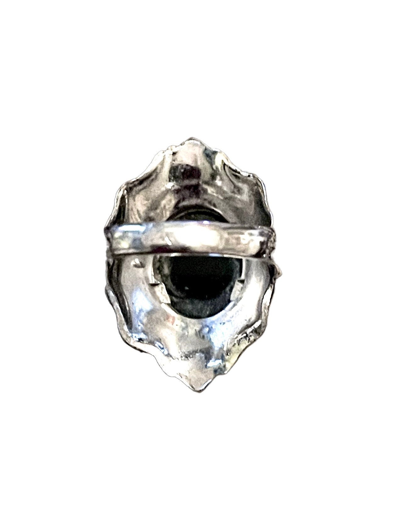 Gorgeous oval cut black onyx cabochon bezel set in a beautiful layered petal detail sterling silver setting with a marcasite set on each little overlapping petal.