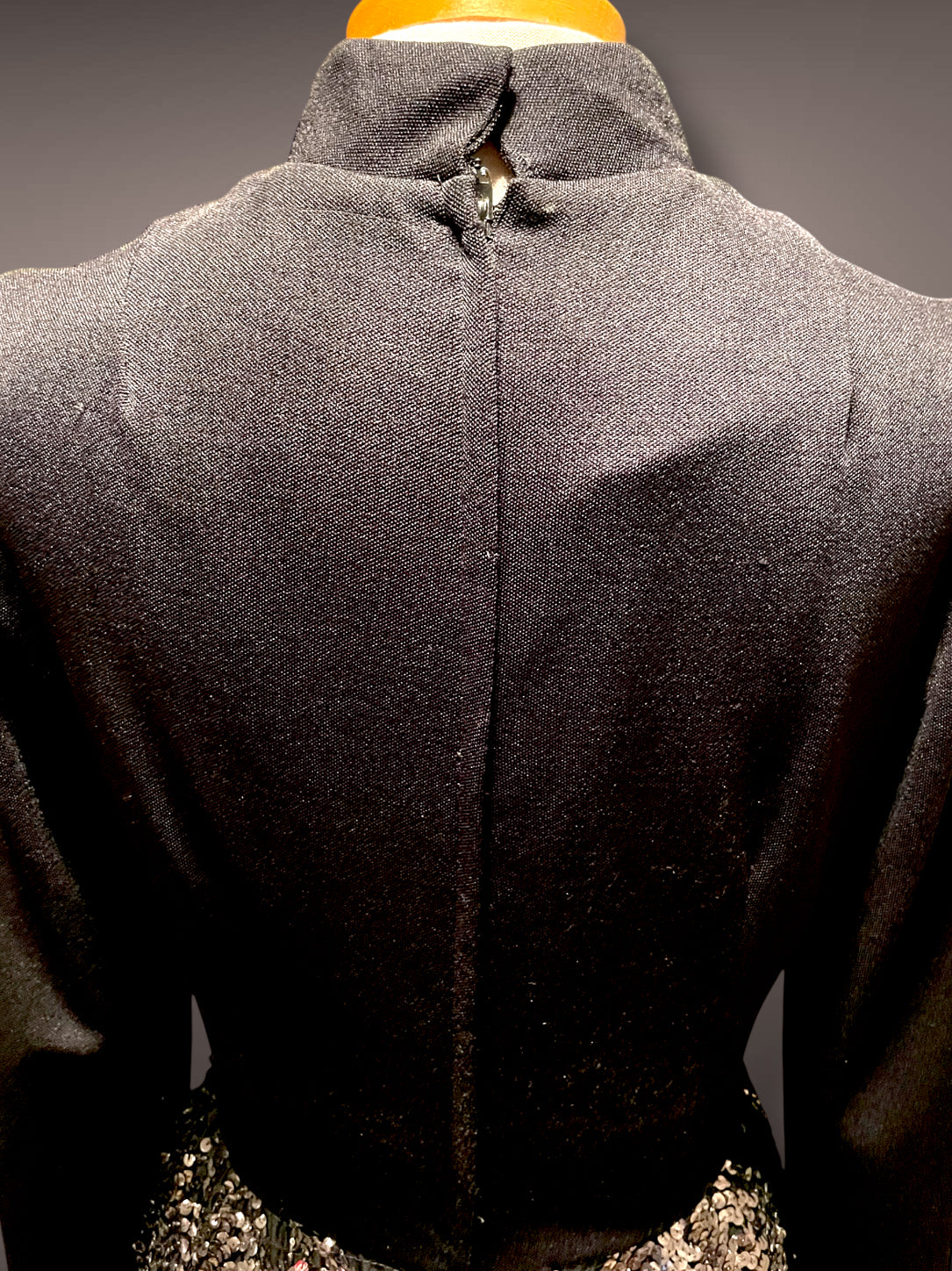 Absolutely astonishing vintage 1960’s designer black long sleeve and high neck Calderón maxi dress with multi metallic: silver, gold & copper sequin covered geometric chevron pattern skirt.  Has a hidden back zipper and double hook and eye neck closure.  Has no condition issues or damage.  Has a lining.