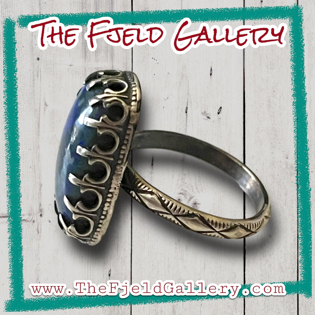 with bright green green flashes and even some red in certain lighting; bezel set in sterling silver. Featuring a fancy prong style bezel with a thin decorative sterling crosshatch embossed band.