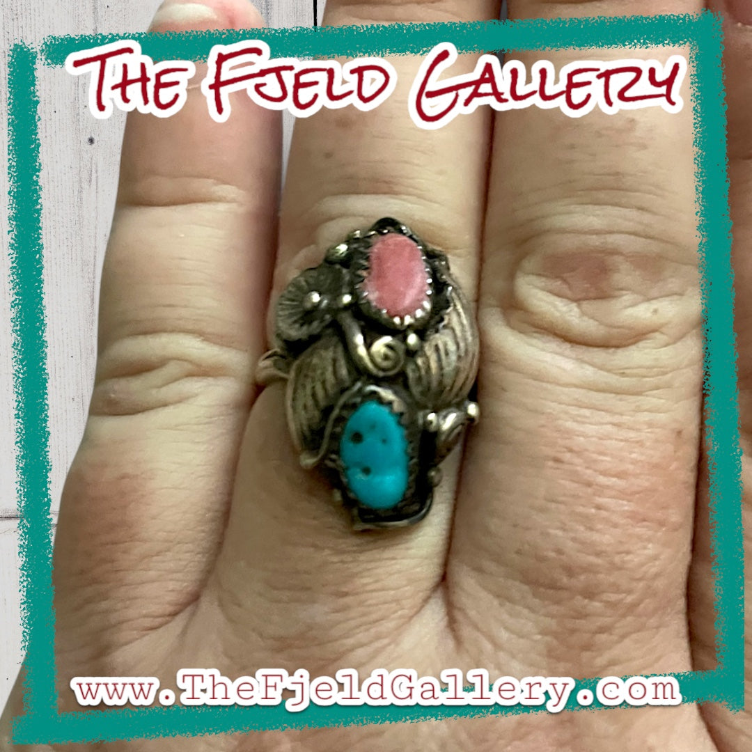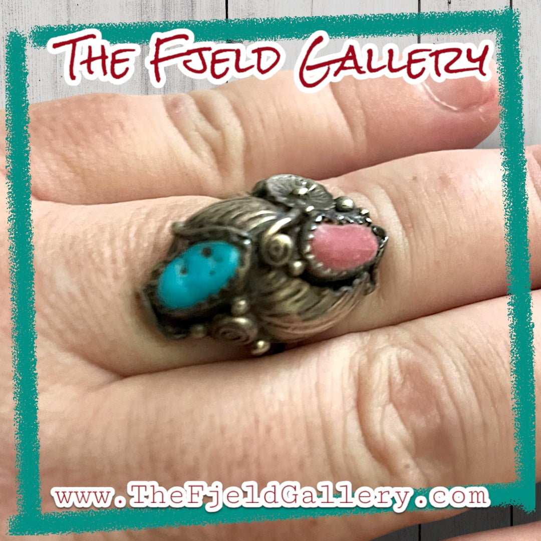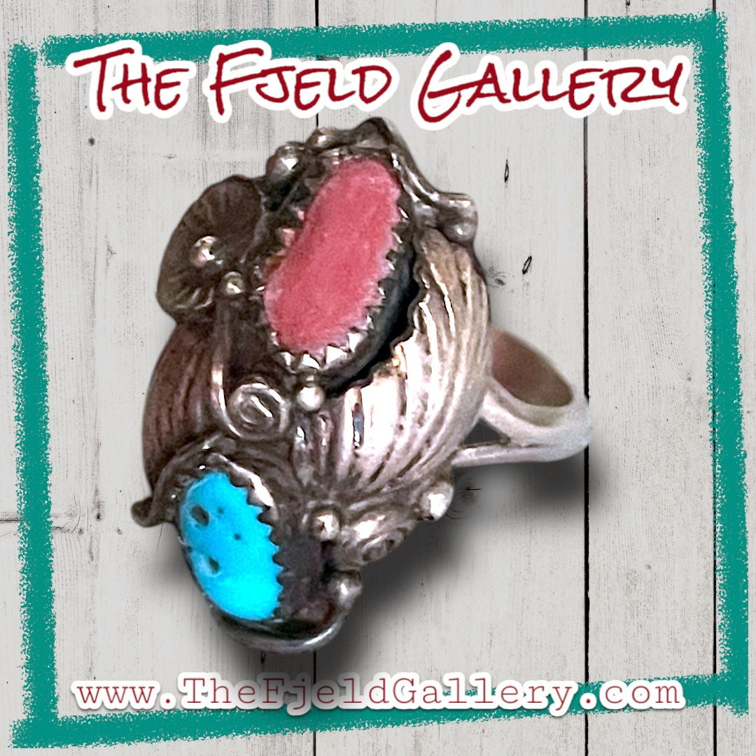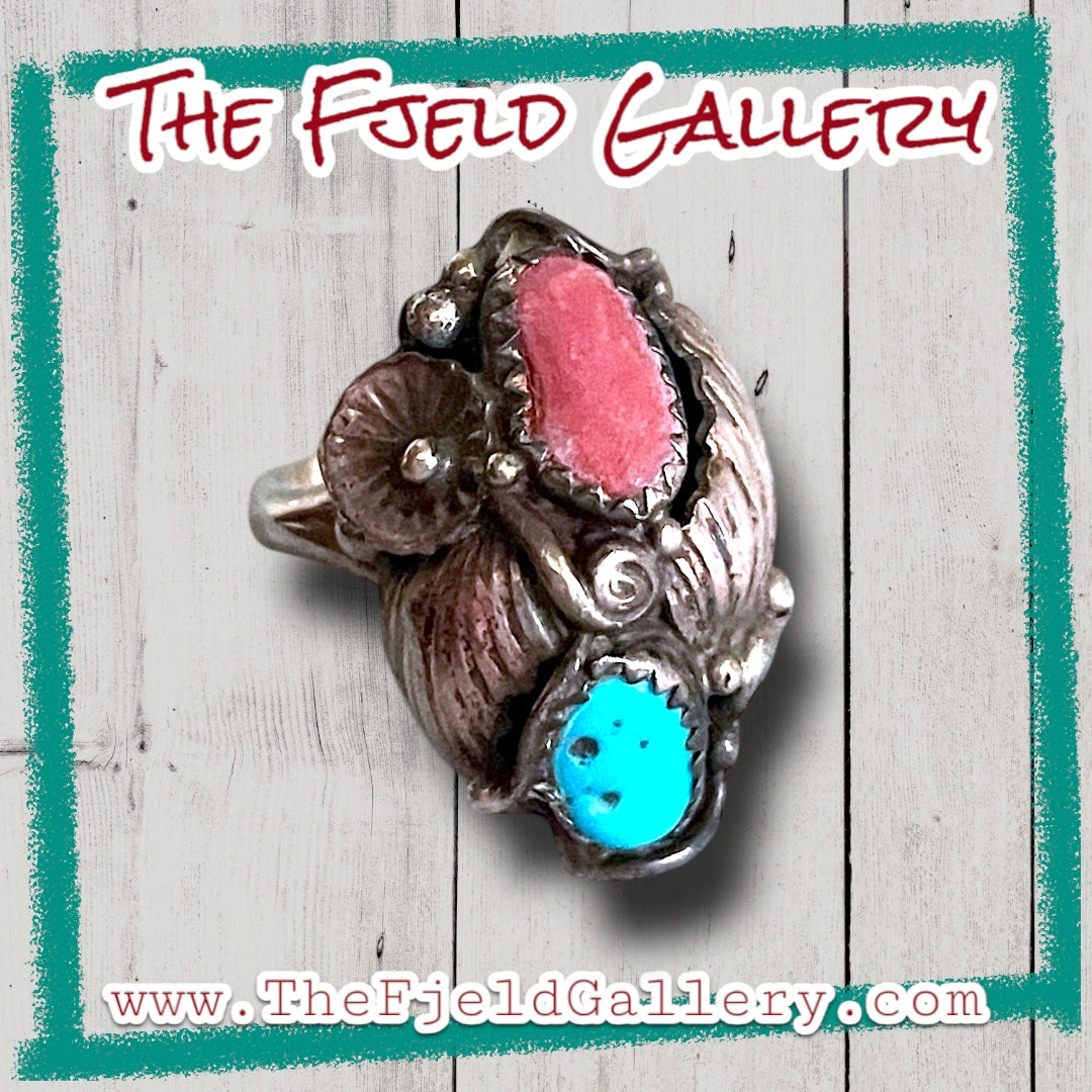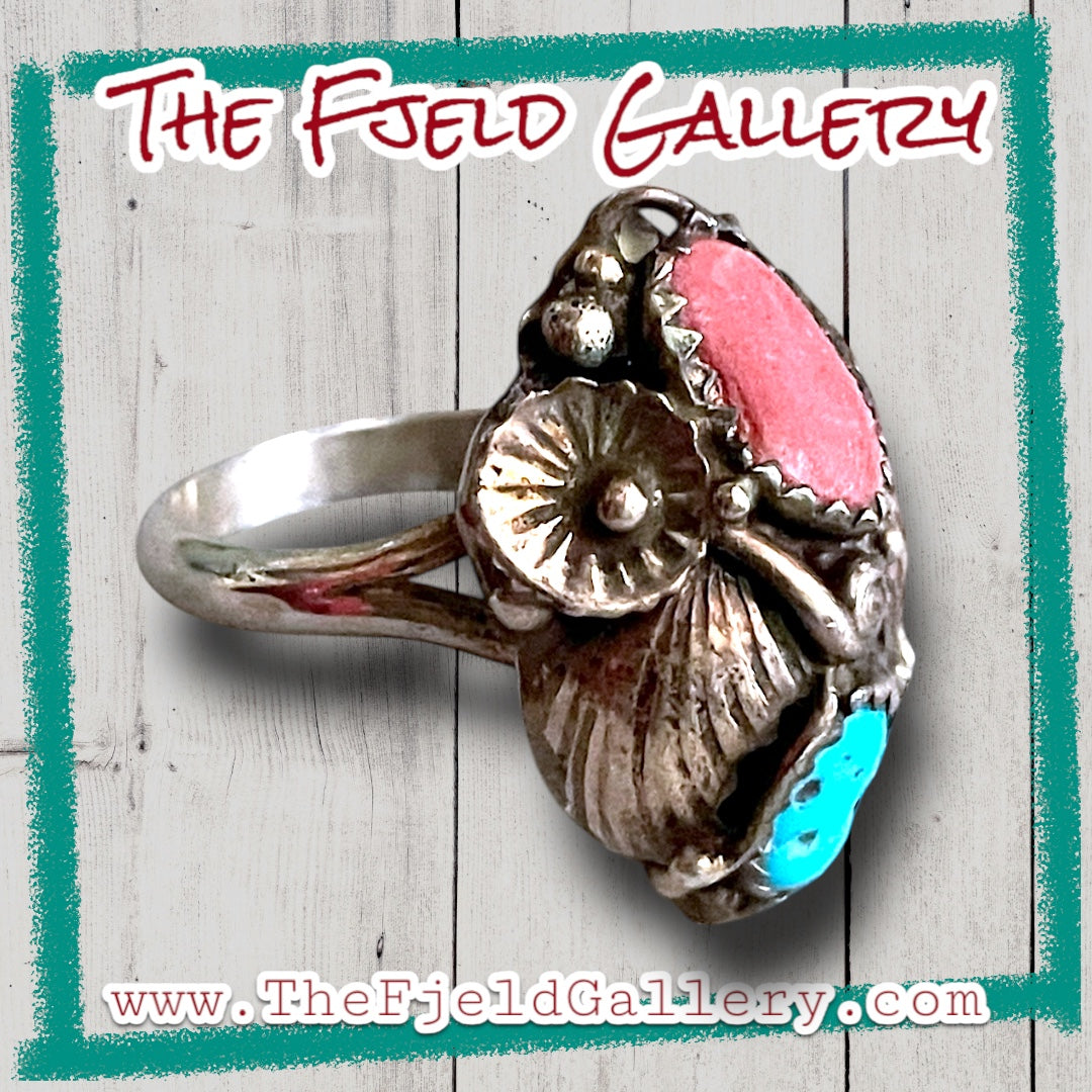 Beautiful sterling silver Native American ring with aerated bezel set turquoise and red coral cabochons surrounded by leaf and flower detailing. Size 7.5