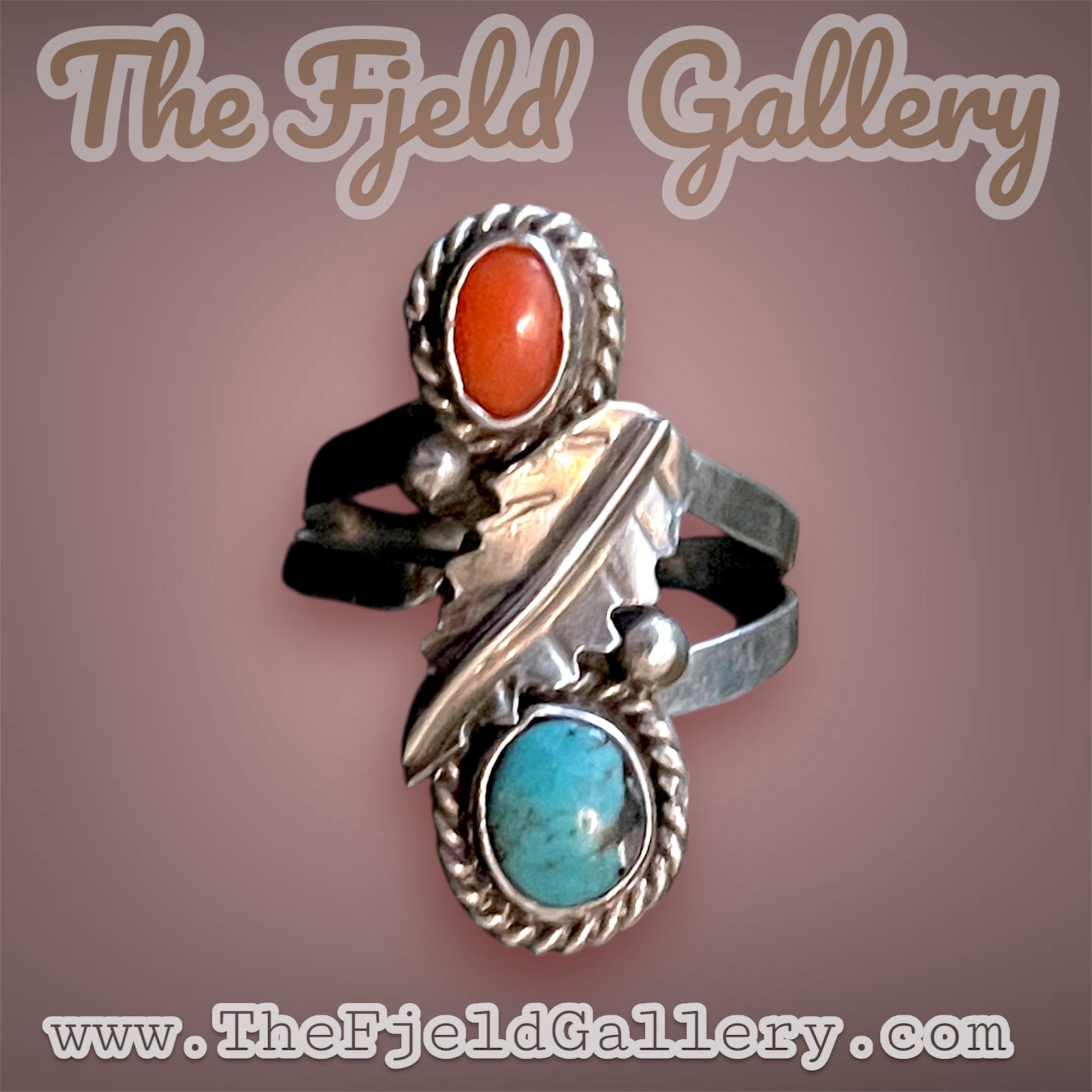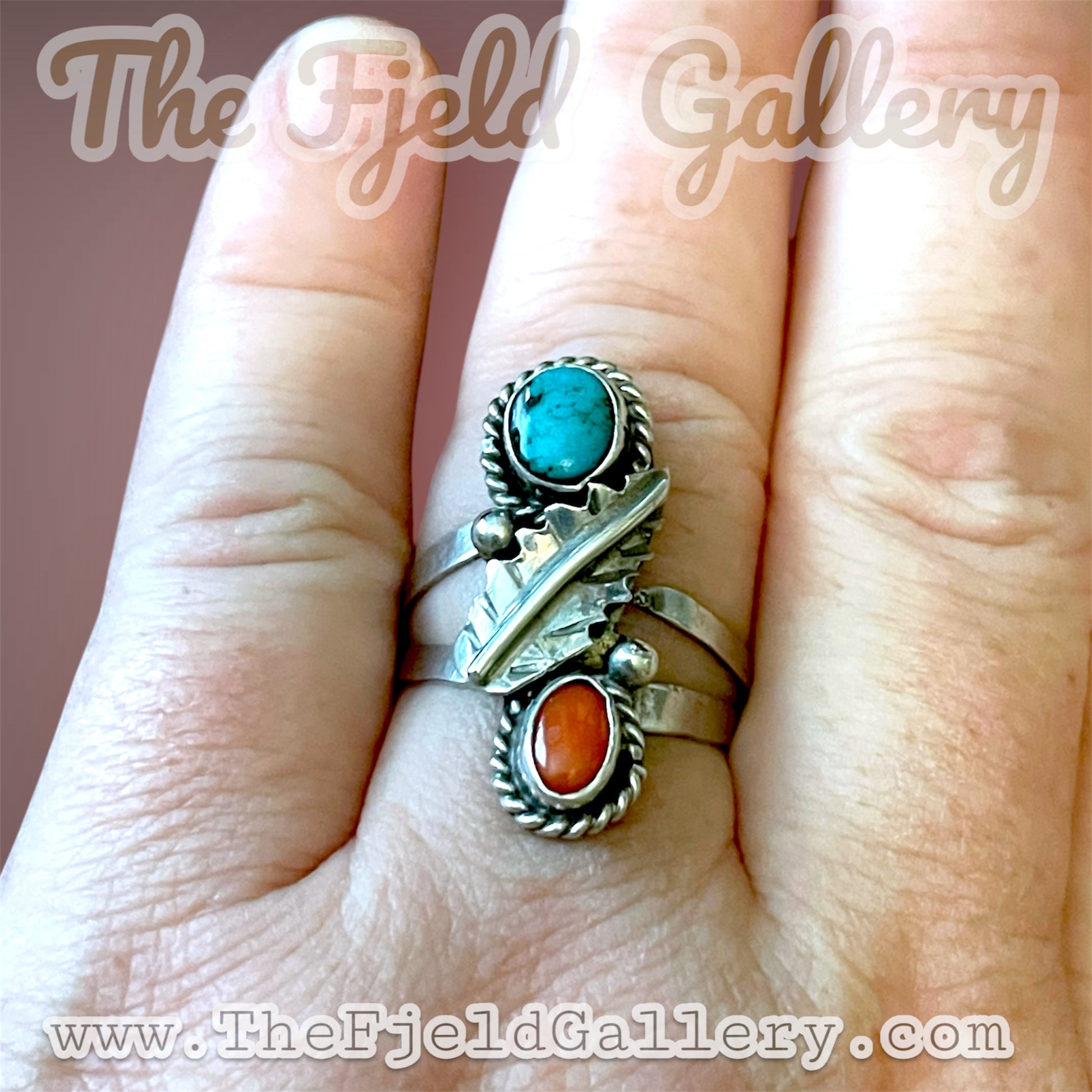 Beautiful vintage Native American sterling silver ring with a wrap bypass style double flat band. Bezel set turquoise and red coral gemstones cabochons on either side of the leaf detail.