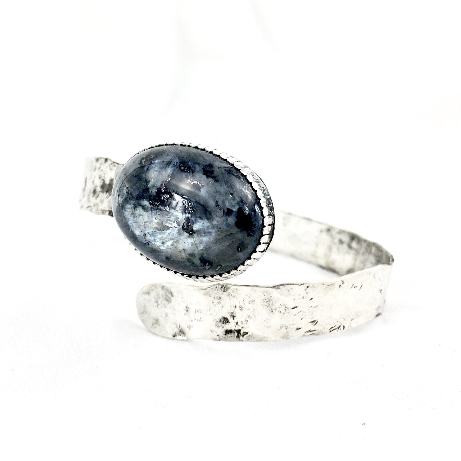 Norwegian Larvikite in Hand Hammered Sterling Coil Bypass Cuff