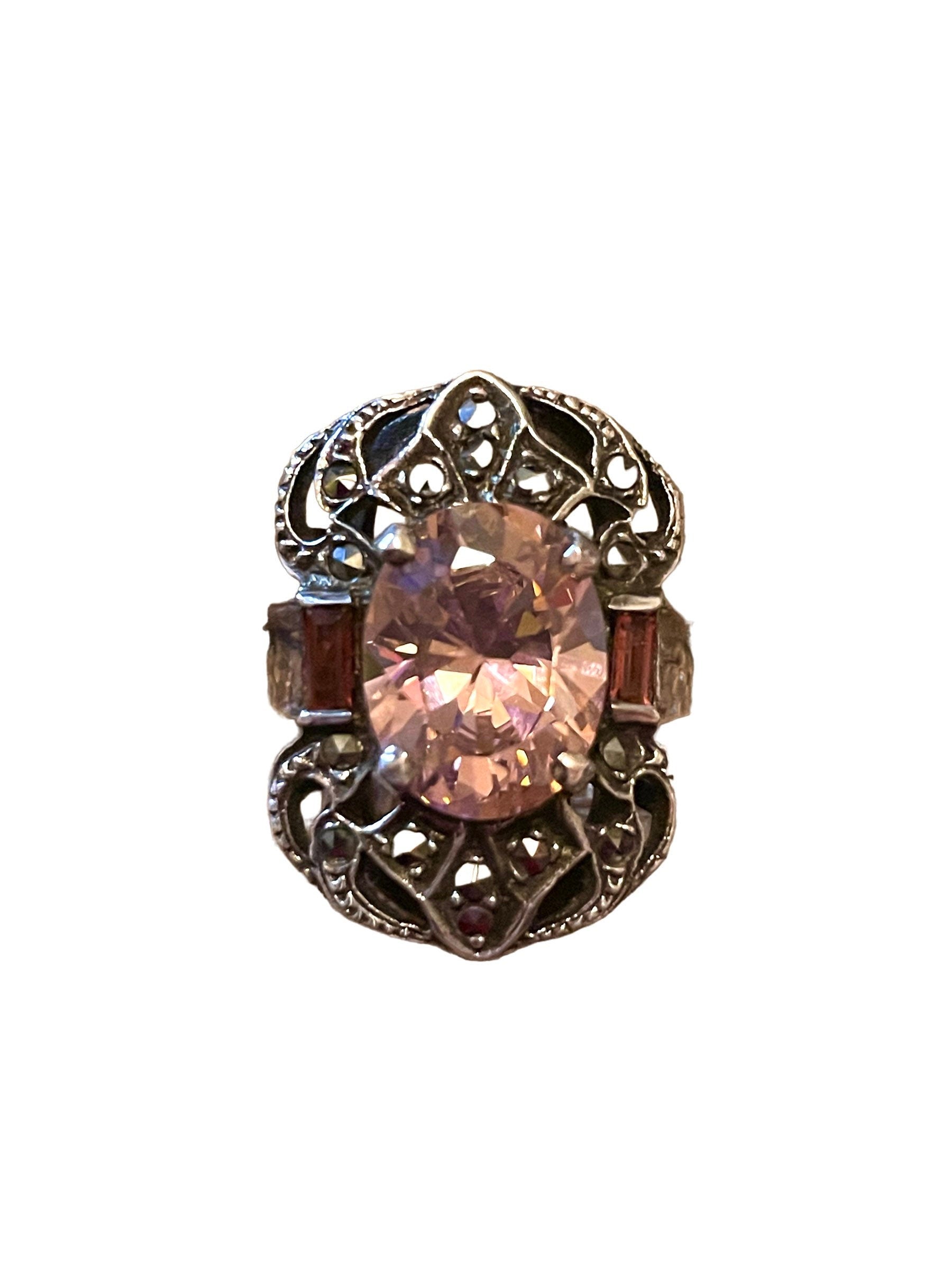 Pink Topaz & Garnet Sterling Silver Art Deco Ring with Marcasite