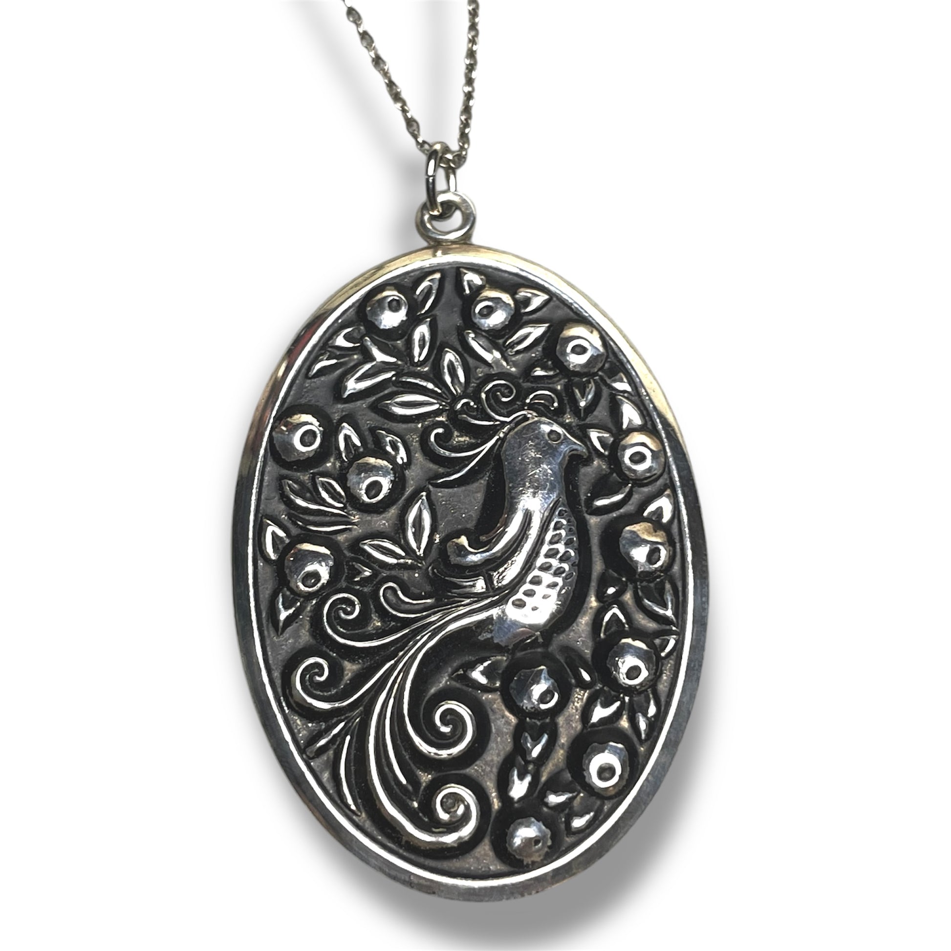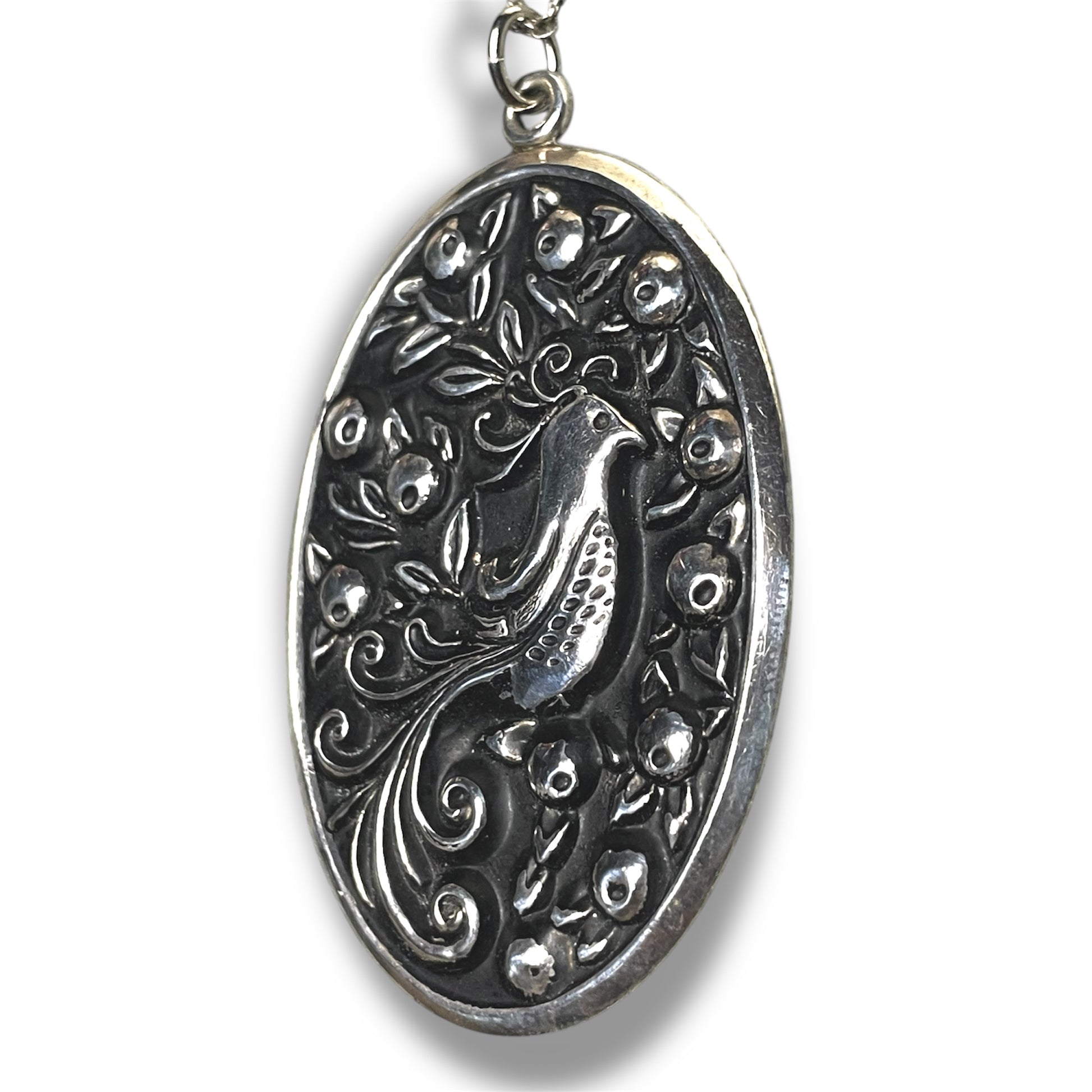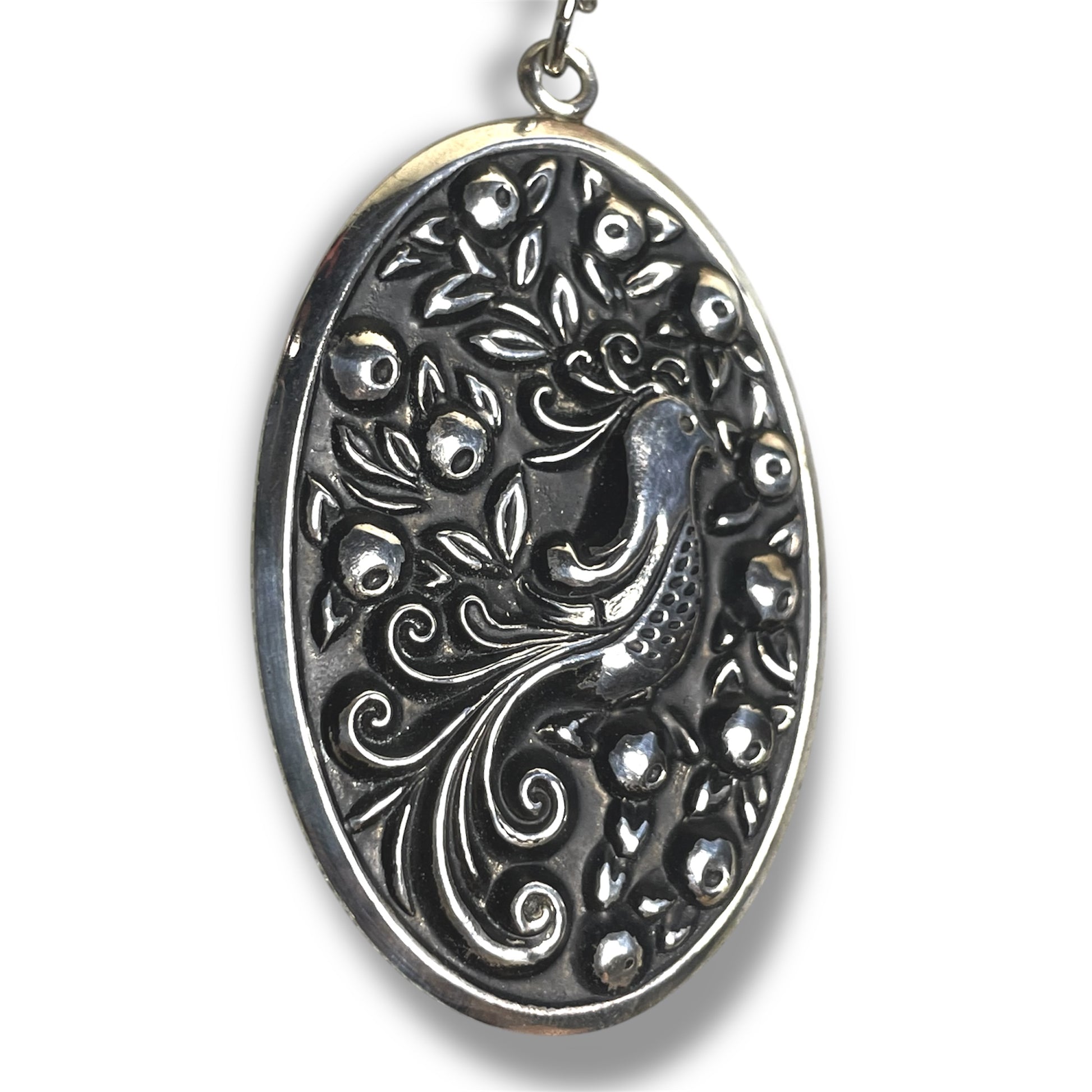Sterling Silver Repoussé Oval Peacock Bird Necklace Pendant