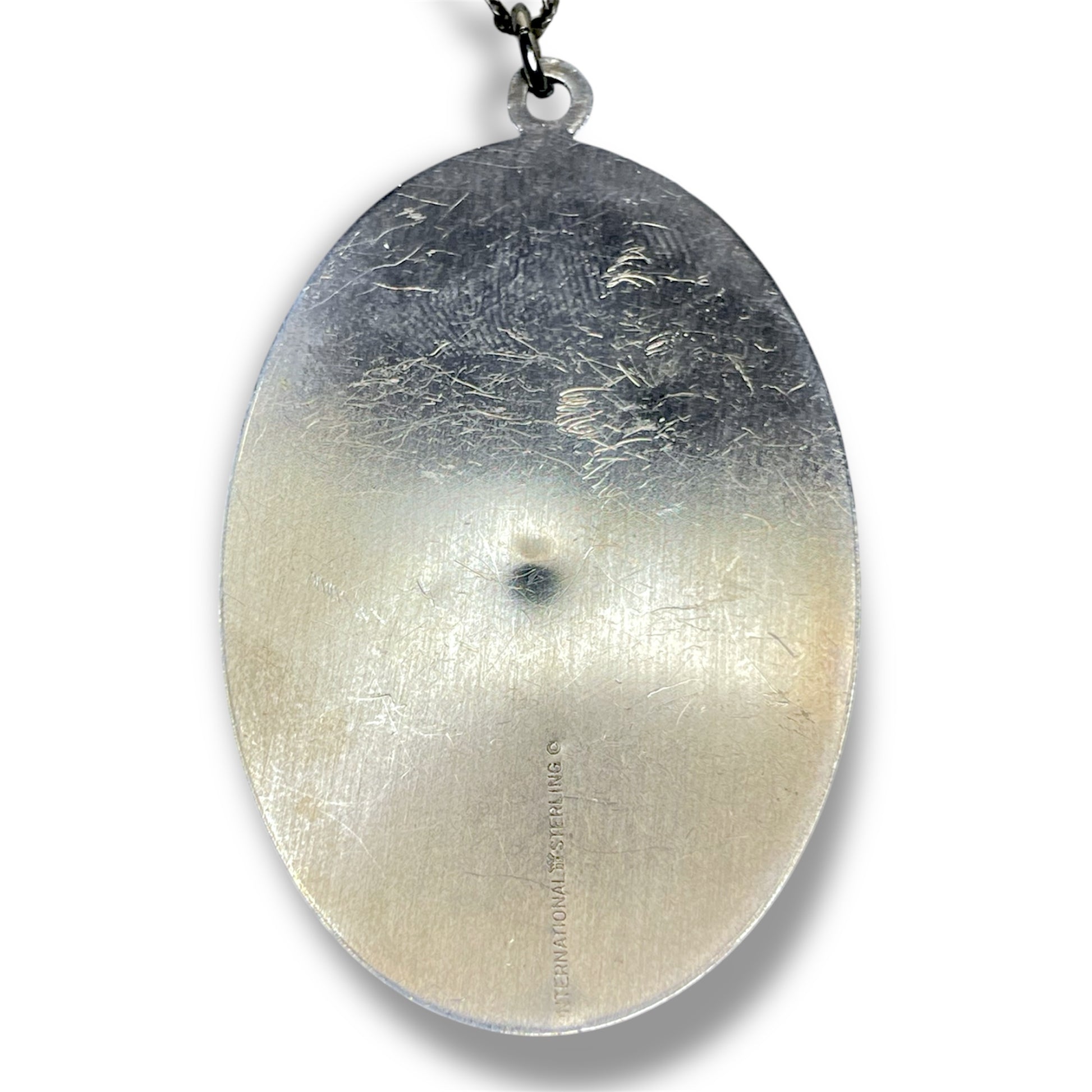 Beautiful "International Silver Co." repoussé oval shaped peacock bird necklace pendant. Measures 2.5" long. Chain not included but sterling silver chains are available upon request for an additional small charge.