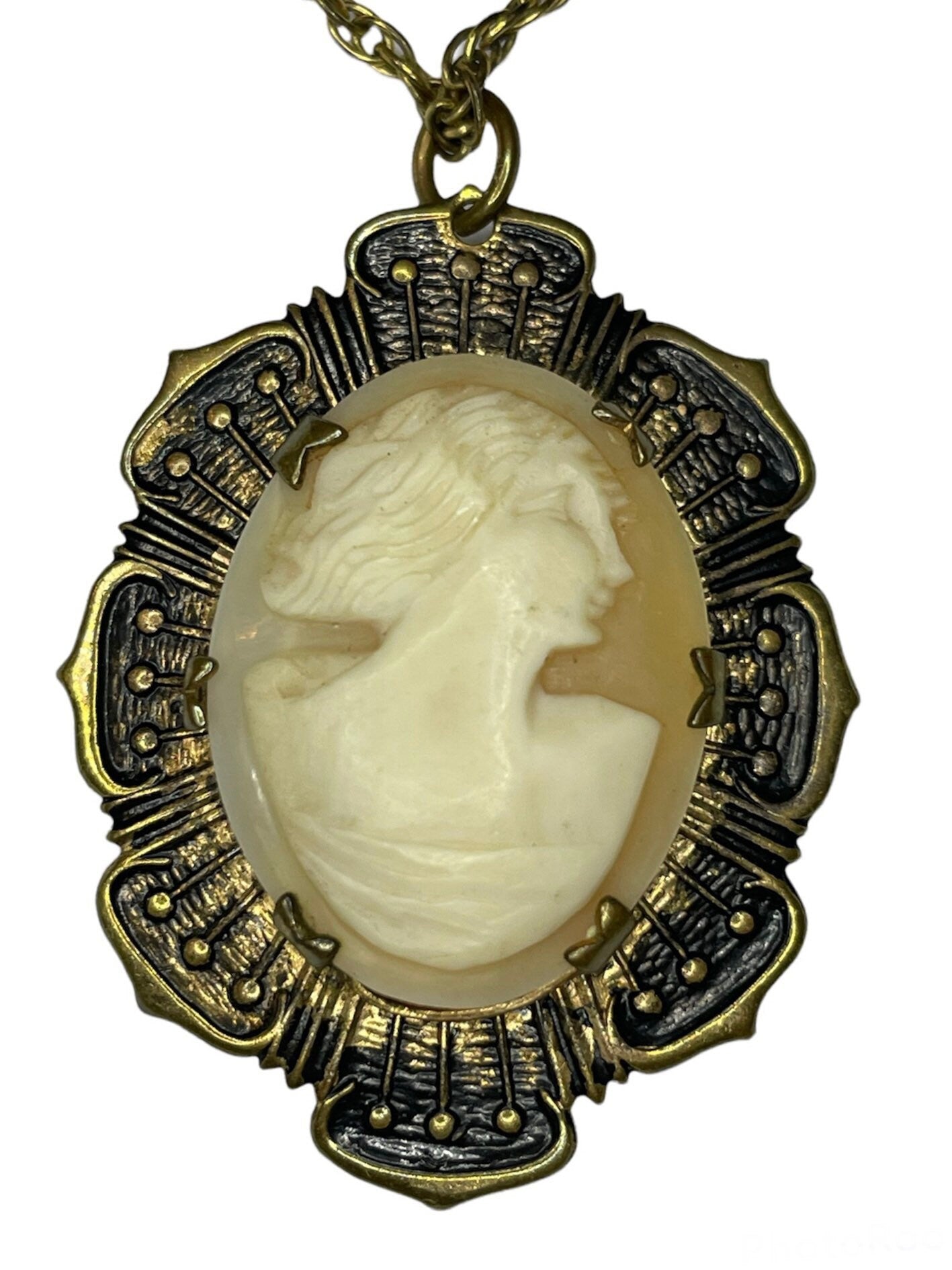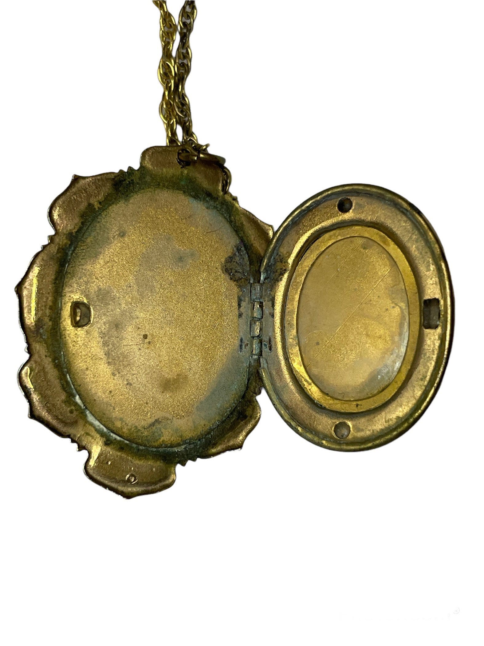 Victorian Carved Shell Cameo Gilded Locket Necklace Gorgeous gilded gold brass locket necklace with a prong set carved shell cameo necklace. Amazing condition.