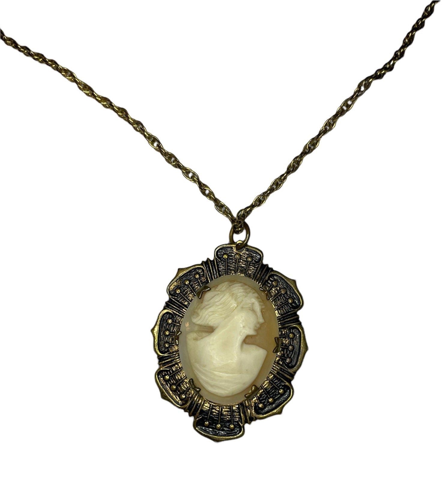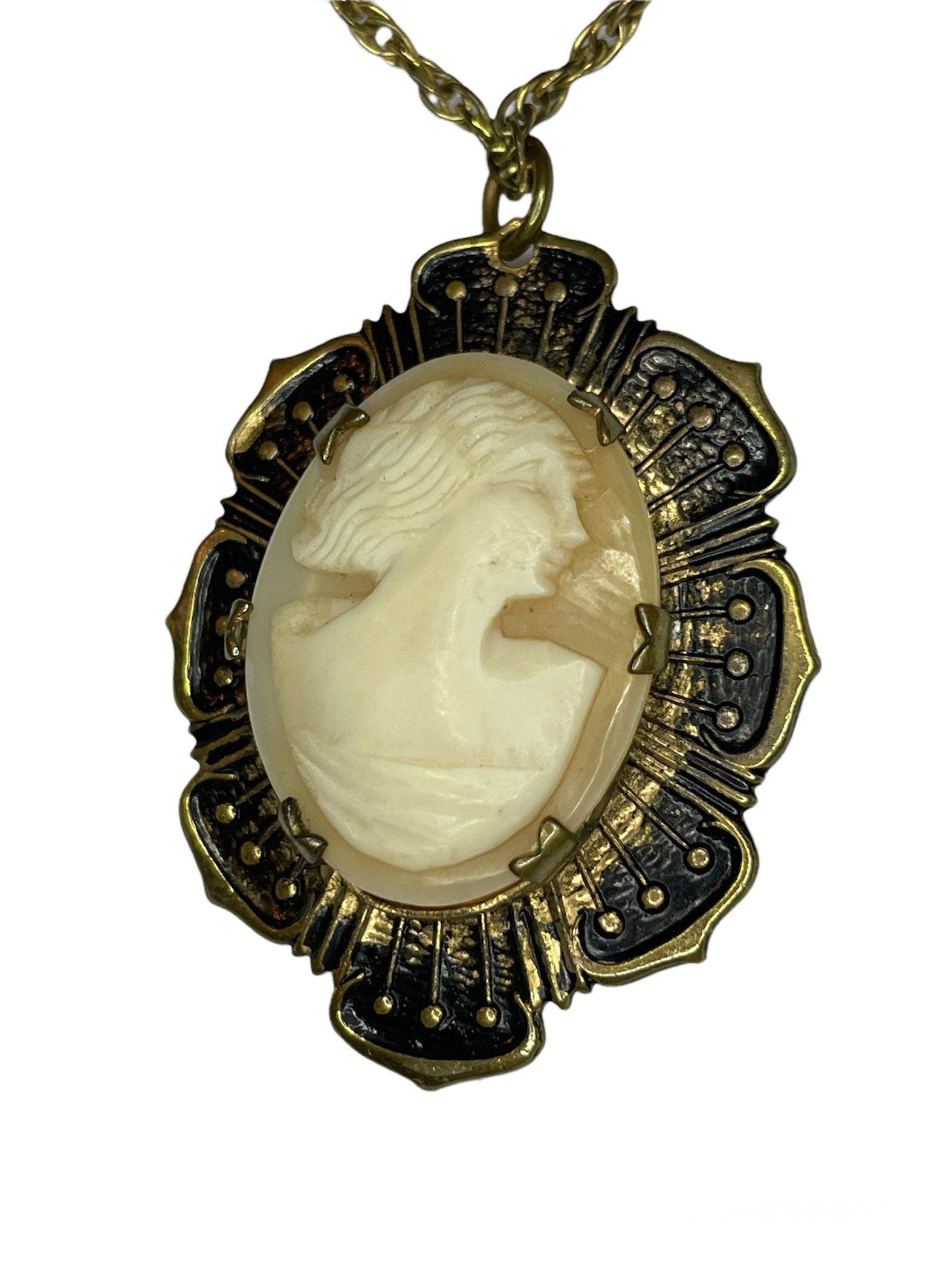Victorian Carved Shell Cameo Gilded Locket Necklace