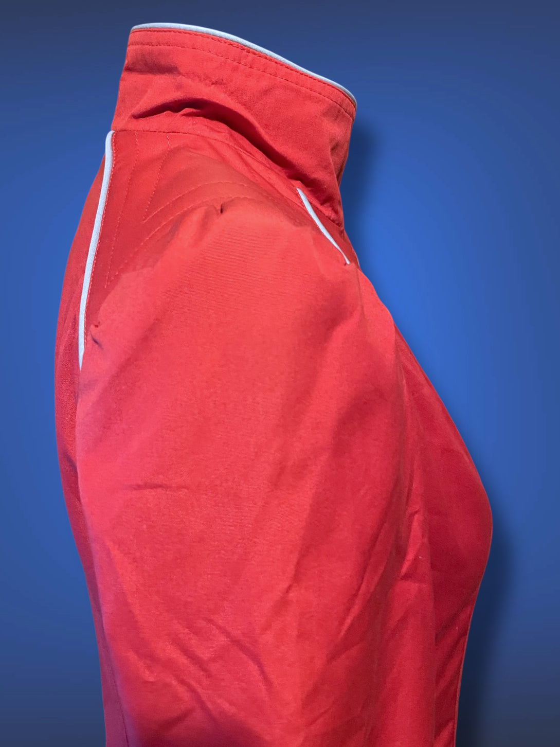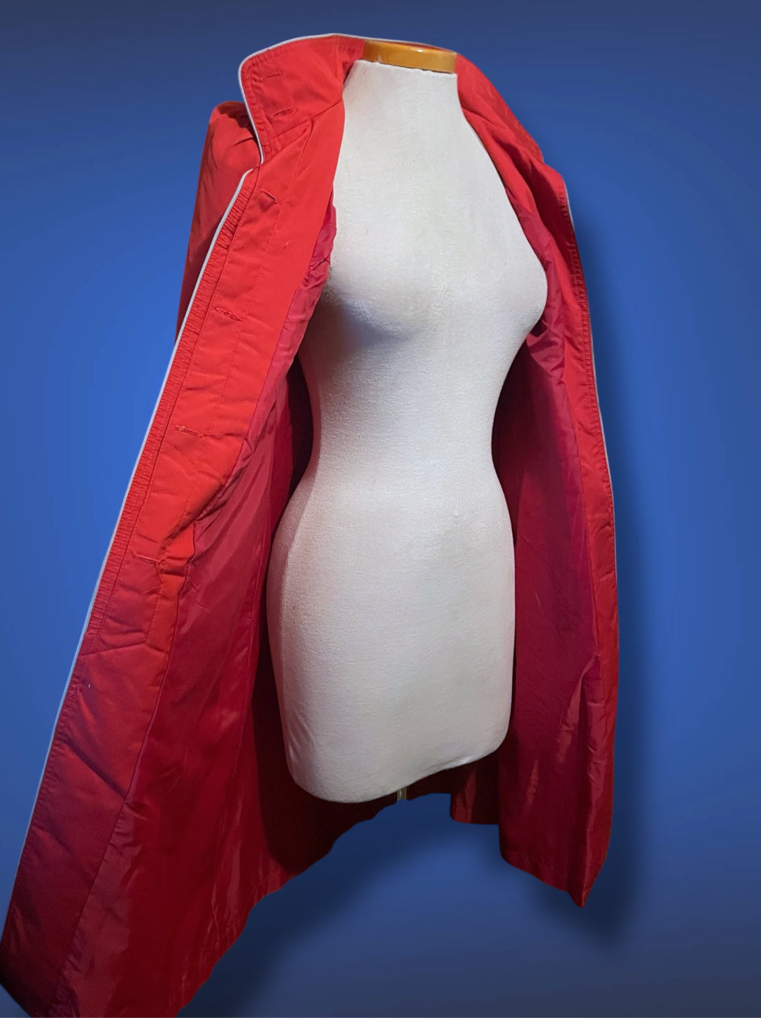 Super mod vintage 1970’s magenta pink long trench coat with light grey piping. Has a changeable collar with either button up turtleneck style or folded down lapel style. Fully inner lined with a matching magenta pink liner. Button up front with pink buttons that match the pink buttons on the collar and cuffs along with the grey piping. Designer label reads “Karizma Canadian Soortswear LTD.” The size tag reads Size 6.