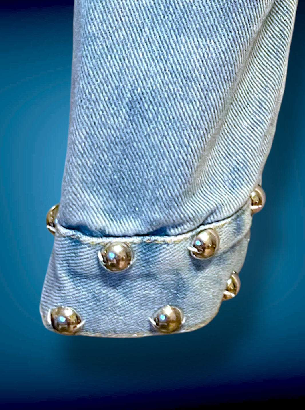 Vintage 1980’s Rainbow Jewel Crystal Stone Encrusted & Metal Rivet Crop Distressed Jean Jacket