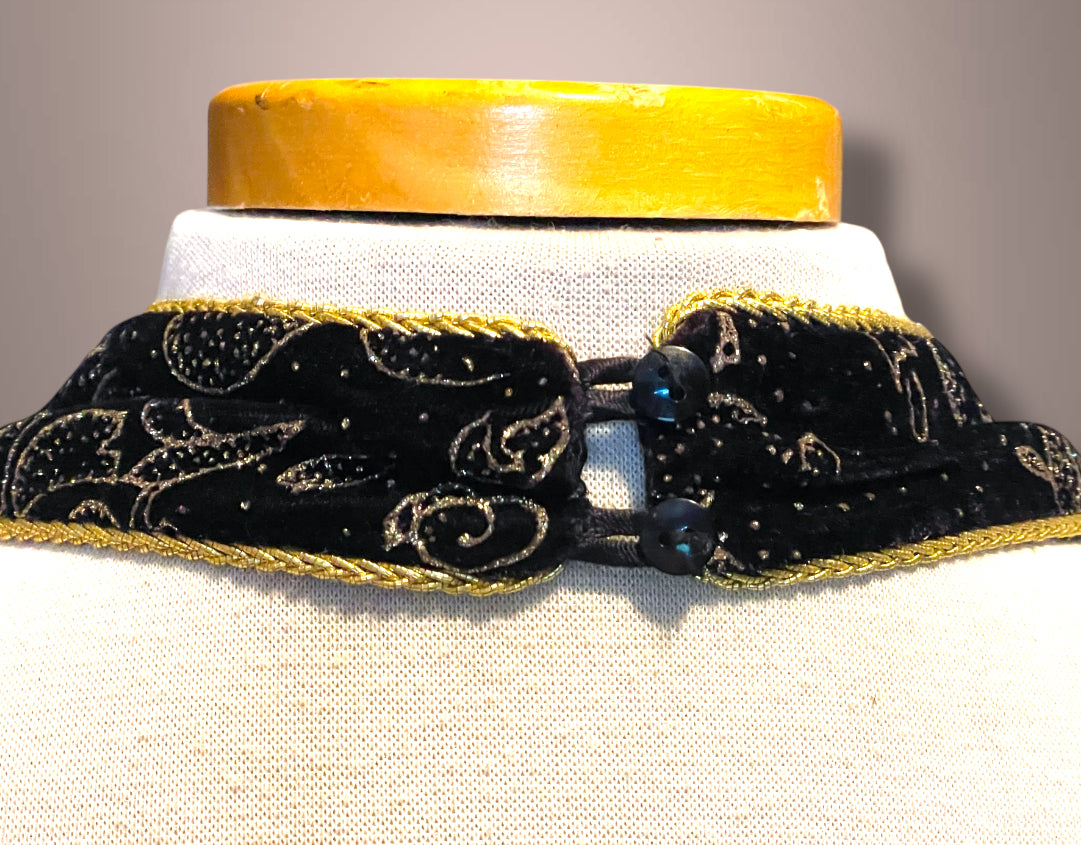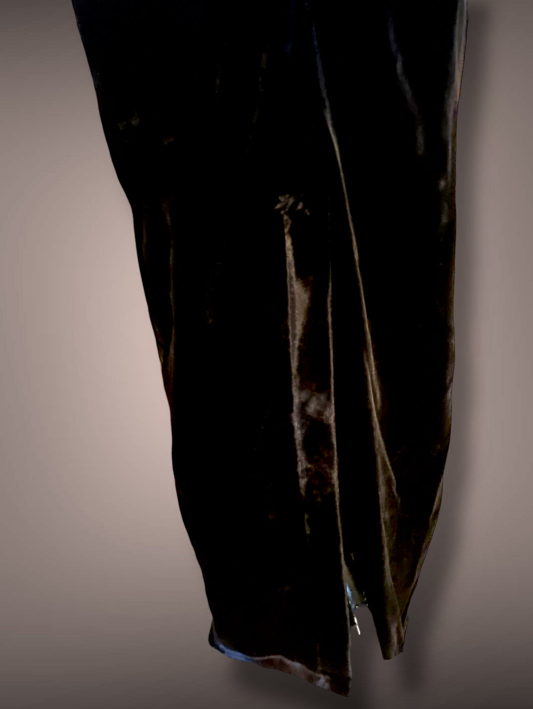 This is an elegant and beautiful vintage 1990’s Scott McLintock designer long black velvet maxi dress with a slit pencil skirt bottom and a corset style flared hip halter style top with gold glitter raised damask pattern and two decorative gold buttons on the waist with 3 hanging gold chains.  No damage or condition issues anywhere, in amazing condition.  Two decorative buttons at the neck of the halter as well as a gold rope style edging detail around the bust to the back where there is a hidden zipper down the back as well as a hook and eye closure.