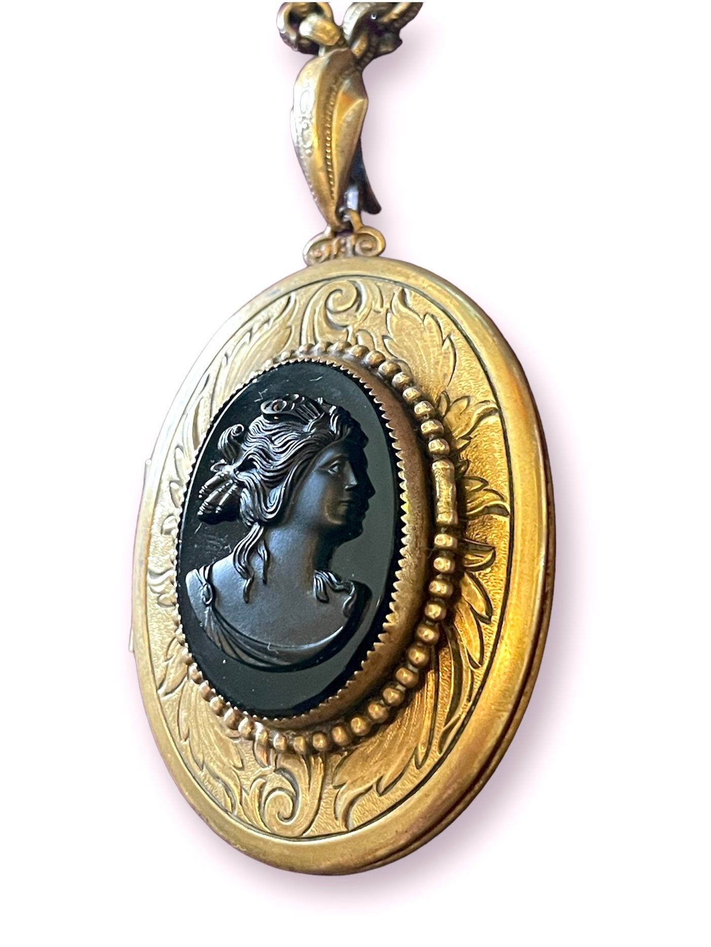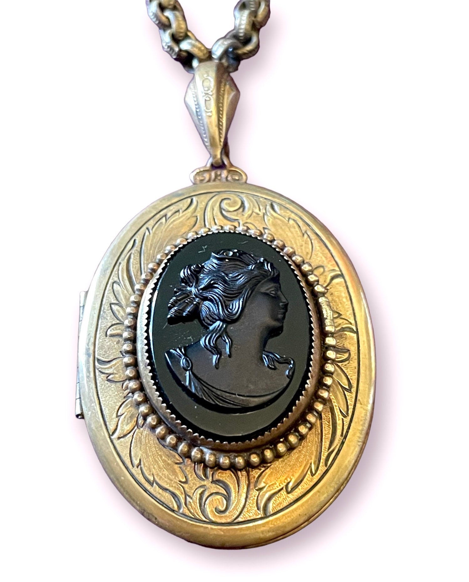 Vintage Brass Engraved Black Glass Mourning Cameo Locket