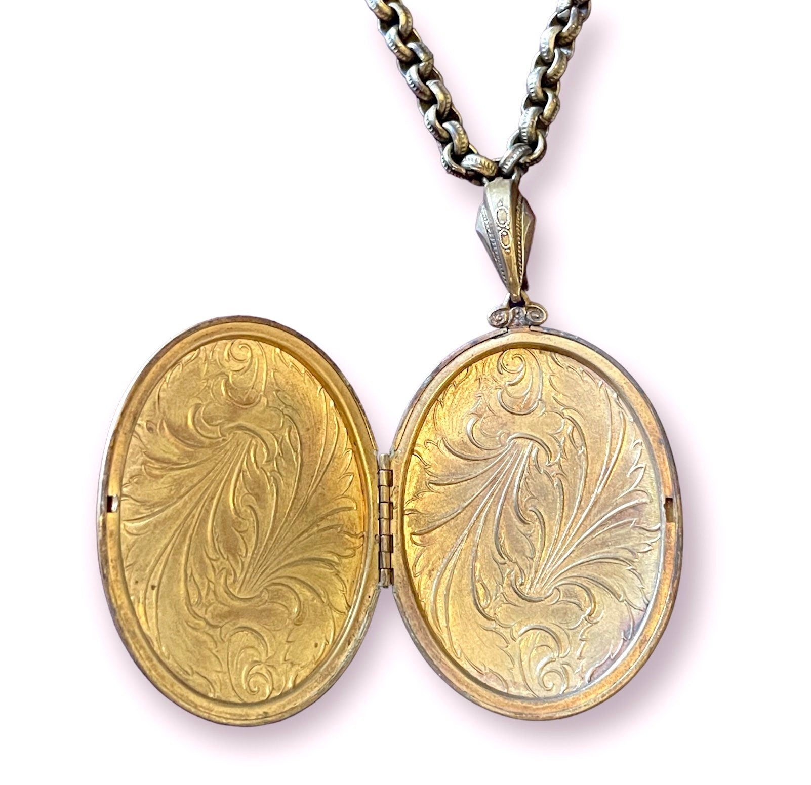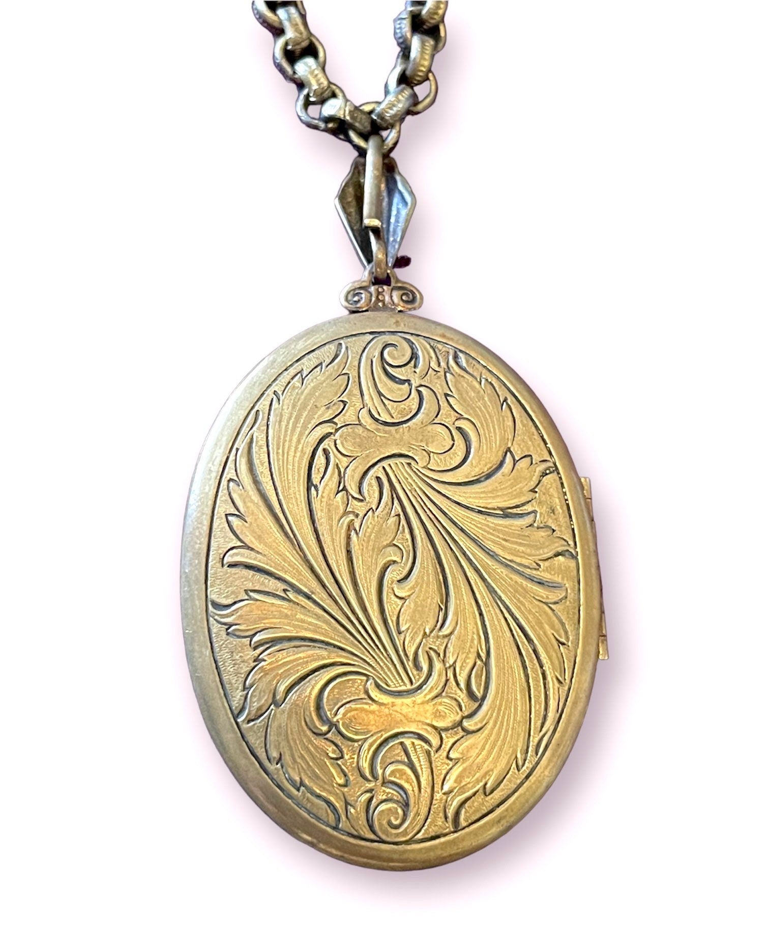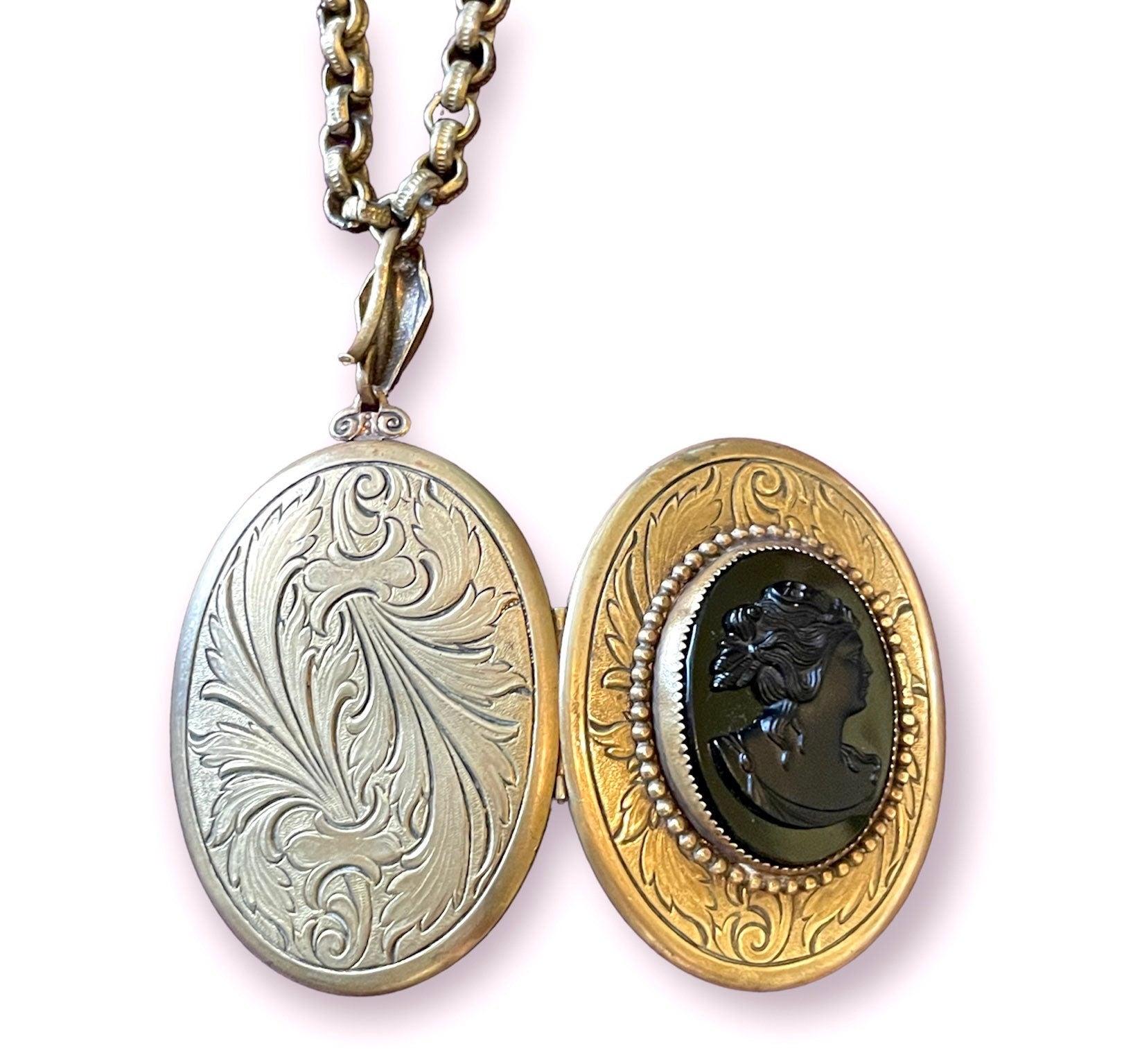 cameo locket measures 3” long including engraved bail and 1 3/4” wide